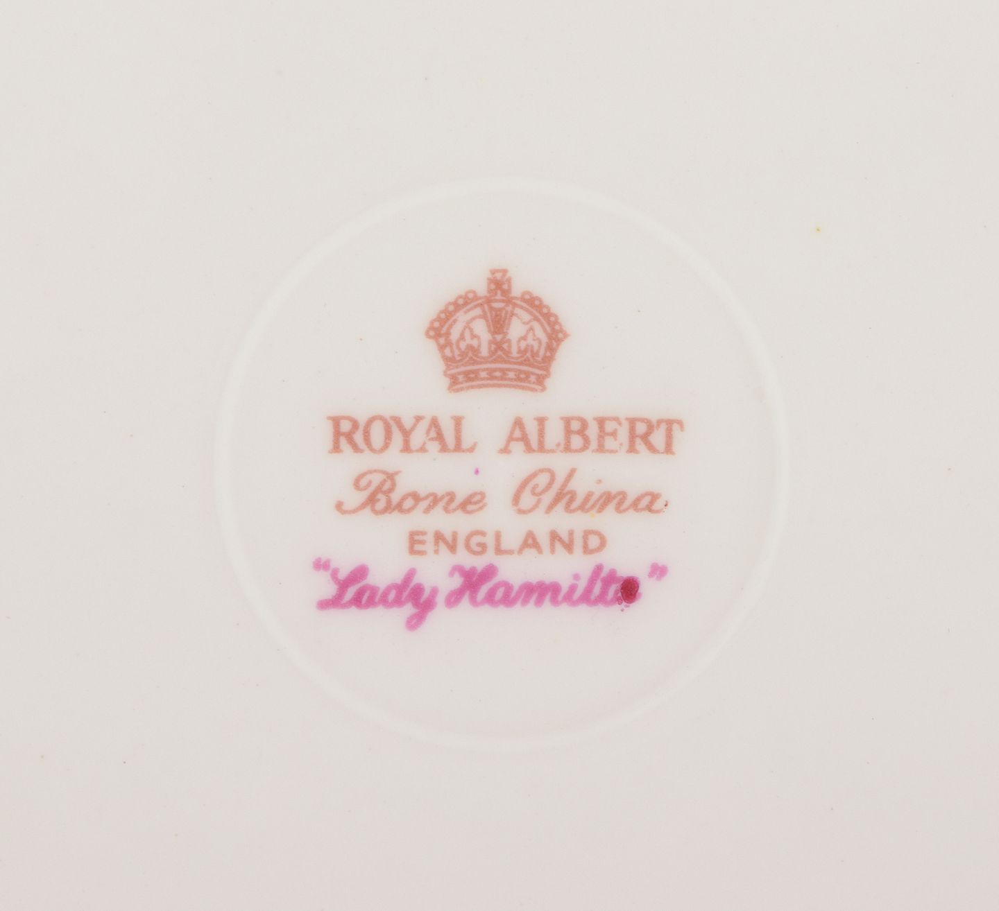 Royal Albert, England. Et sæt på seks ”Lady Hamilton” tallerkner med polykrome blomstermotiver. Gulddekoration. Ca. 1930’erne. Stemplet. I perfekt stand. Mål: D 15,5 cm.