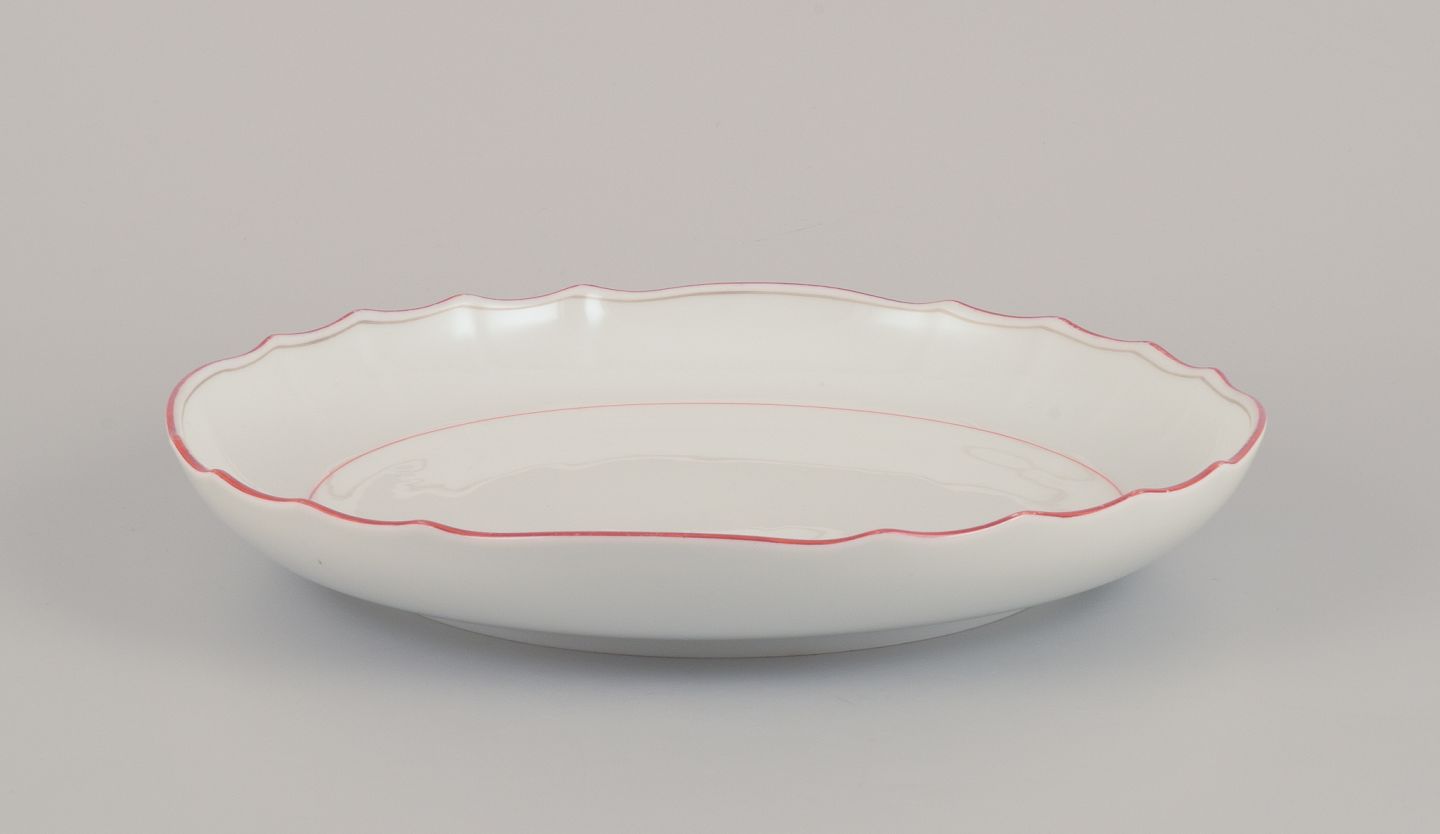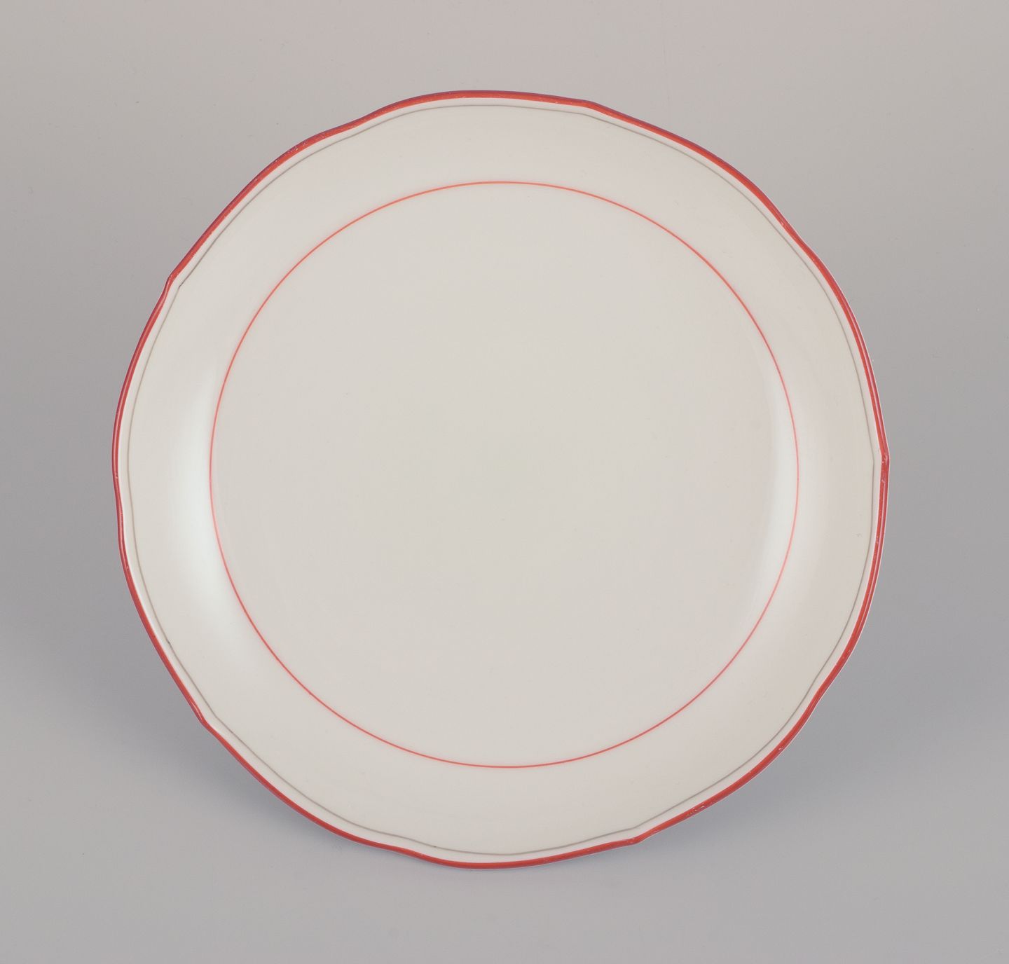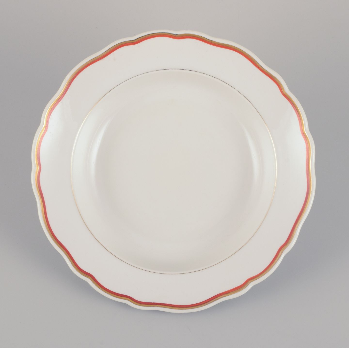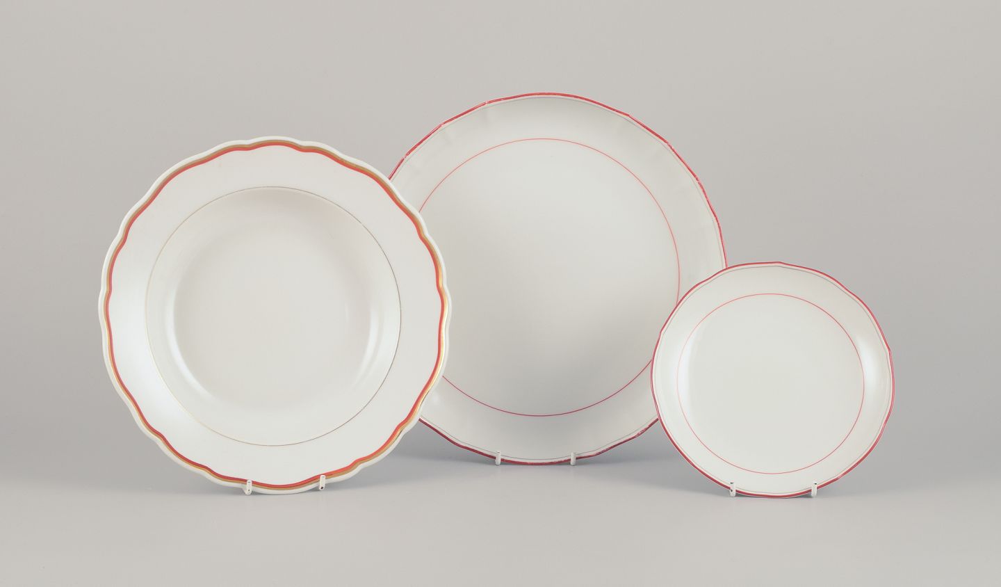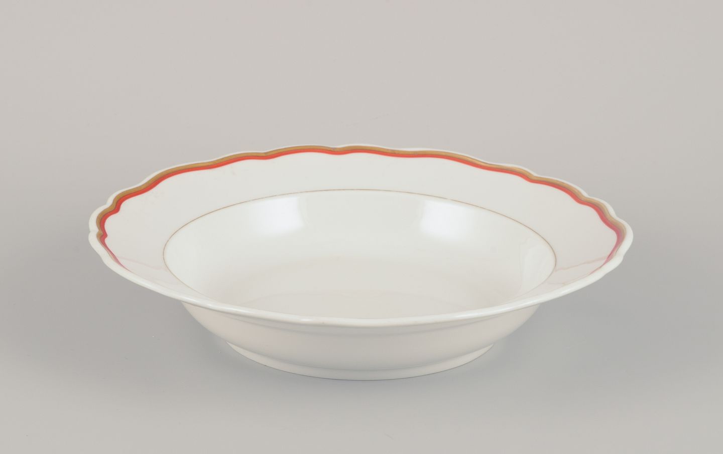 Meissen, Tyskland. Tre dele porcelæn bestående af en stor skål, en dyb tallerken og en tallerken. Dekoreret med koralrød og guldfarvet kant.