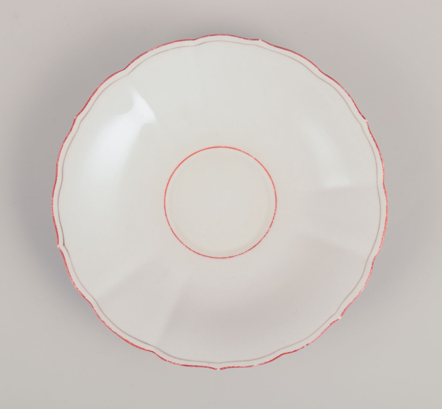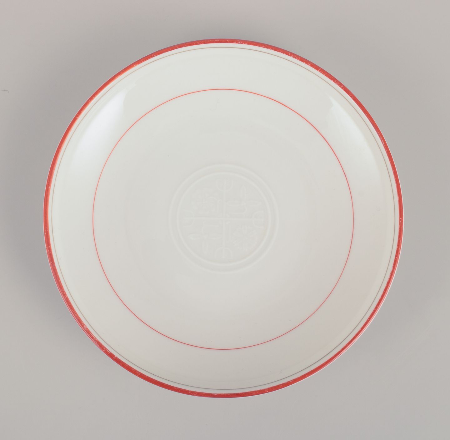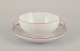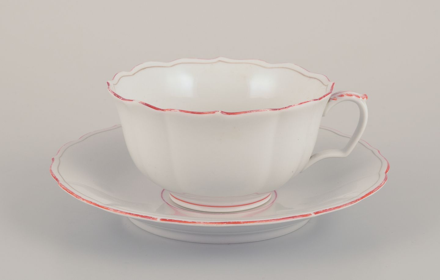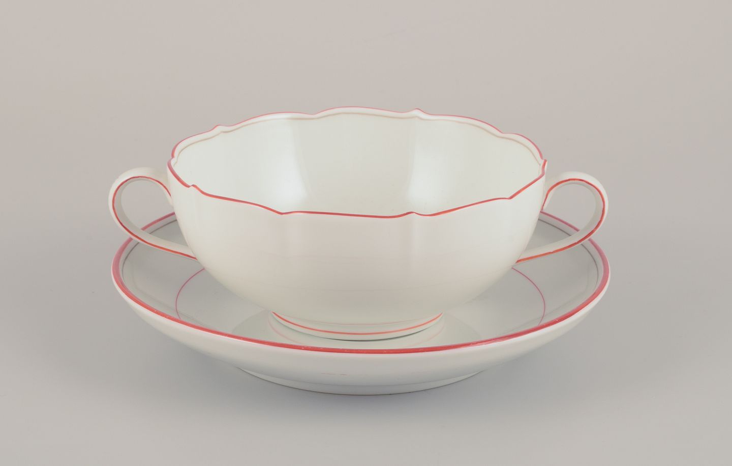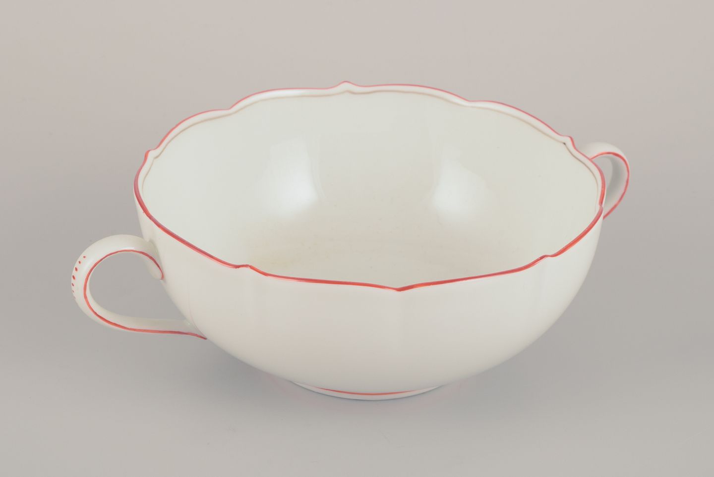 Meissen, Tyskland. Tekop og bouillonkop med underkopper. Dekoreret med koralrød og guld farvet kant. Art Deco.