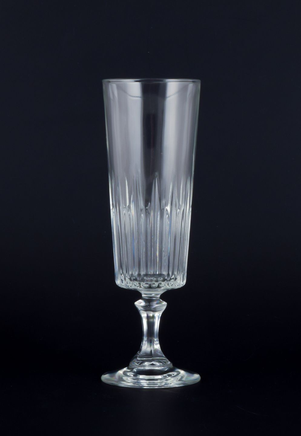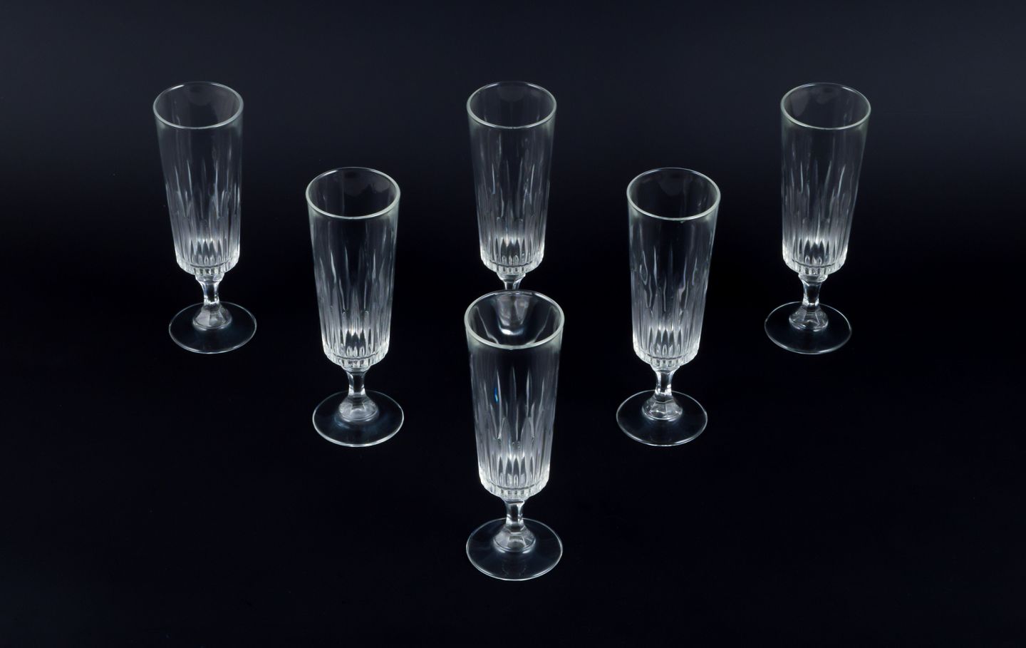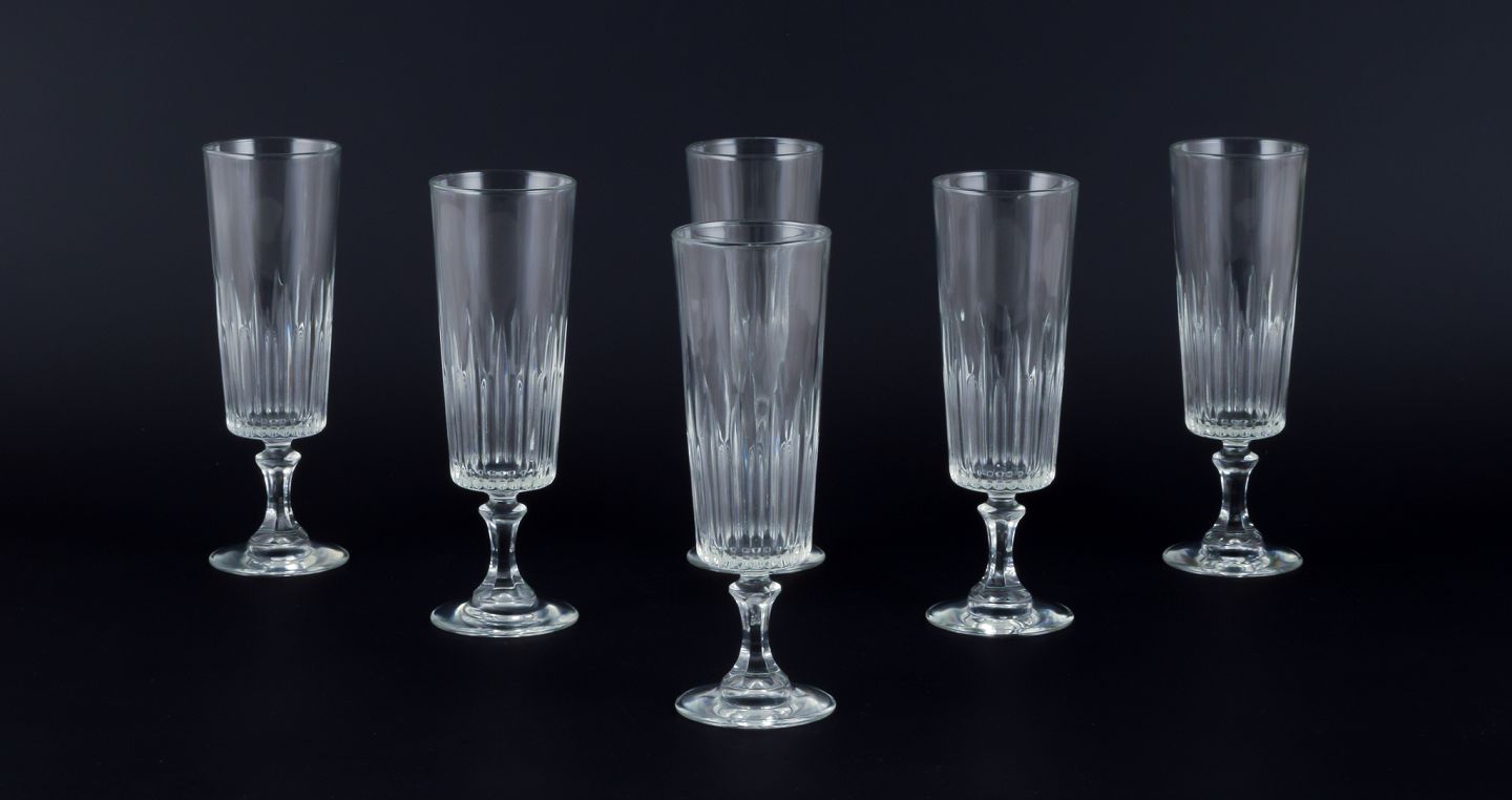 Et sæt på seks svenske champagnefløjter i klart glas. Facetslebet. Ca. 1930’erne. Perfekt stand. Mål: H 17,0 cm. x D 5,5 cm.