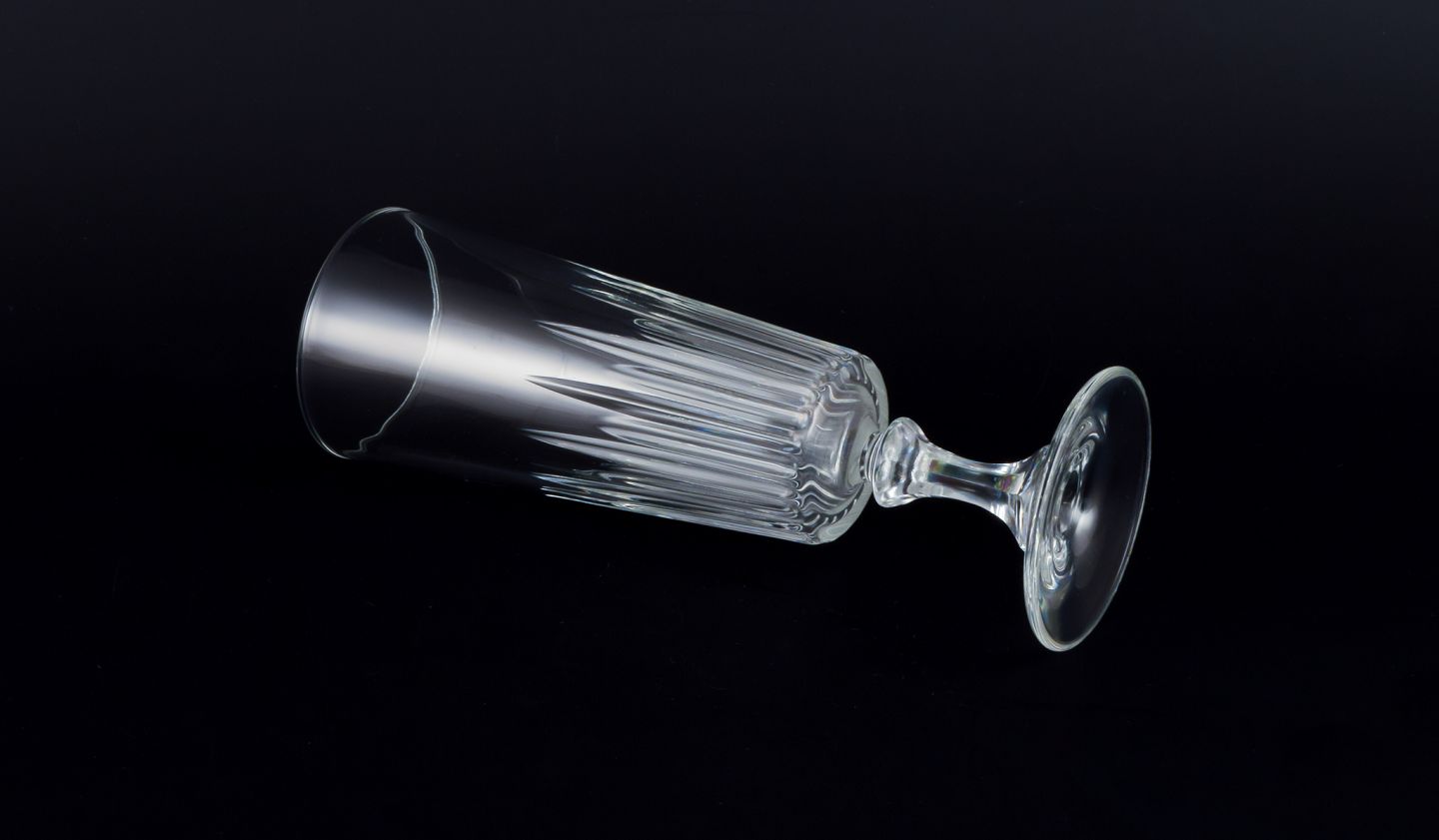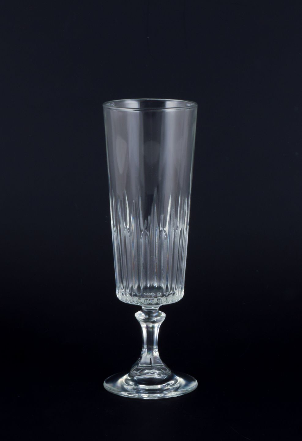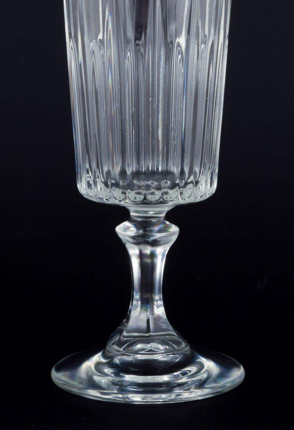Et sæt på seks svenske champagnefløjter i klart glas. Facetslebet. Ca. 1930’erne. Perfekt stand. Mål: H 17,0 cm. x D 5,5 cm.