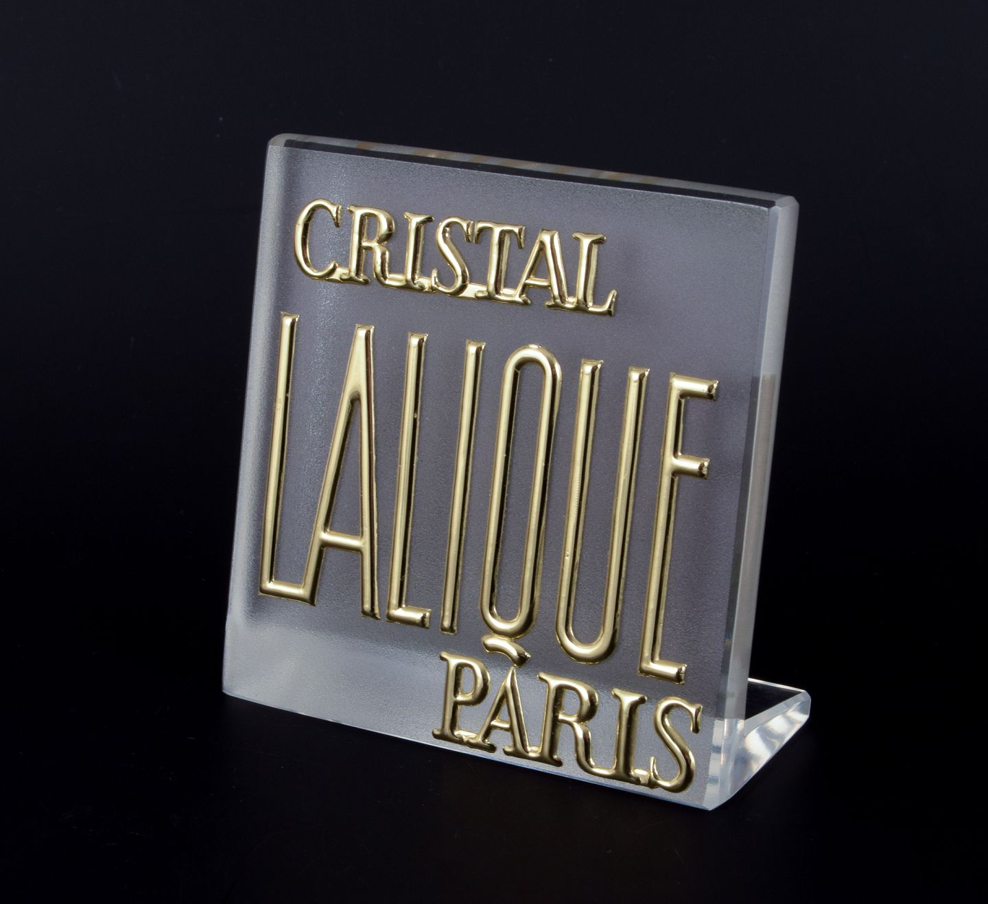 René Lalique (1860-1945), Frankrig. Udstillingsskilt/butiksskilt i delvist matteret glas. Tekst i guld. 1970/80’erne. Perfekt stand. Mĺl: B 9,5 cm. x H 9,5 cm. D 4.5 cm.