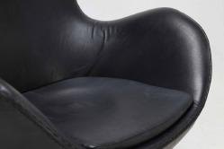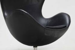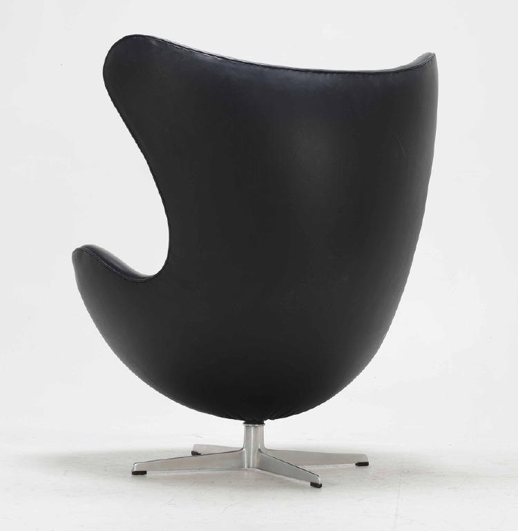 Arne Jacobsen 1902 – 1971. ‘Ægget’. Hvilestol, polstret med sort læder, drejelig midtersøjle med firpasfod af aluminium.