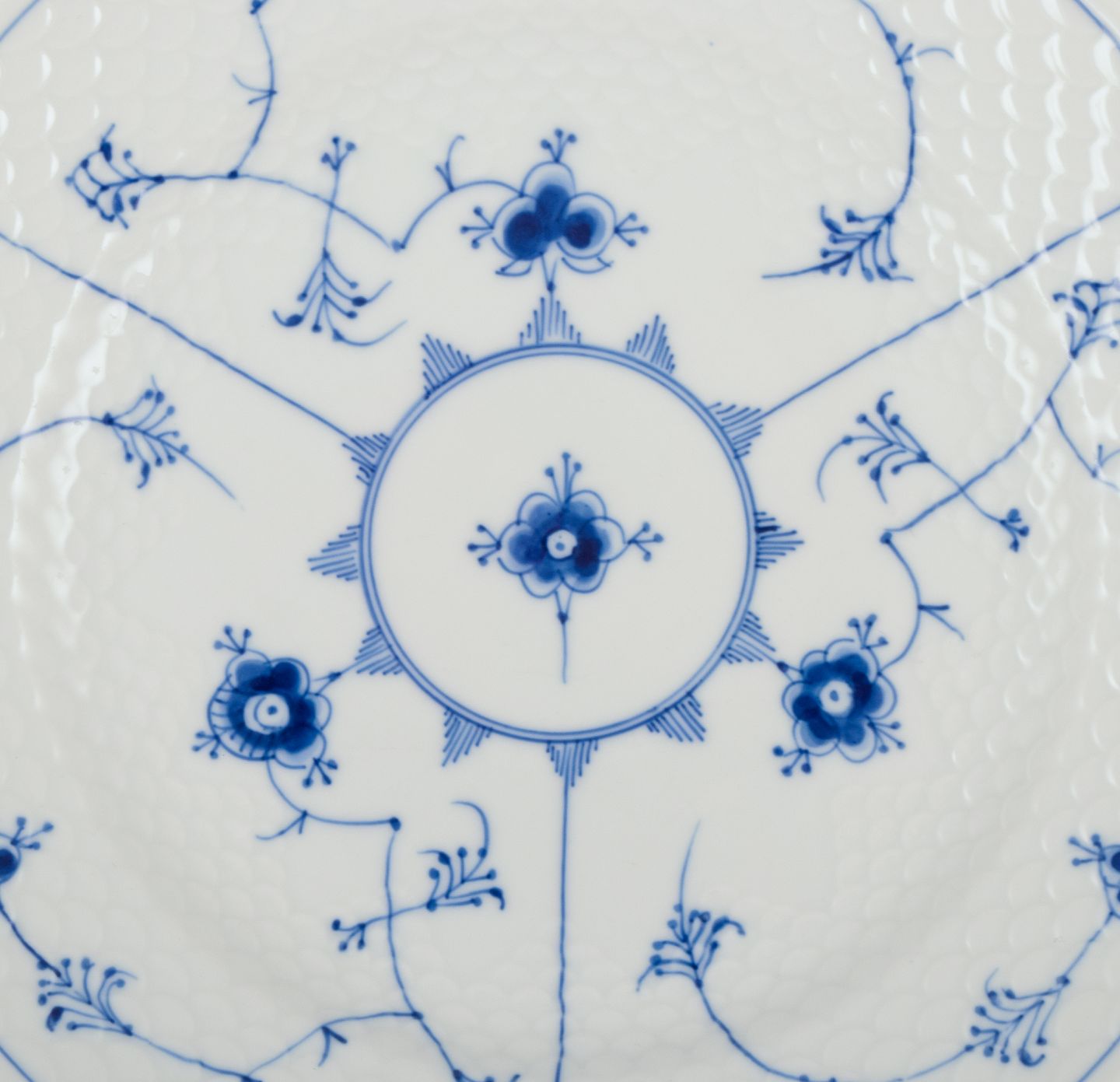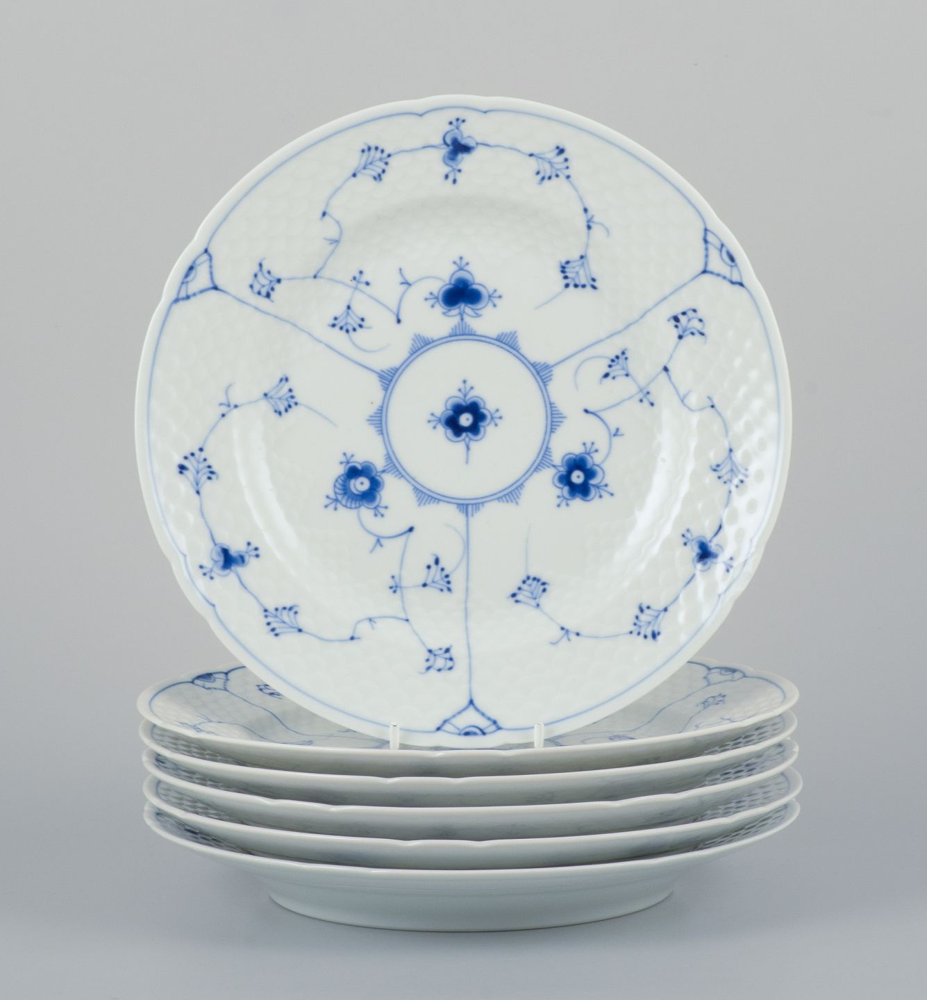 Bing og Grøndahl Musselmalet. Et sæt på seks middagstallerkner i porcelæn. Model: 25 Ca. 1930’erne. Anden sortering. Perfekt stand. Stemplet. Mål: 24,5 cm.