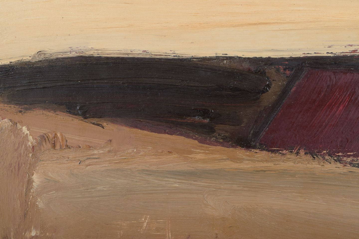 Peder Brøndum Sørensen (1931-2003), dansk maler, olie på lærred. Modernistisk landskab med hus og marker. 1970’erne Signeret. I perfekt stand. Mål: 51,0 cm. x 41,0 cm. Total: 69,5 cm. x 59,5 cm.