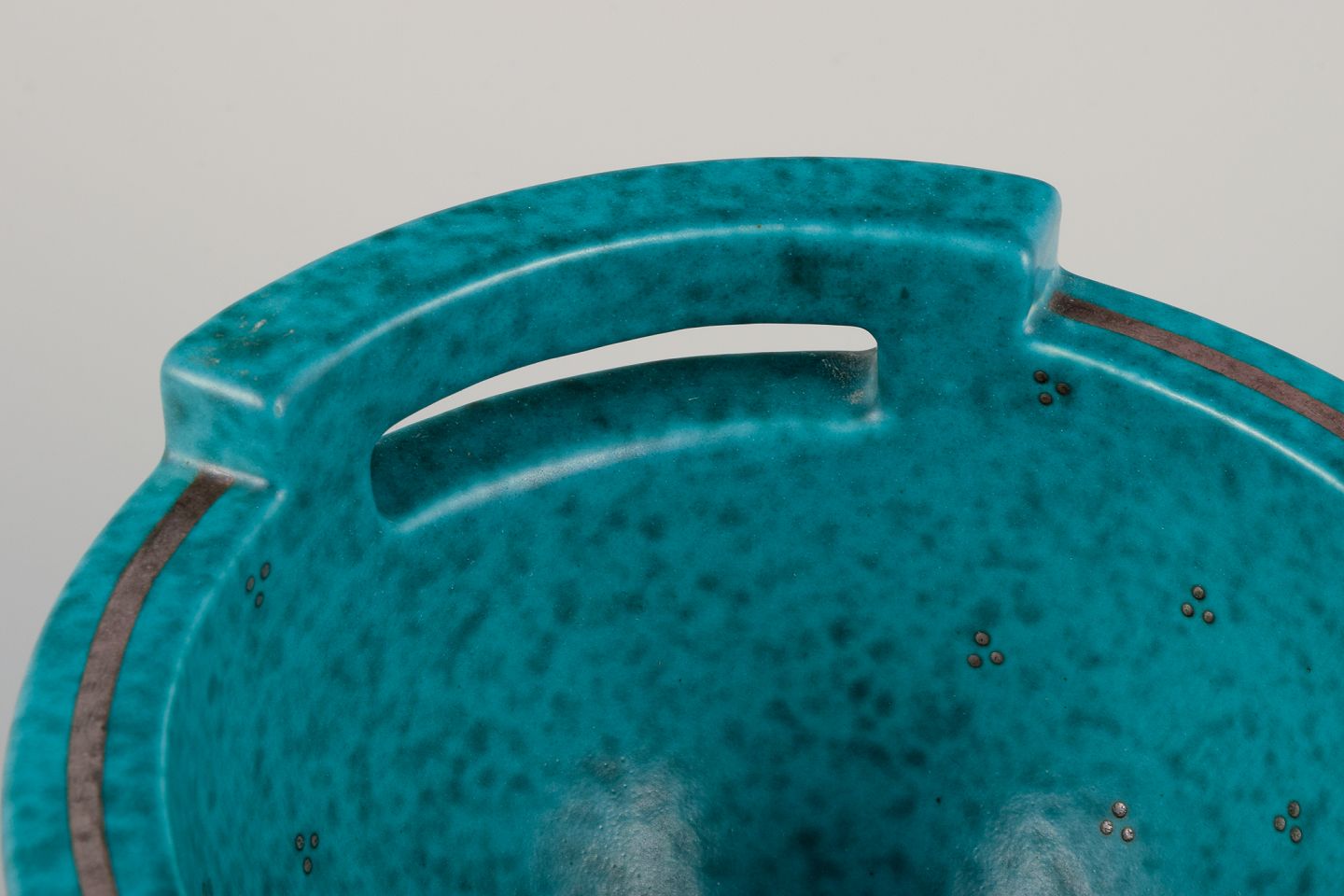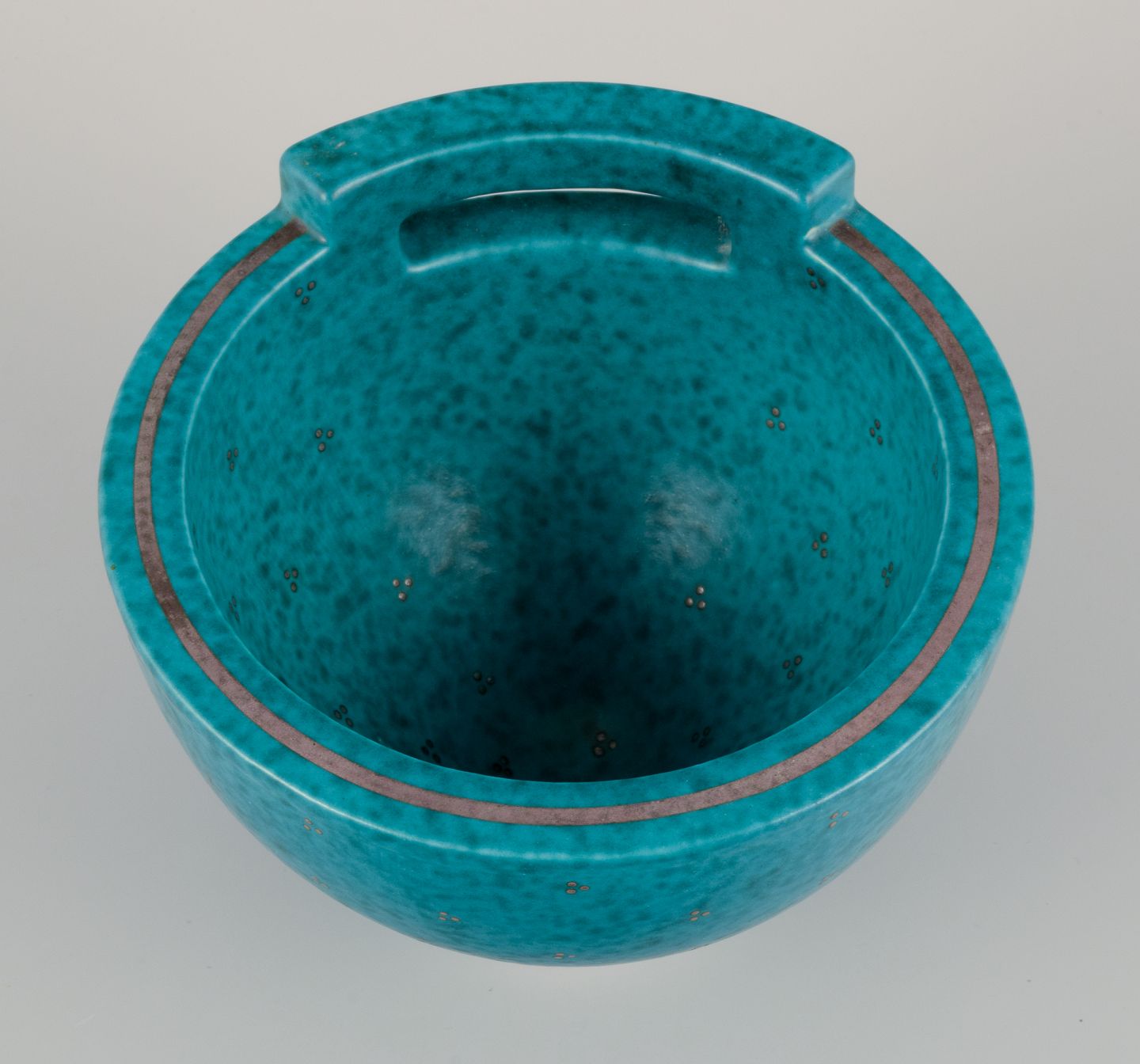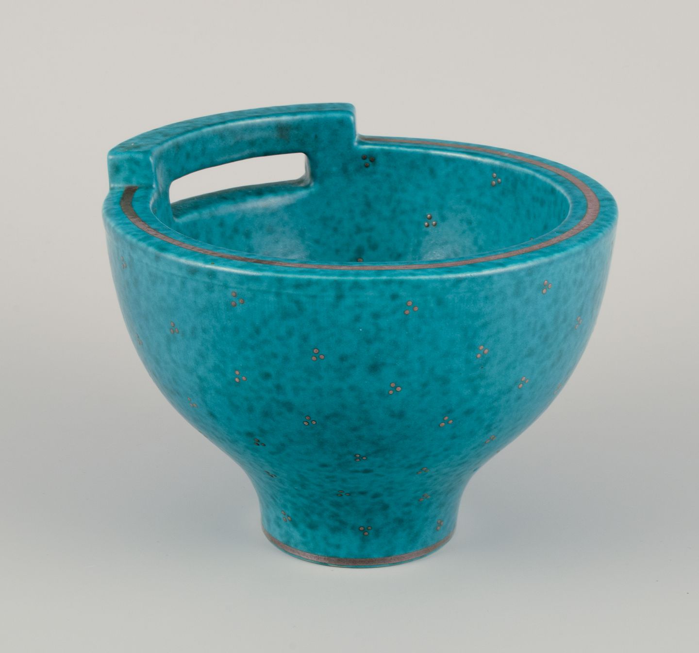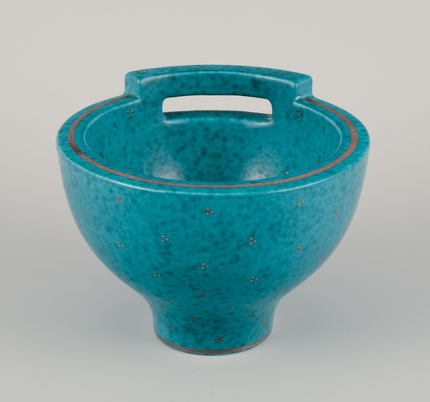 Wilhelm Kåge (1889-1960) for Gustavsberg. Large bowl with handle from the "Argenta" series. Glaze in green tones. Silver inlays. Rare shape.