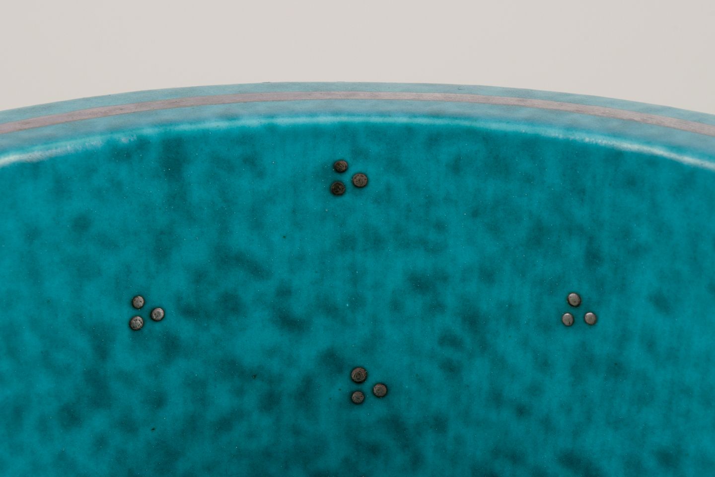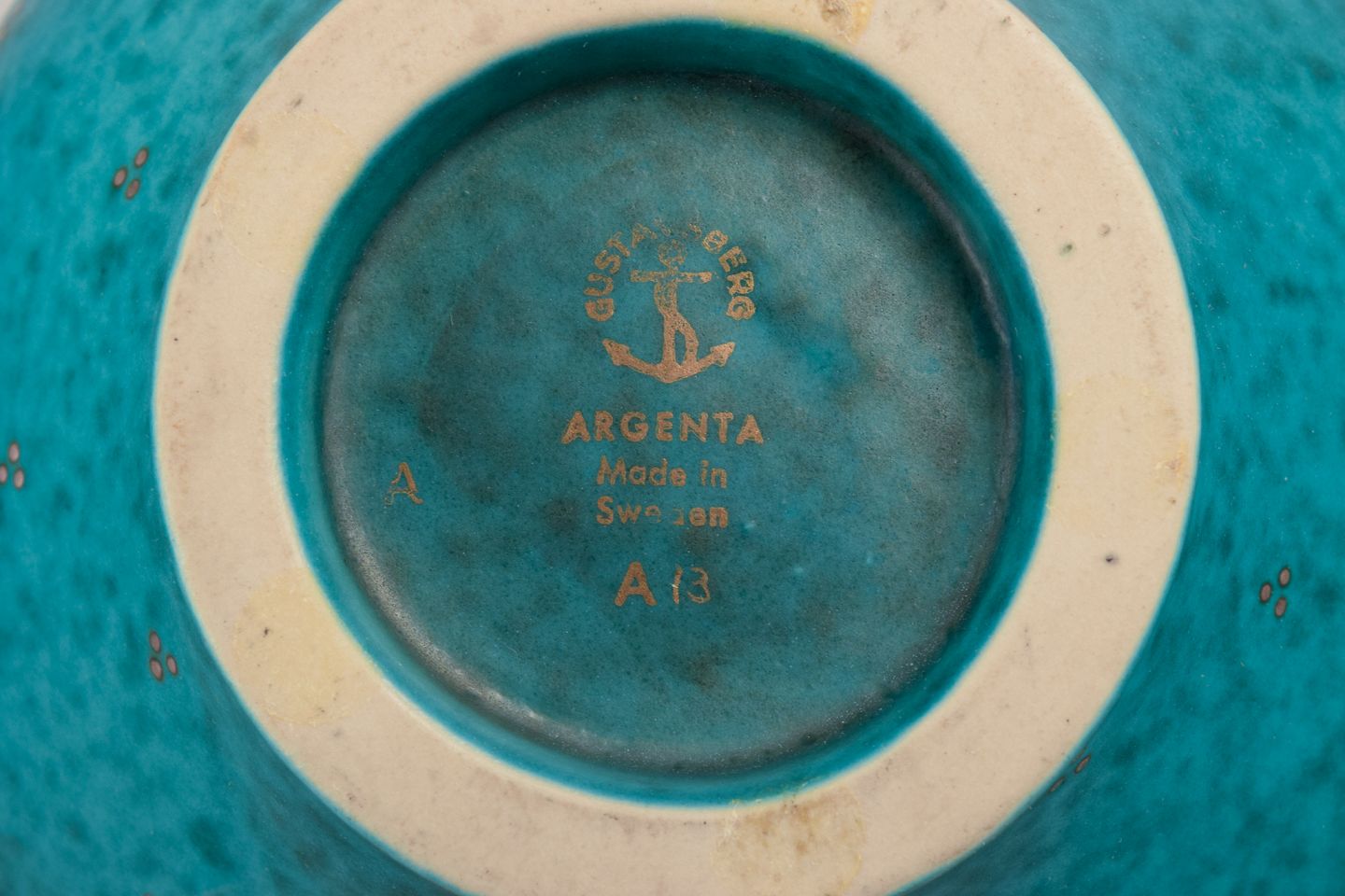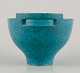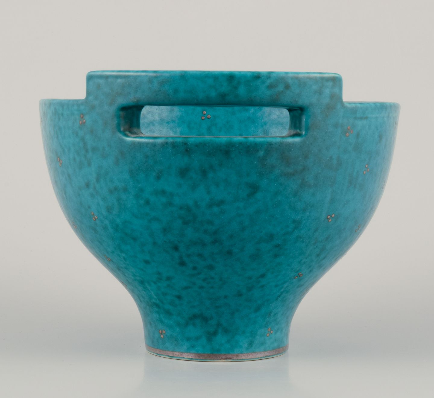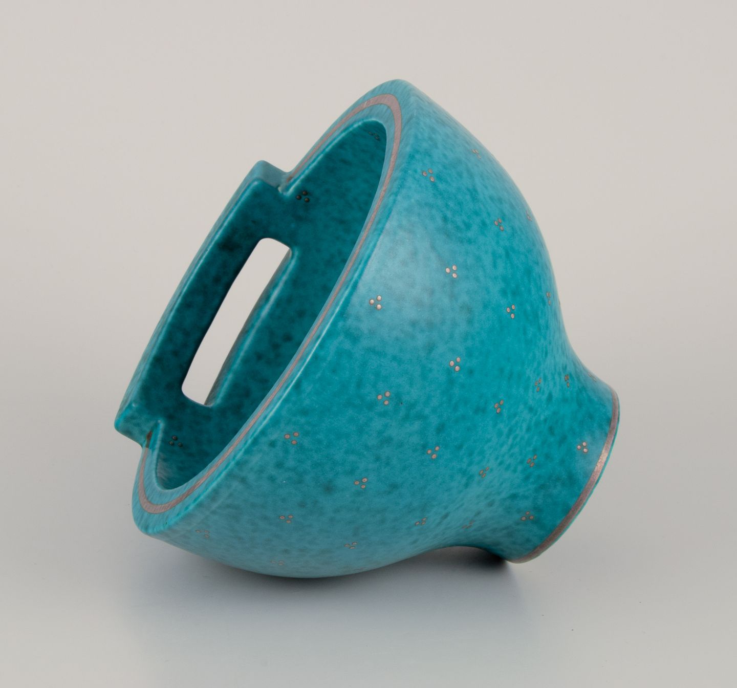 Wilhelm Kåge (1889-1960) for Gustavsberg. Large bowl with handle from the "Argenta" series. Glaze in green tones. Silver inlays. Rare shape.
