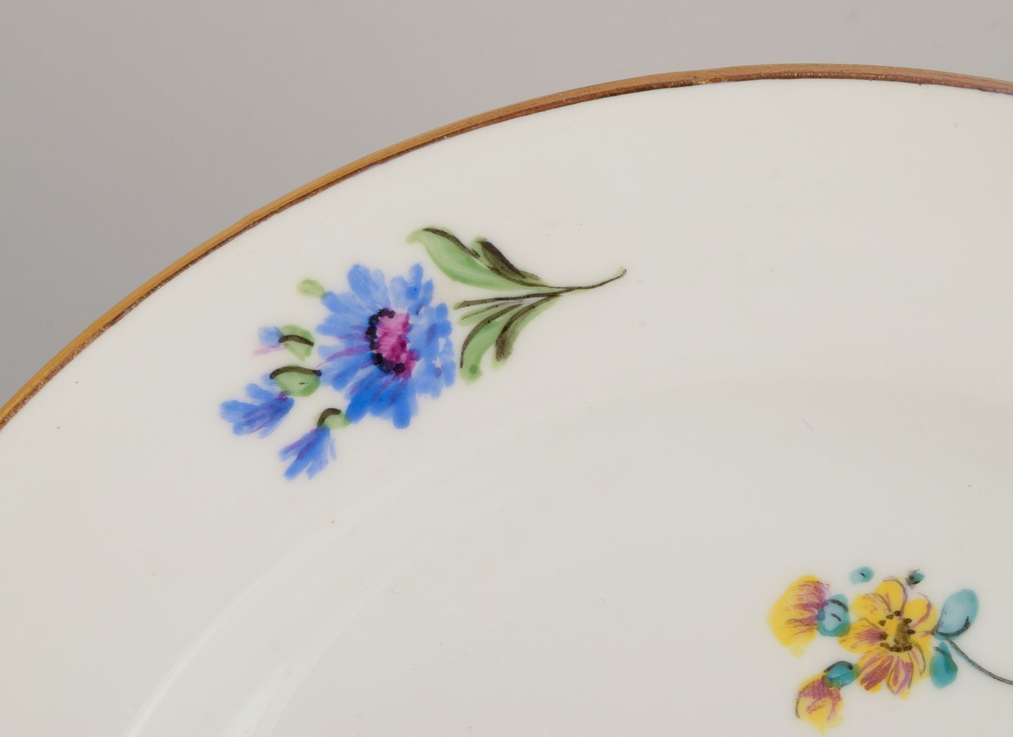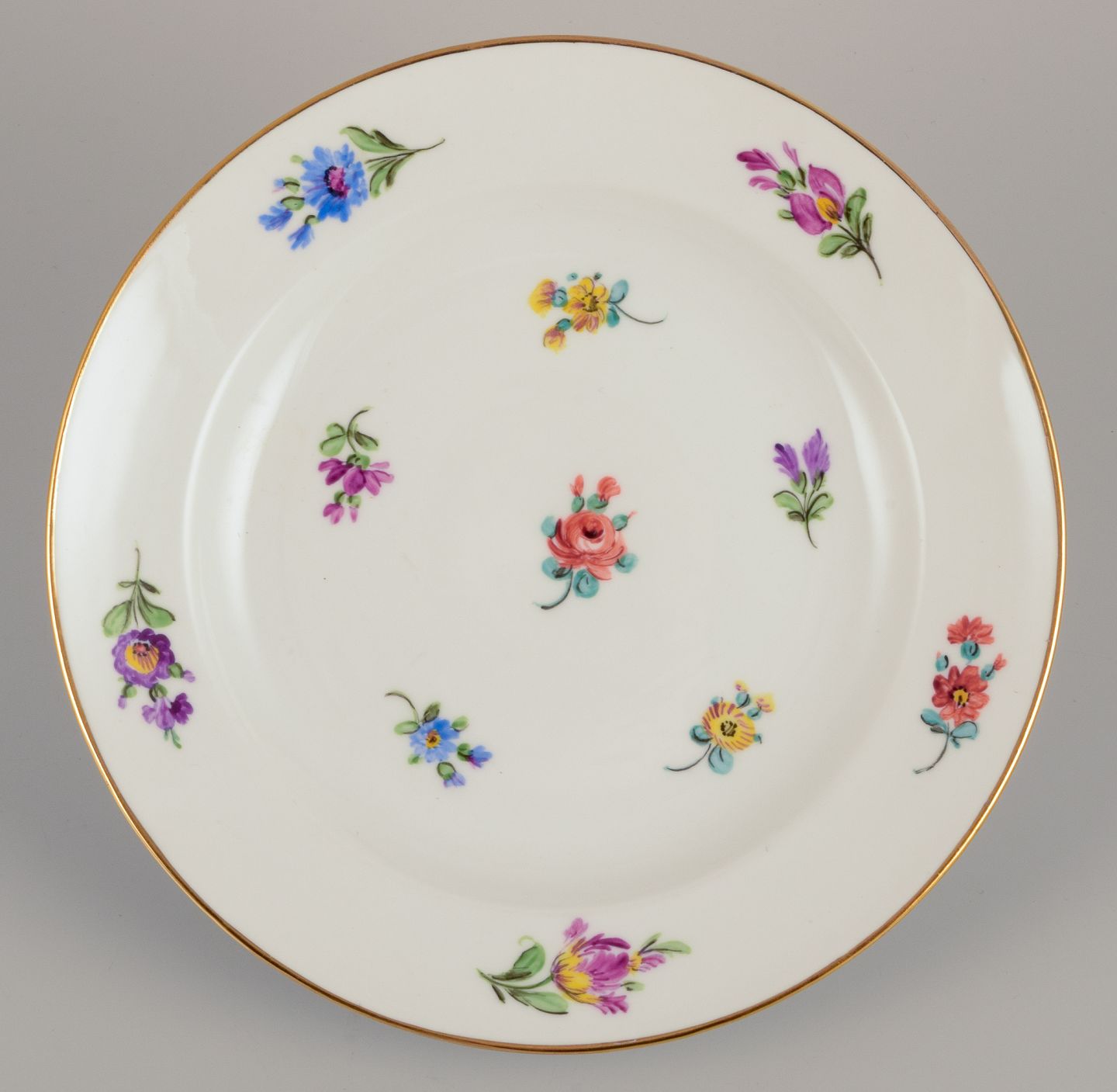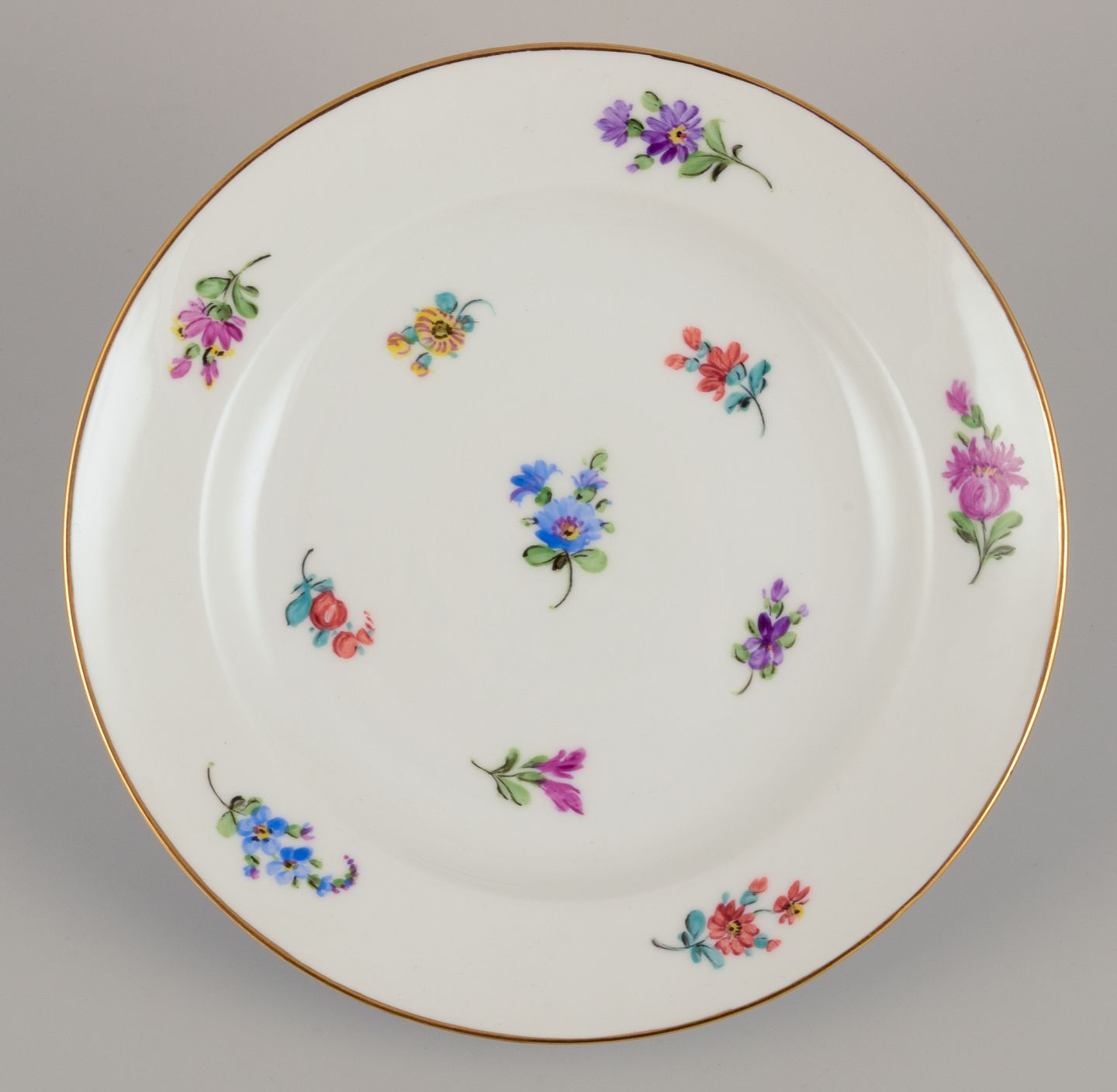 Meissen, Tyskland, fire tallerkner. Håndmalet med polykrome blomstermotiver, guldkant. Ca. 1920. Stemplet. Første sortering. I perfekt stand. Mål: D 18,0 cm.