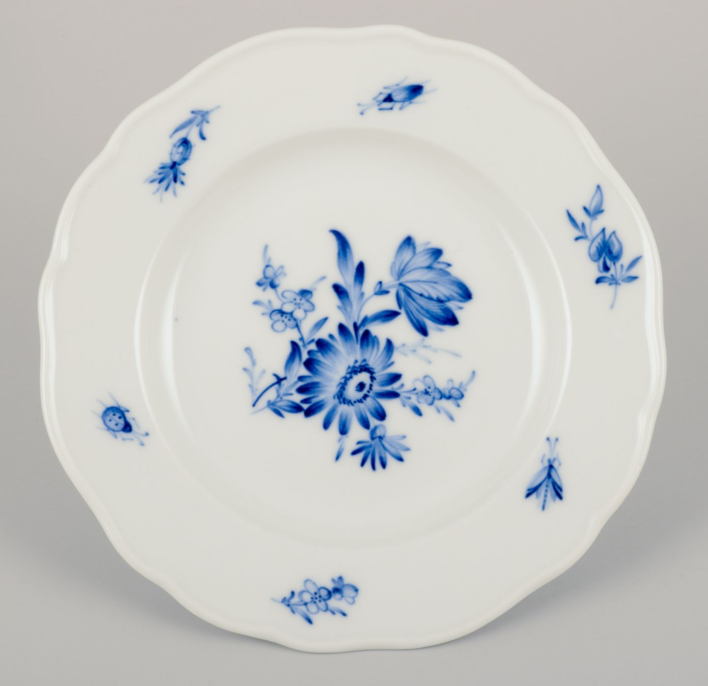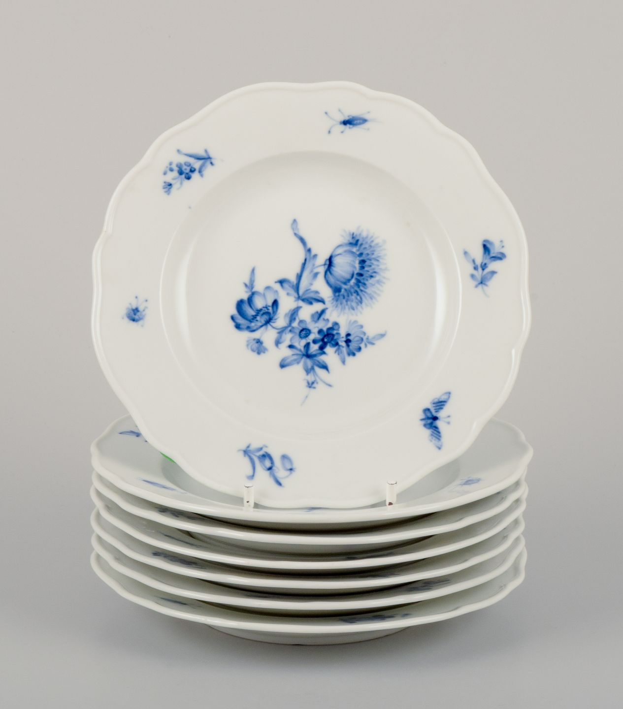 Meissen, Tyskland. Et sæt på syv tallerkner i porcelæn. Håndmalet med blomstermotiver og insekter i blåt. 1920/30’erne. Stemplet. Første sortering. I perfekt stand. Mål: D 16,0 cm.