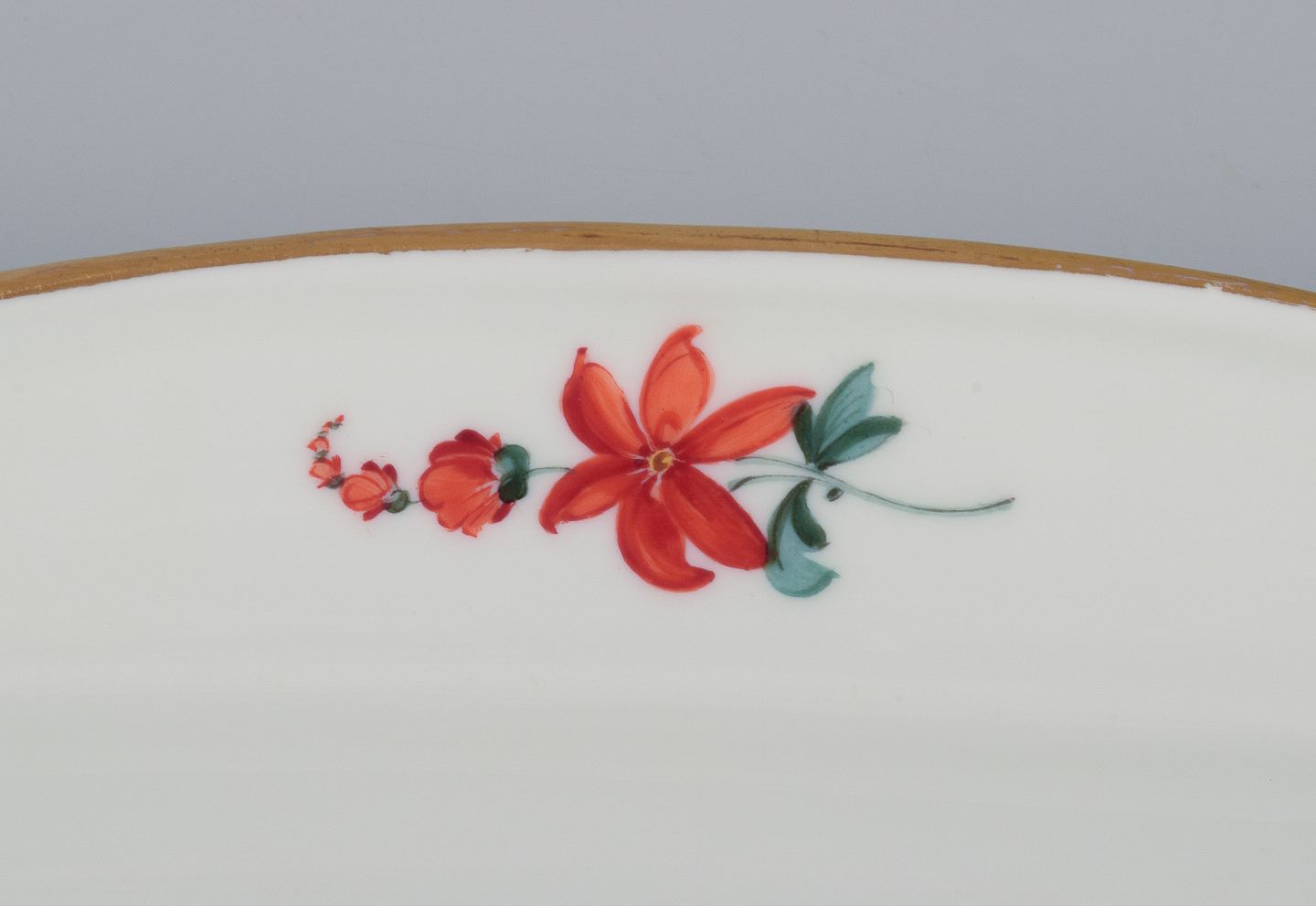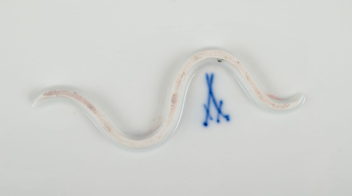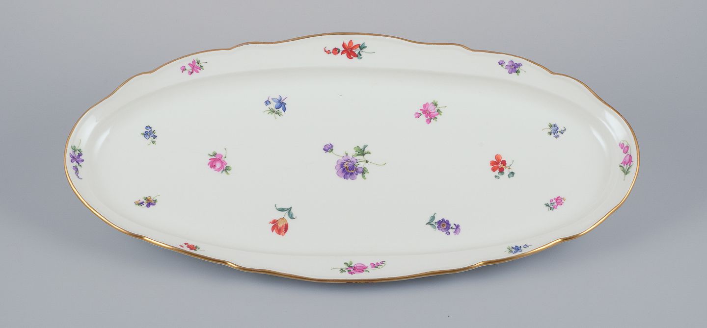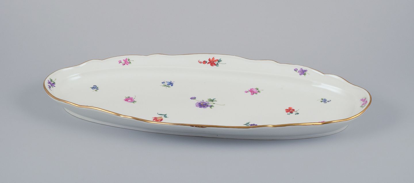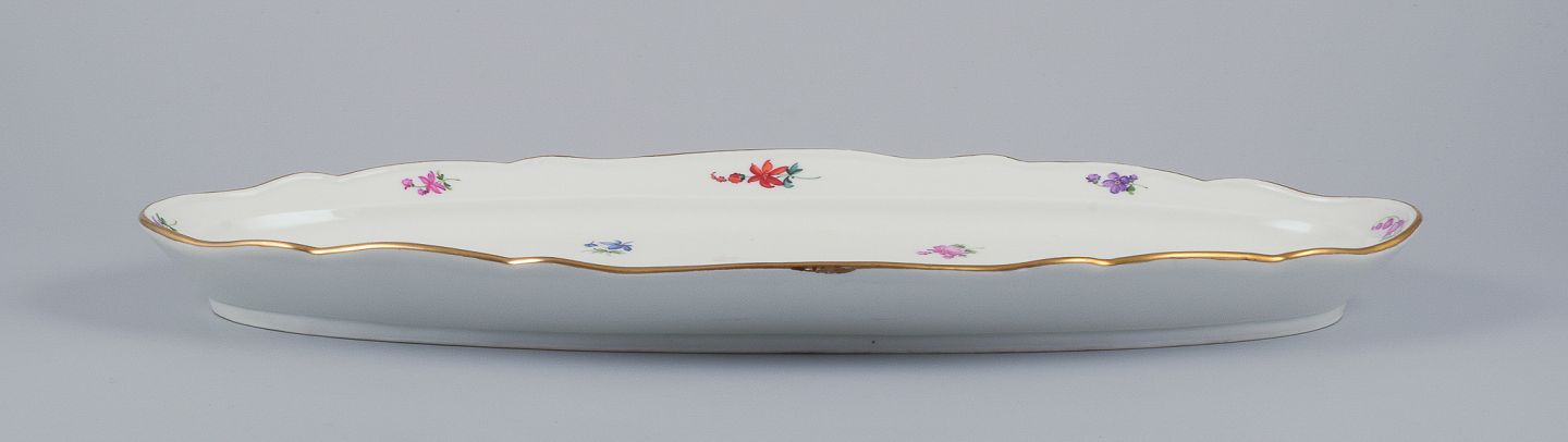 Meissen, Tyskland, stort aflangt fiskefad. Håndmalet med polykrome blomstermotiver, guldkant. Ca. 1920. Stemplet. Første sortering. Perfekt stand. Mål: L 54,5 cm. x B 25,5 cm. x H 4,7 cm.