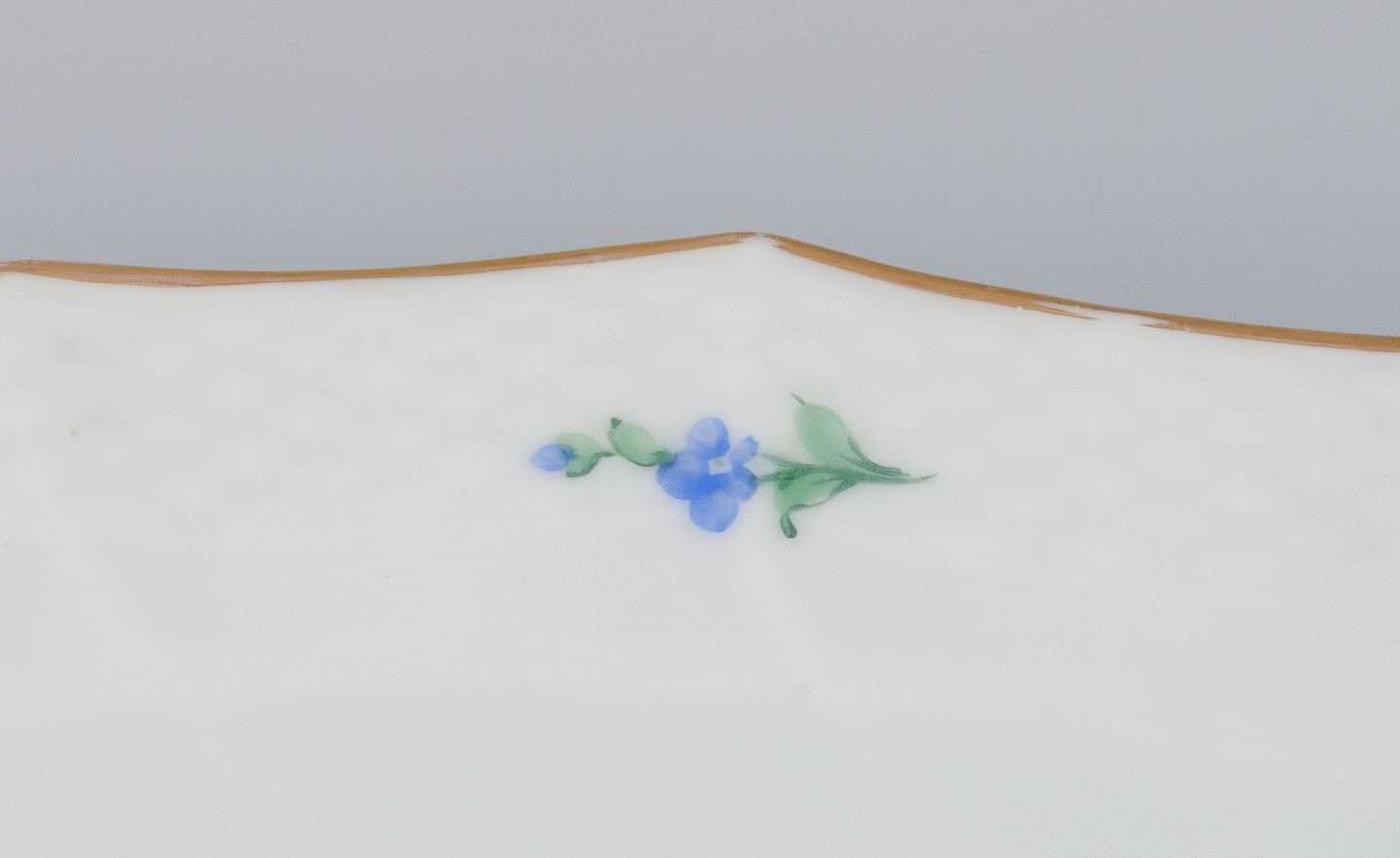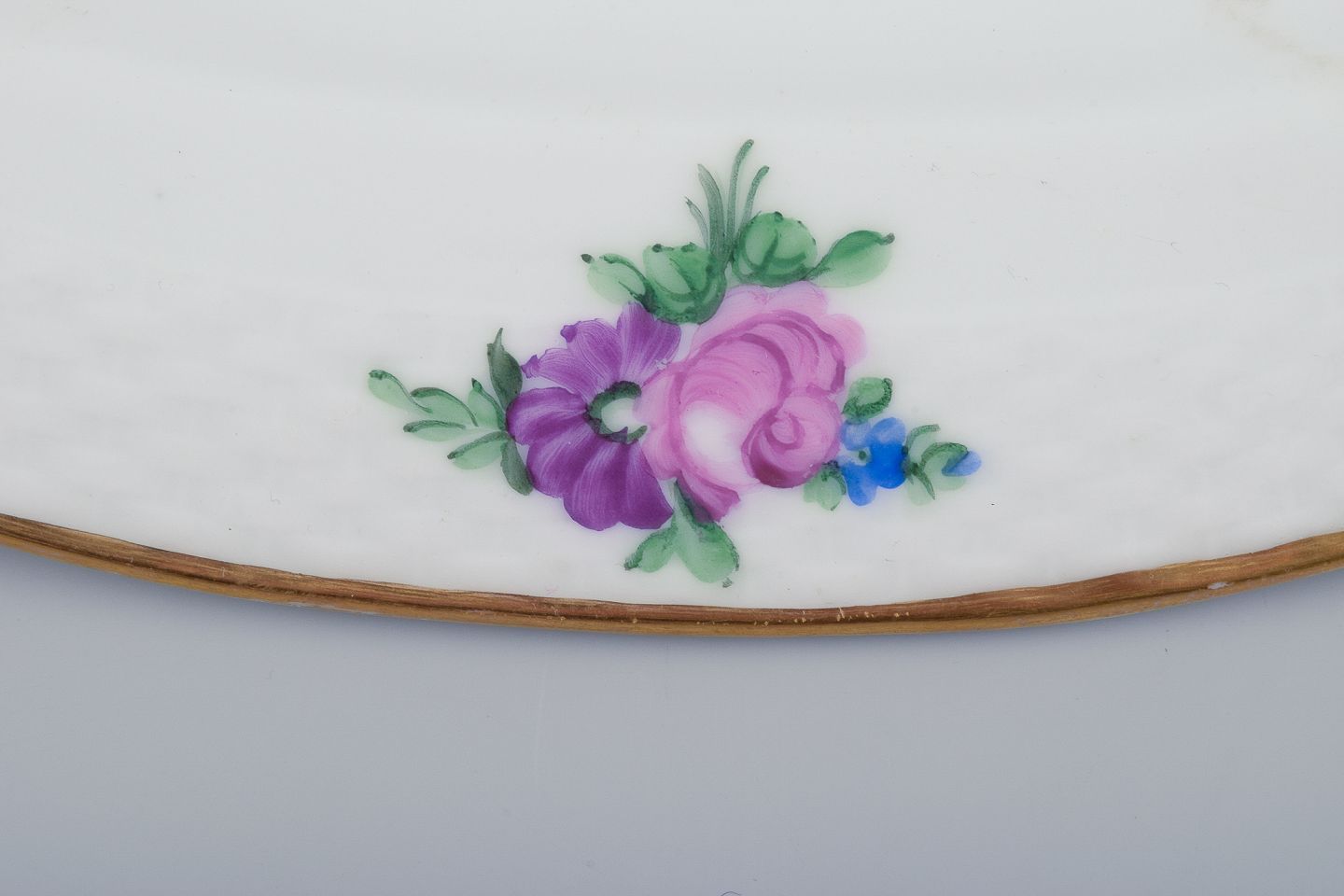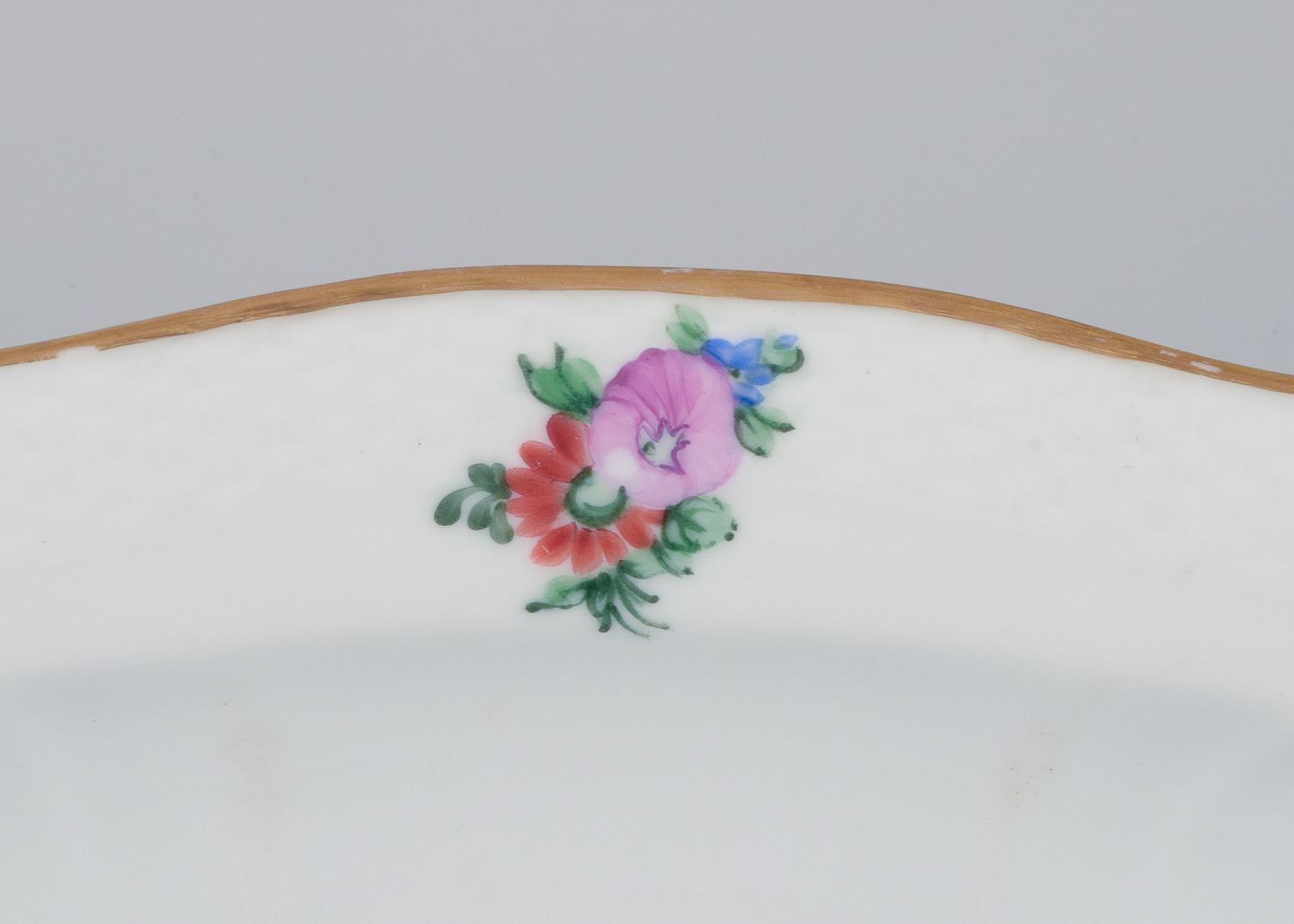 Hand-painted with polychrome floral motifs, gold rim.