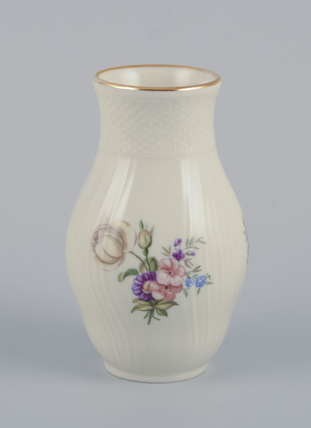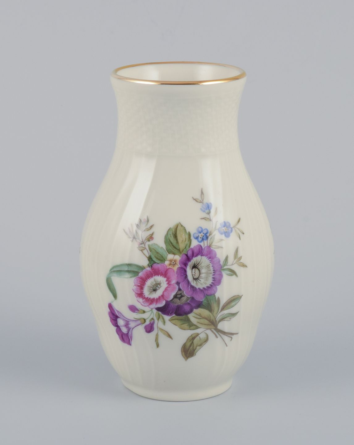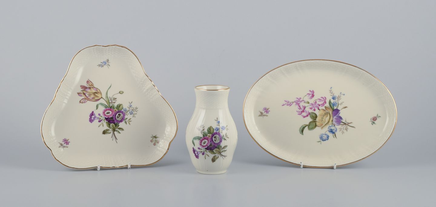 Royal Copenhagen ”Frijsenborg”. To fade og vase i porcelæn håndmalet med blomster og guldkant.
