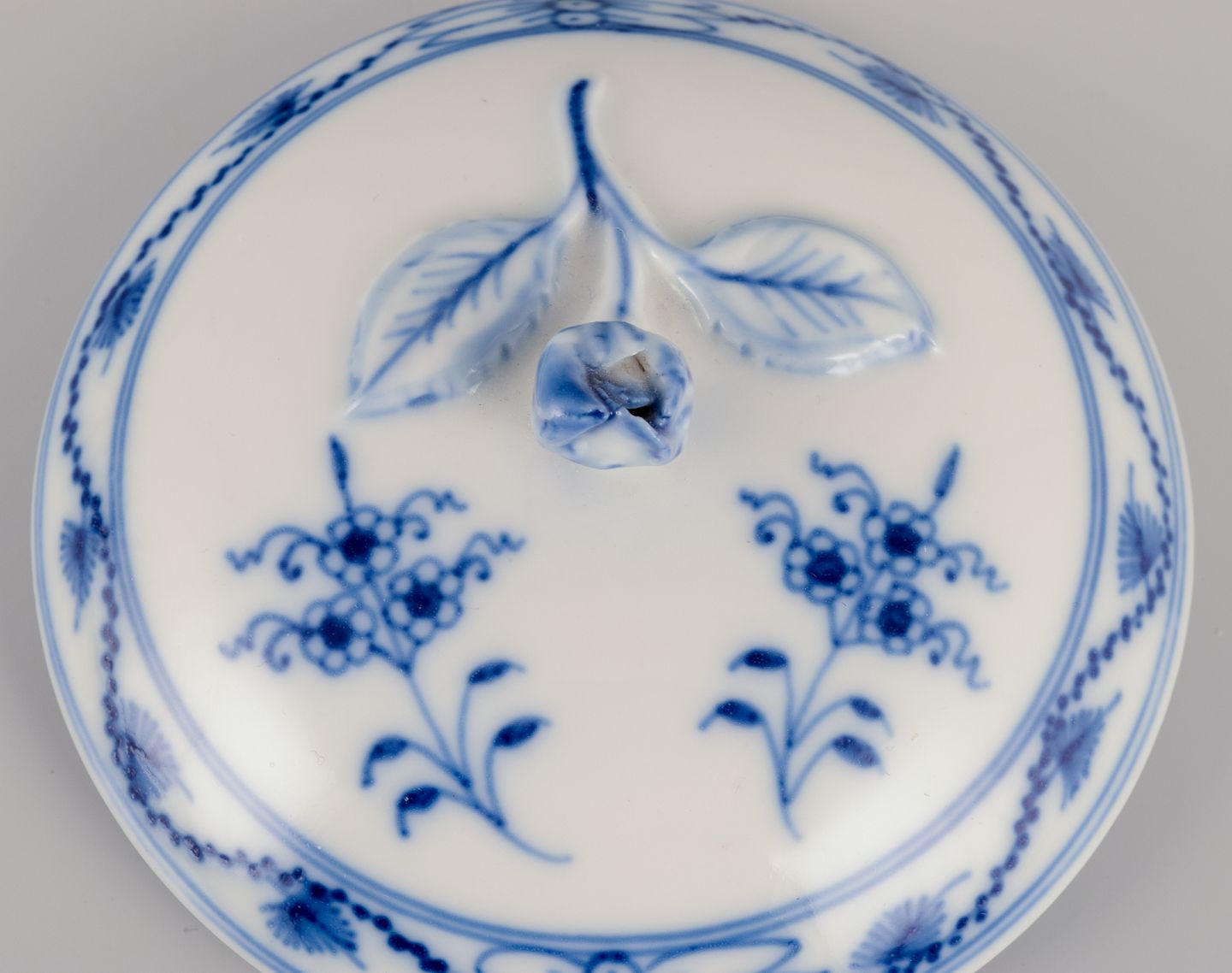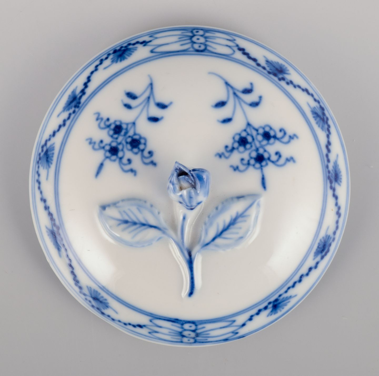 Hand-painted in blue. Lid adorned with relief flower.
