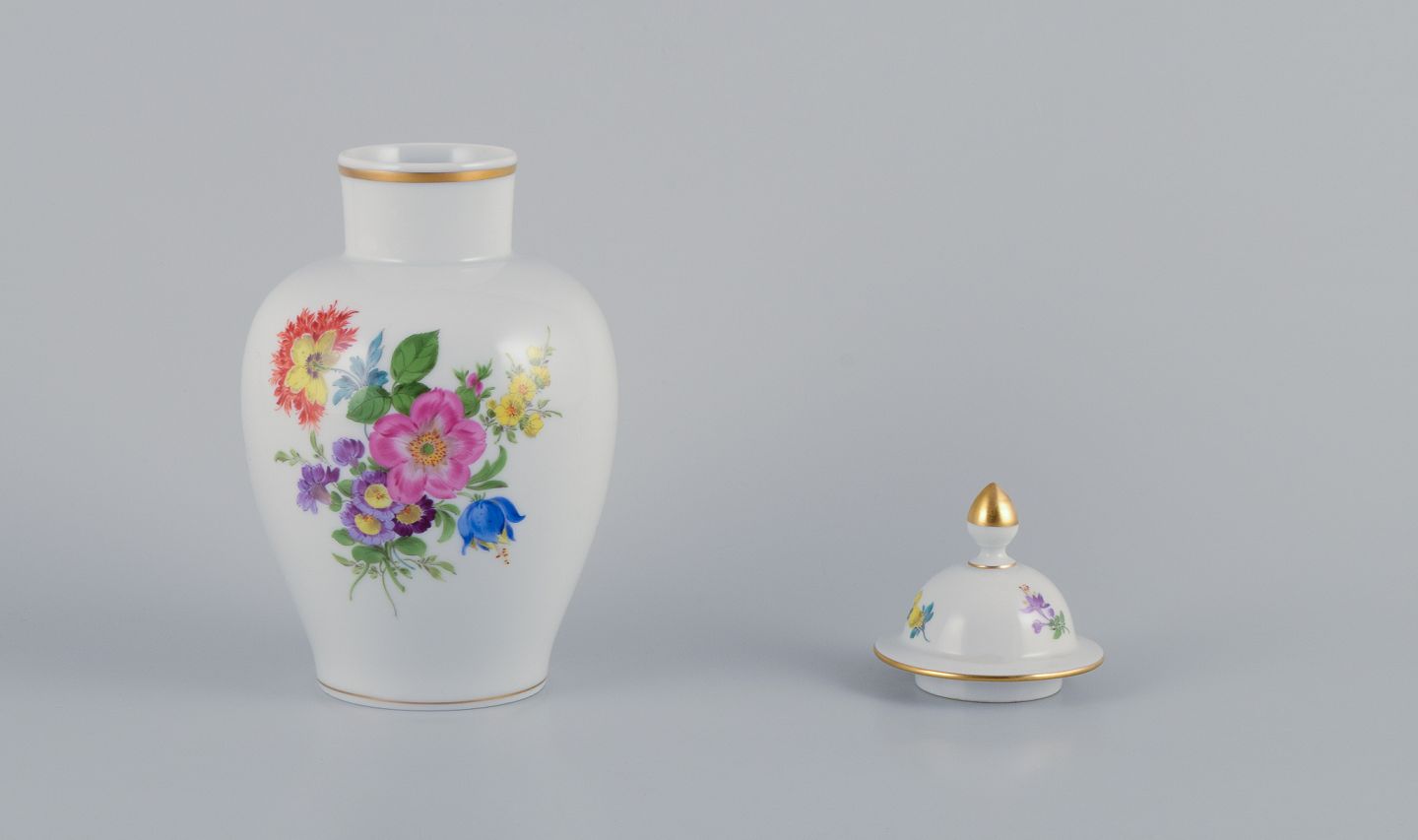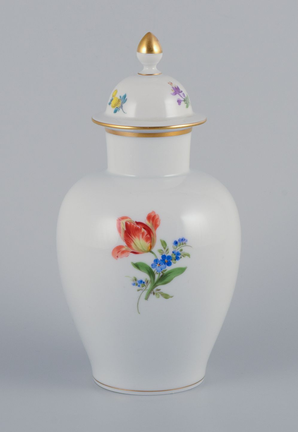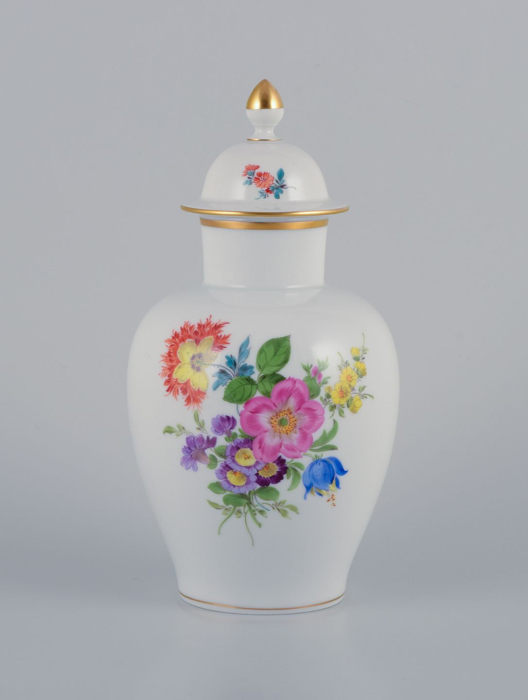 Meissen, lågvase i porcelæn. Polykrome blomstermotiver i overglasur. Håndmalet. Gulddekoration. Midt 1900-tallet. Stemplet. Første sortering. Perfekt stand. Mål: H 22,0 cm. x D 11,0 cm.