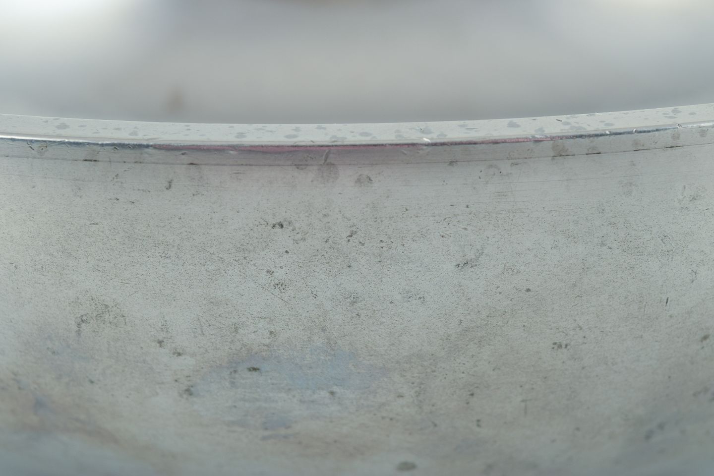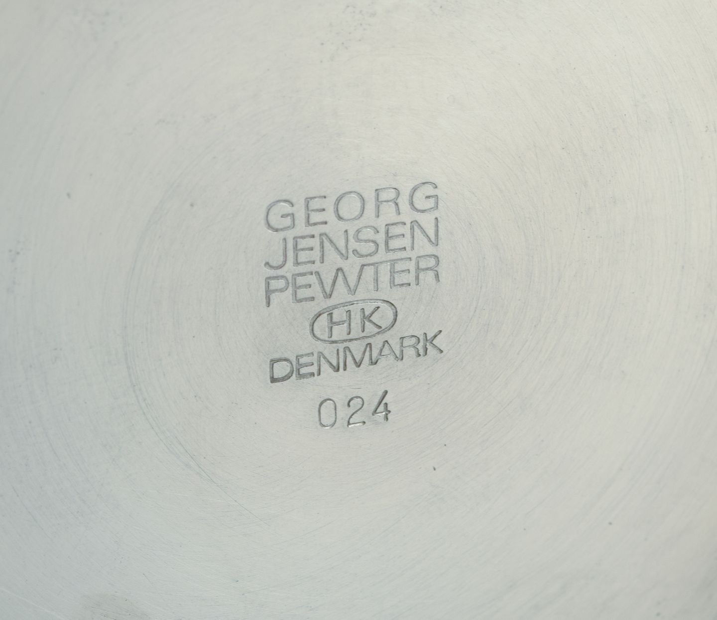 Henning Koppel for Georg Jensen, stor og sjælden skål i tin. Modernistisk design. Stilrent dansk design. 1960'erne. Stemplet. I flot stand med brugspræg. Mål: D 26,0 cm. x H 8,0 cm.