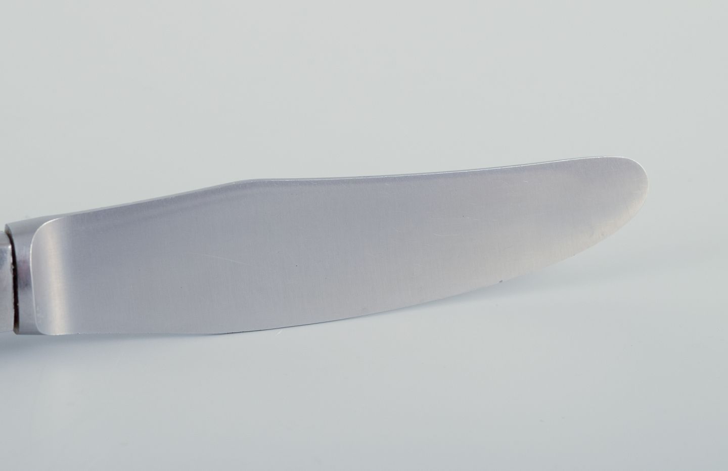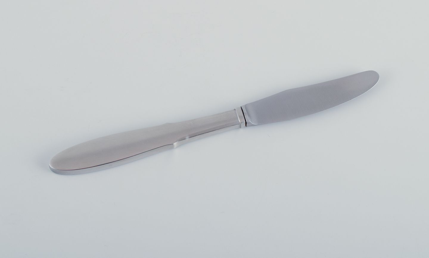 Gundorph Albertus for Georg Jensen. Et sæt på fire langskaftede Mitra frokostknive i rustfrit stål. Georg Jensen knivblad. Ca. 1960. I flot stand. Stemplet. Mål: L 20,0 cm.