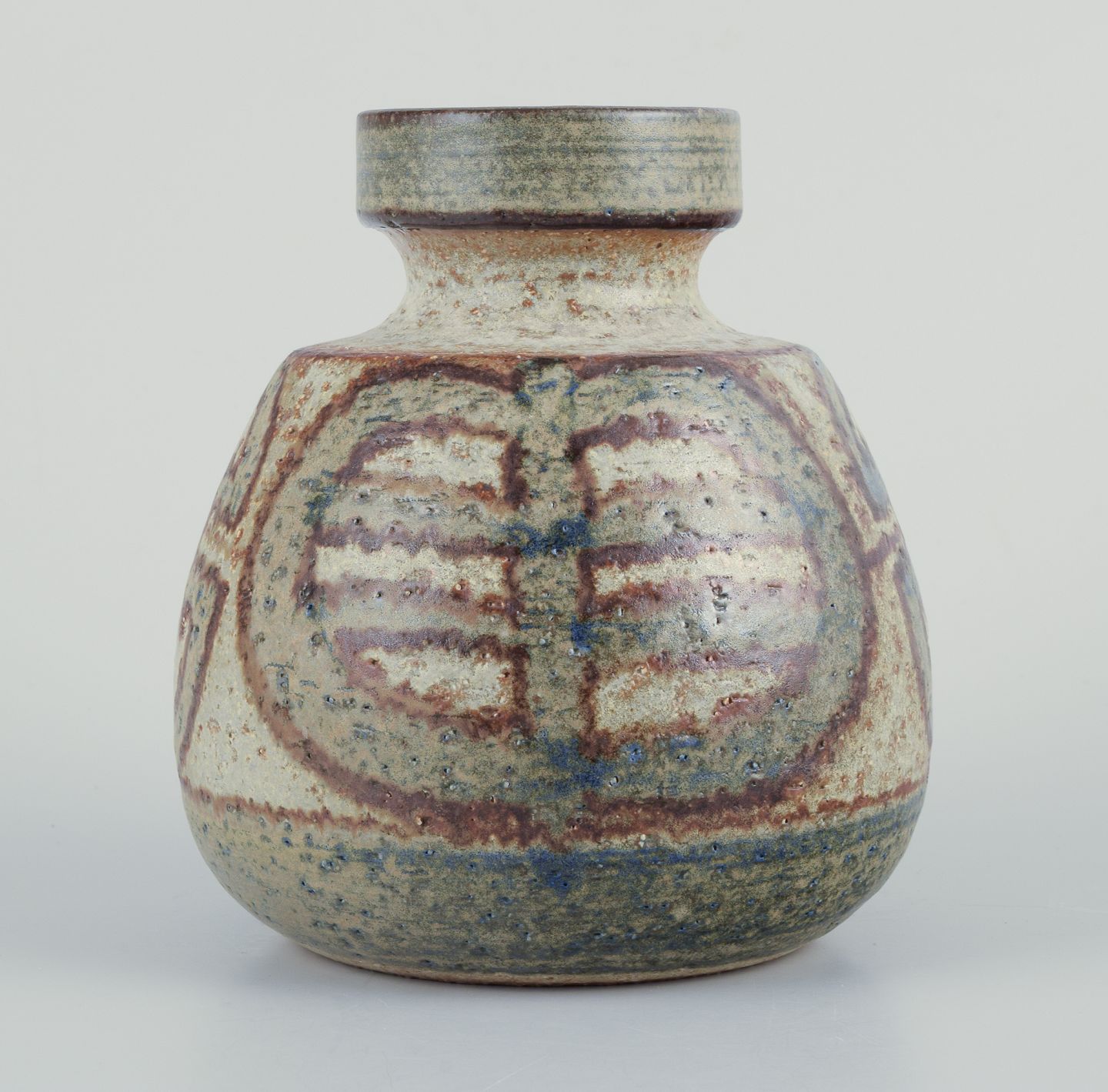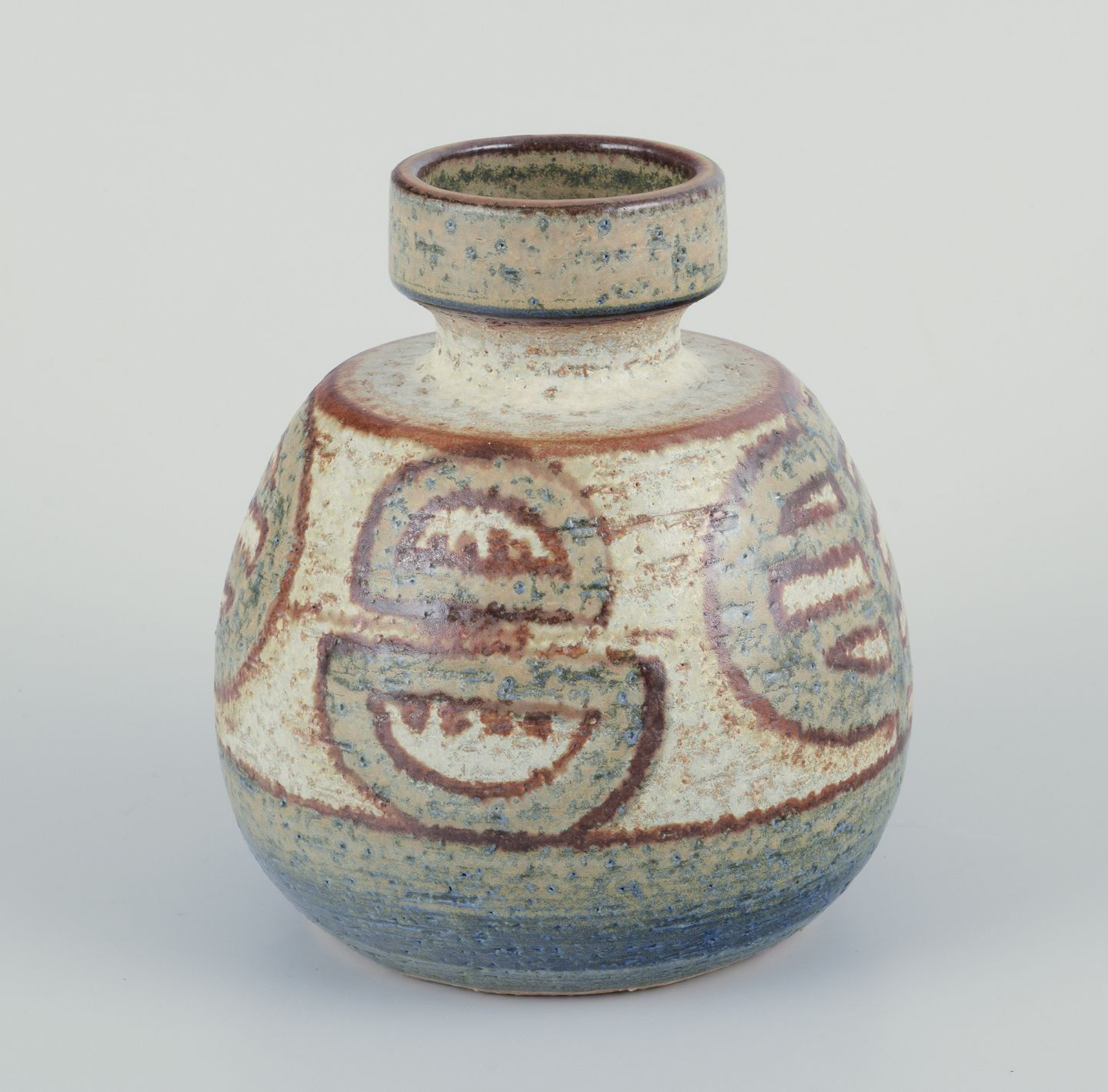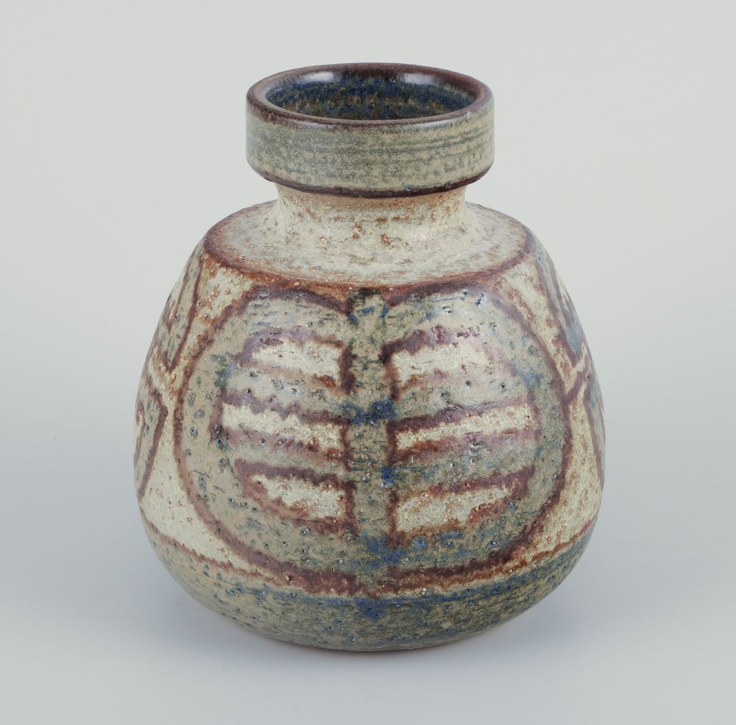 Noomi backhausen og Poul Brandborg for Søholm Keramik, Bornholm. Et par vaser i stentøj. Håndmalet geometriske mønstre. 1960/70’erne. Stemplet. Perfekt stand. Største: H 14,5 cm. x D 13,0 cm.