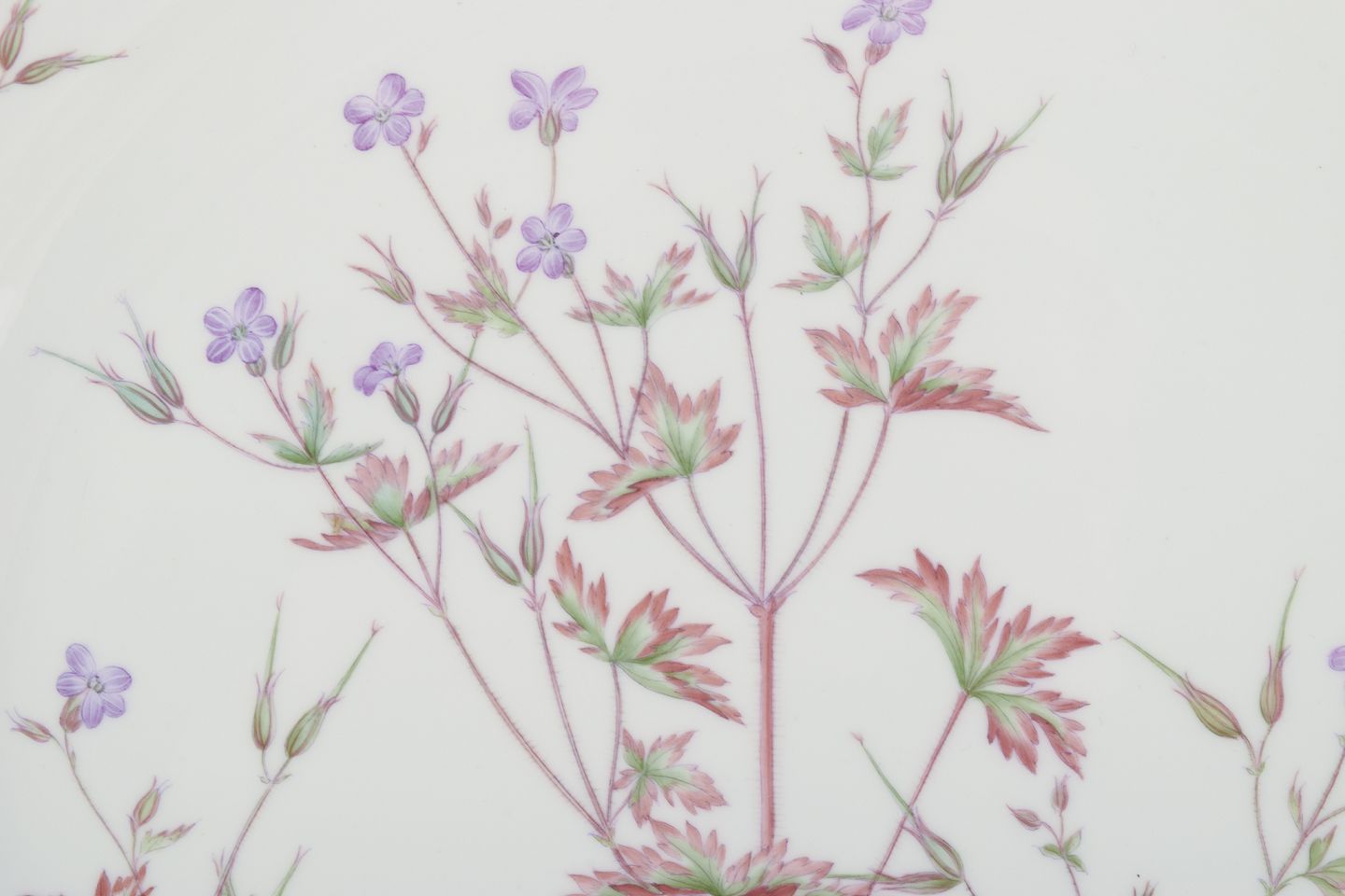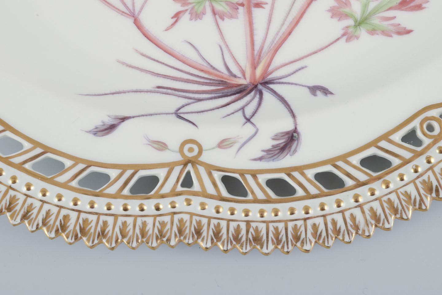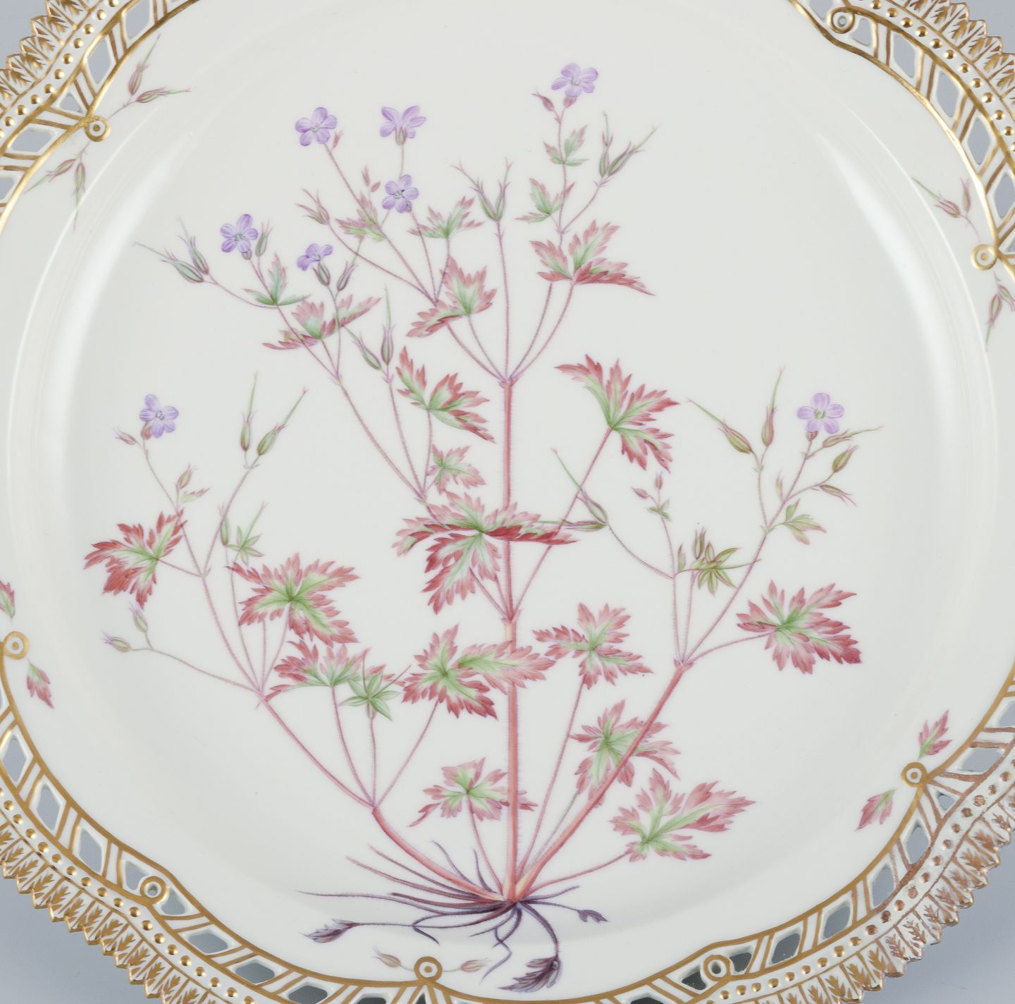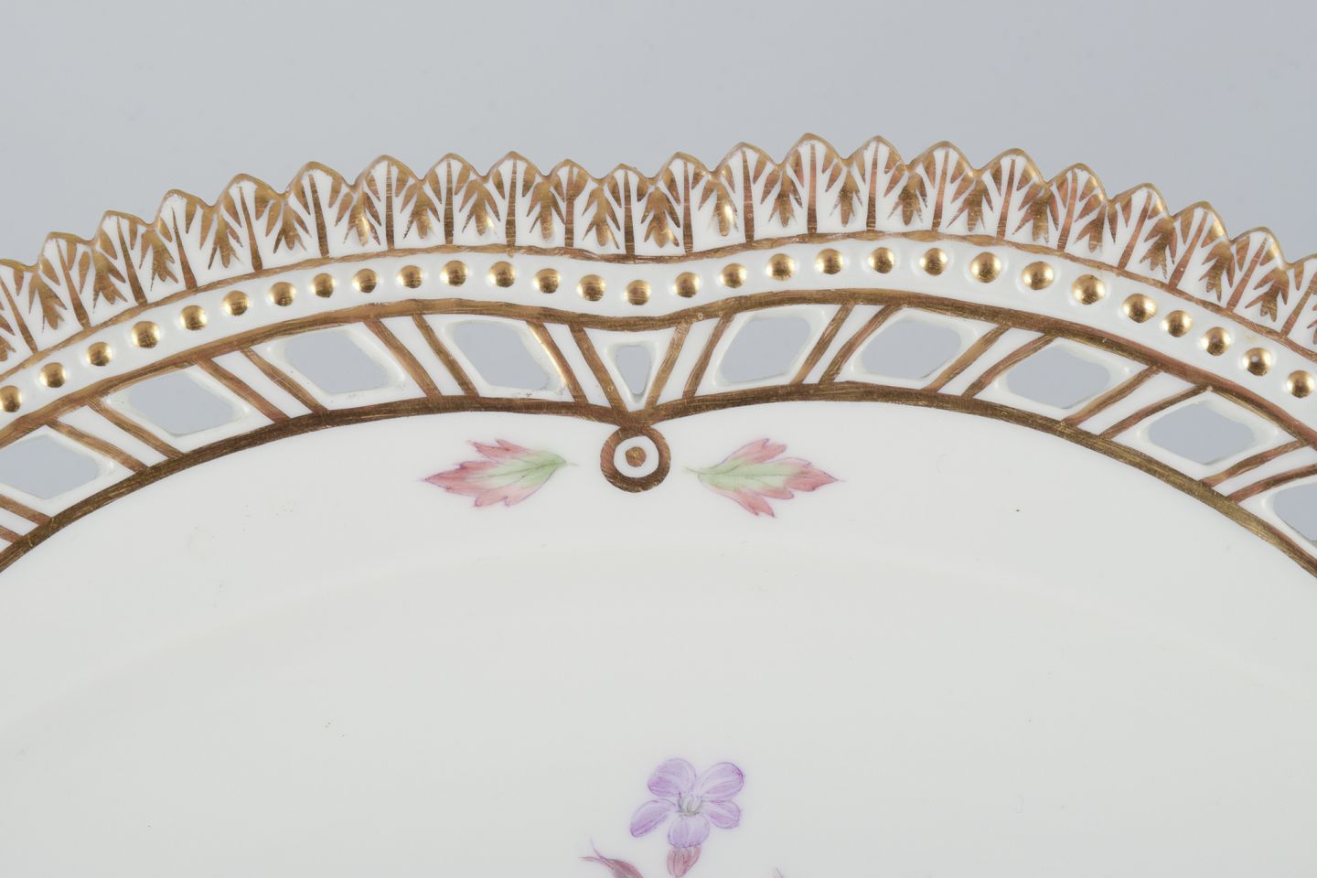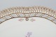 Royal Copenhagen Flora Danica. Stort gennembrudt fad i håndmalet porcelæn med blomster og gulddekoration.