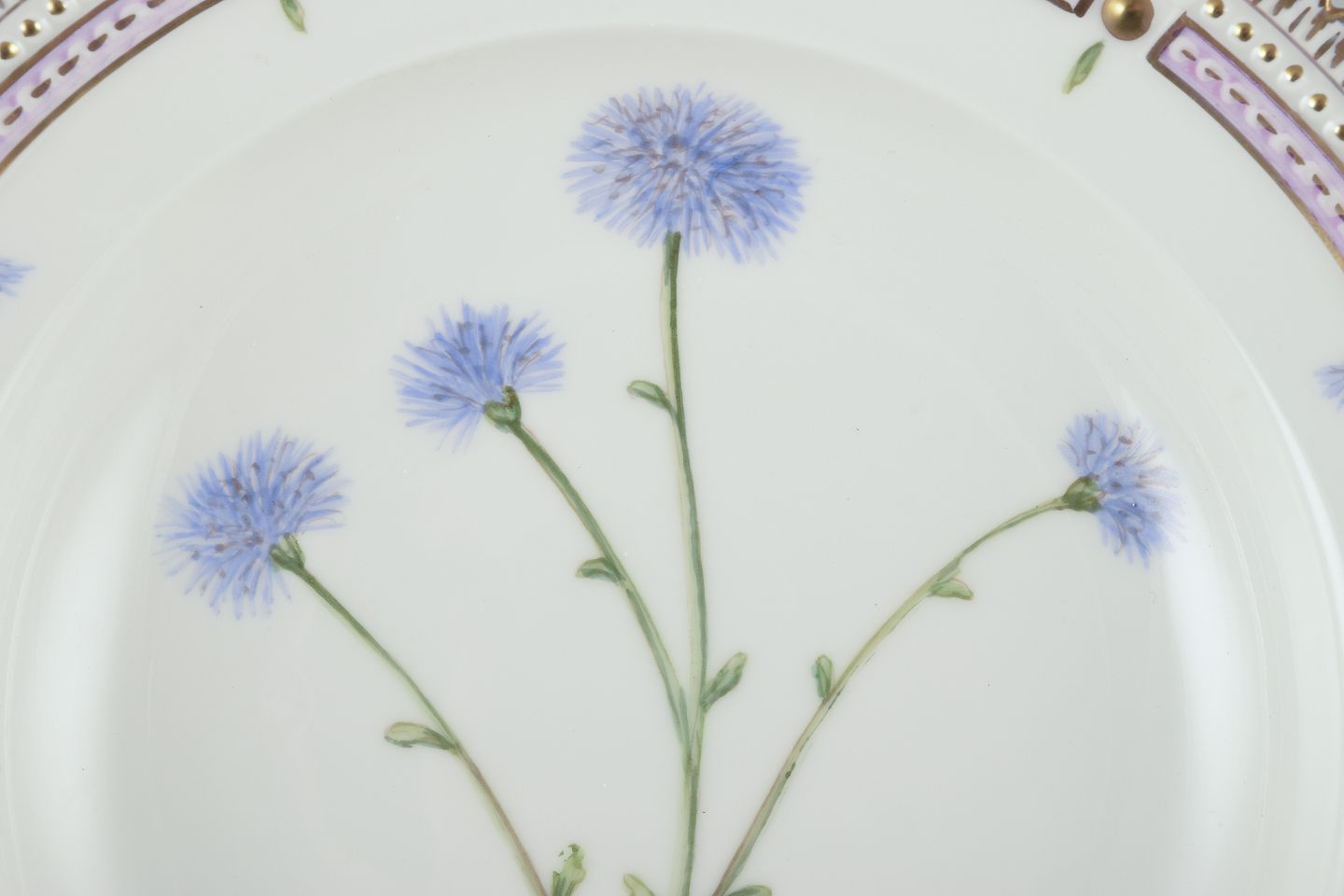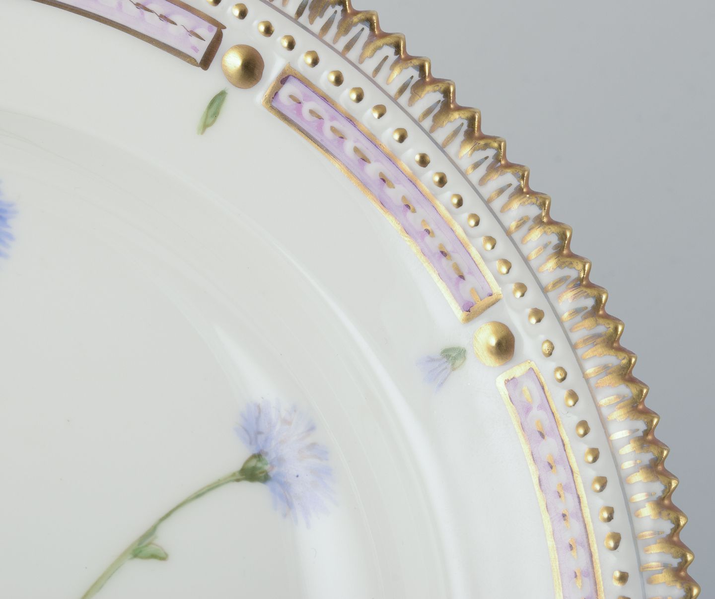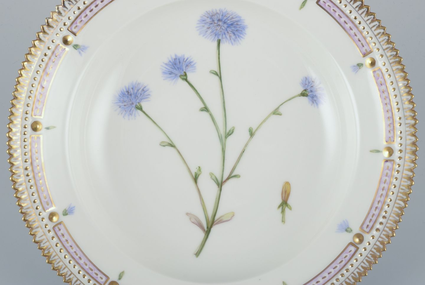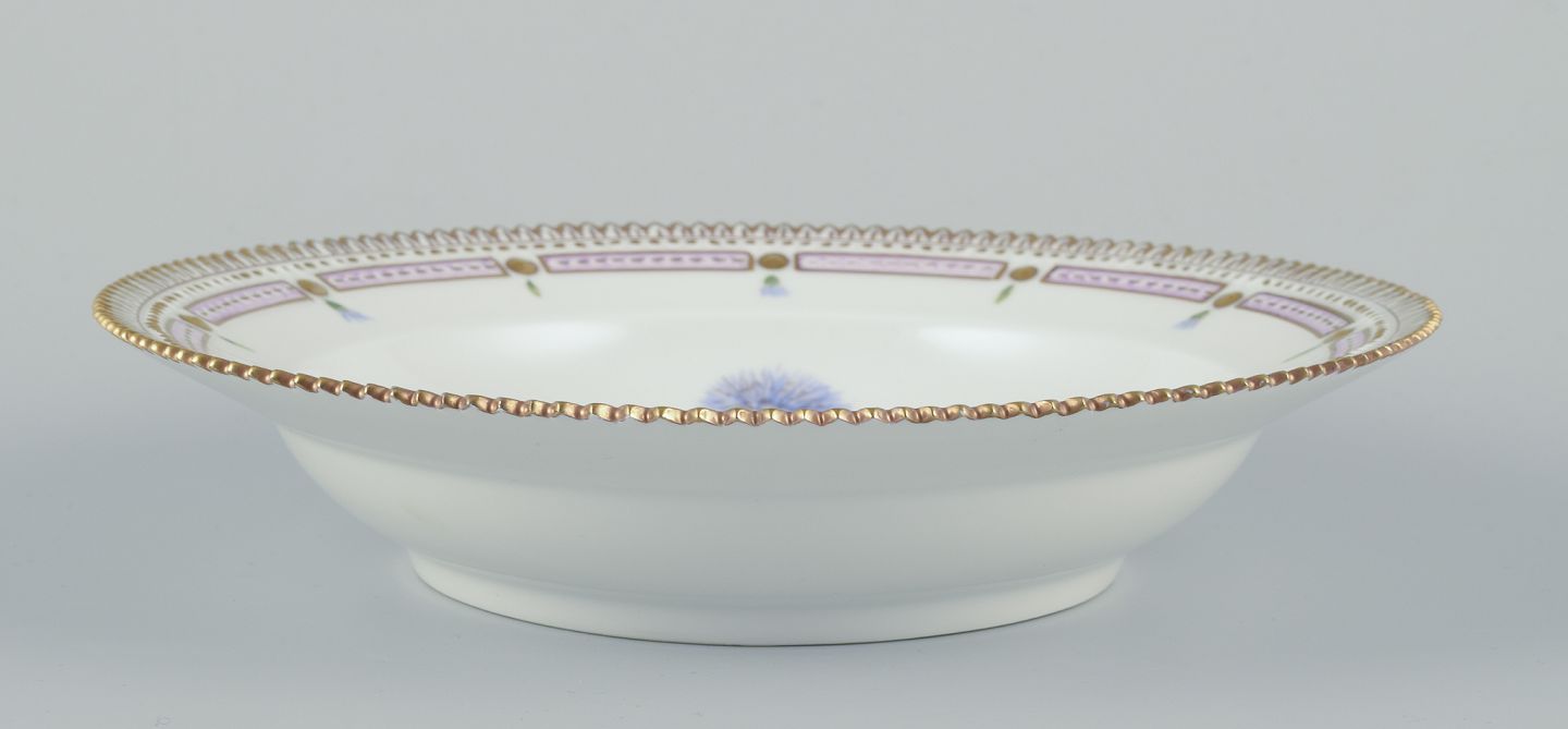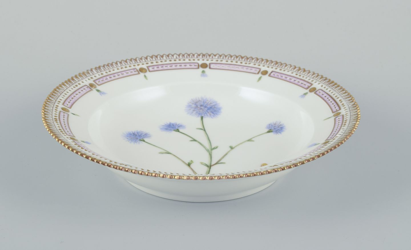 Royal Copenhagen Flora Danica. Dyb tallerken i håndmalet porcelæn med blomster og gulddekoration. Datering: 1954 Stemplet. Perfekt stand. Anden sortering. Mål: D 22,0 cm. x H 4,5 cm.