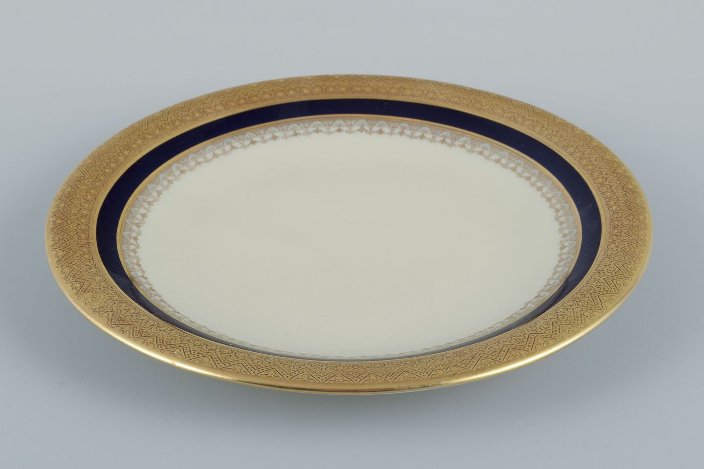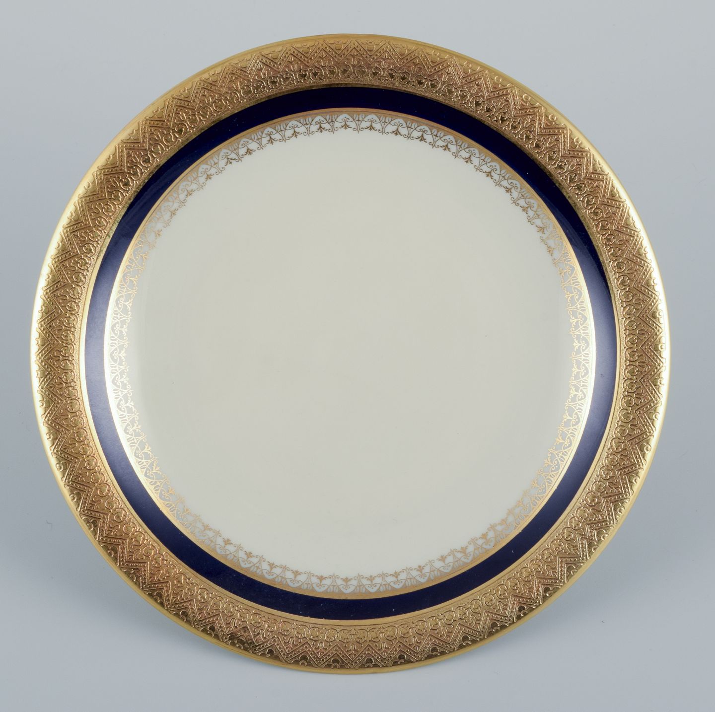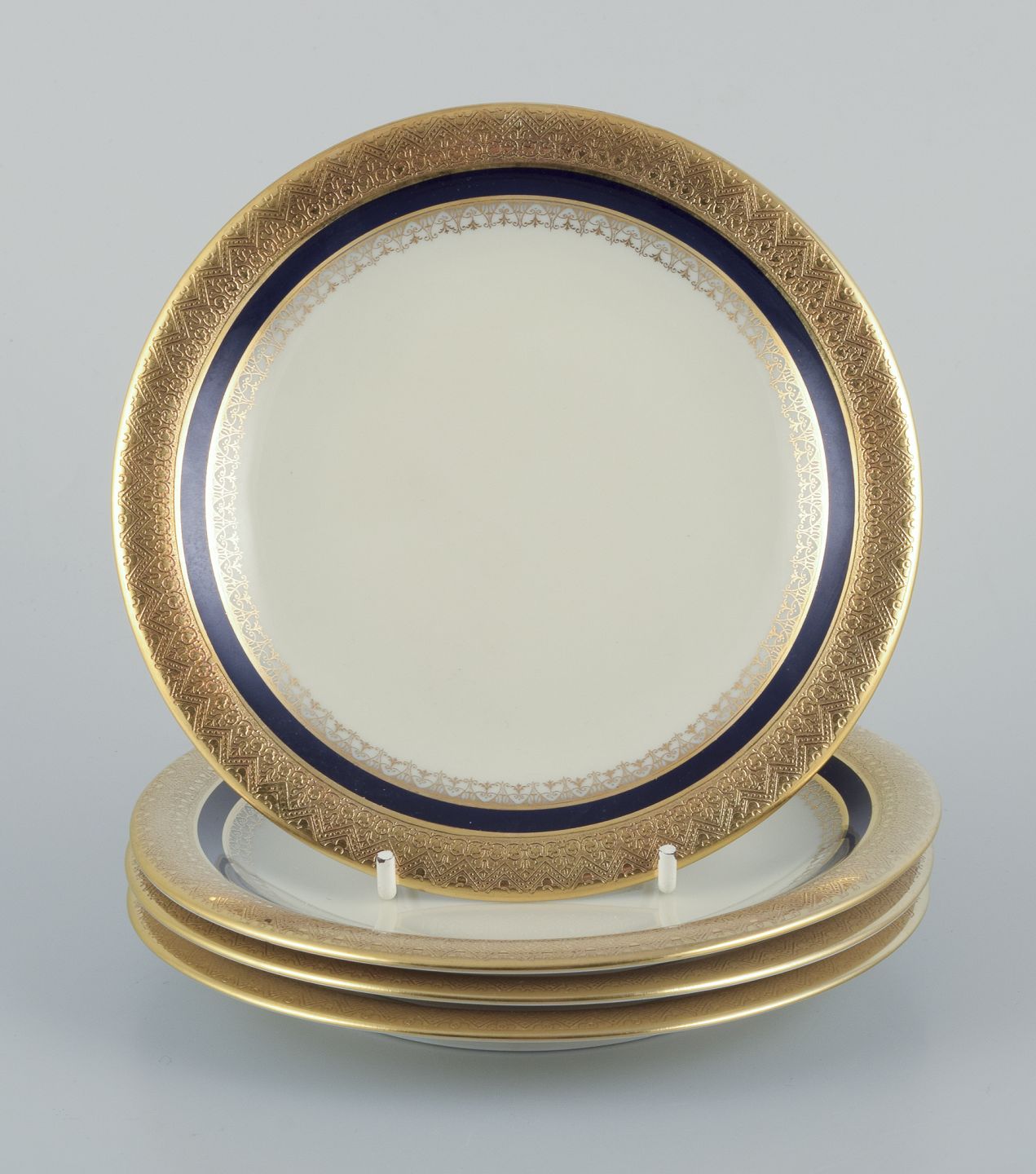 Hutschenreuther, Tyskland. Fire tallerkner fra serien ”Margarete”. Hånddekoreret med guld og kongeblå.
