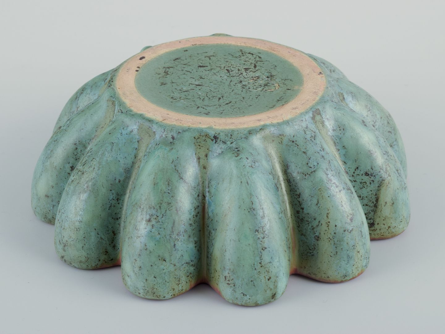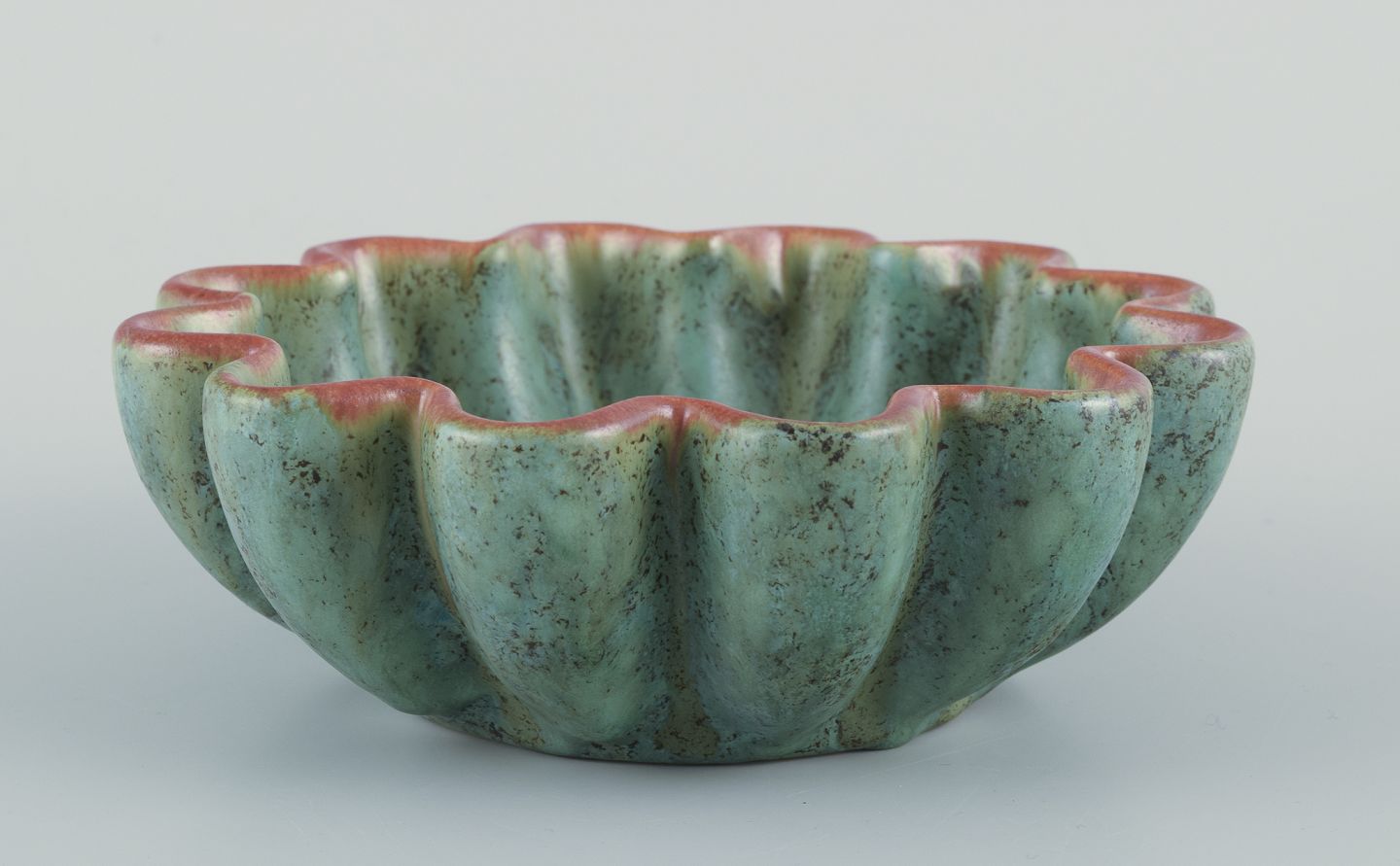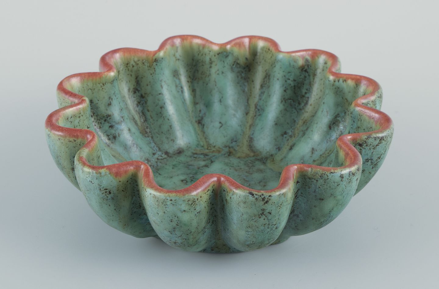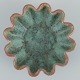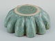 Michael Andersen, Bornholm. Keramikskål i bølget form. Glasur i grønne toner. Orange kant. Håndglaseret. Datering: Ca. 1960’erne. Stemplet. Perfekt stand. Mål: D 16,5 cm. x H 5,5 cm.