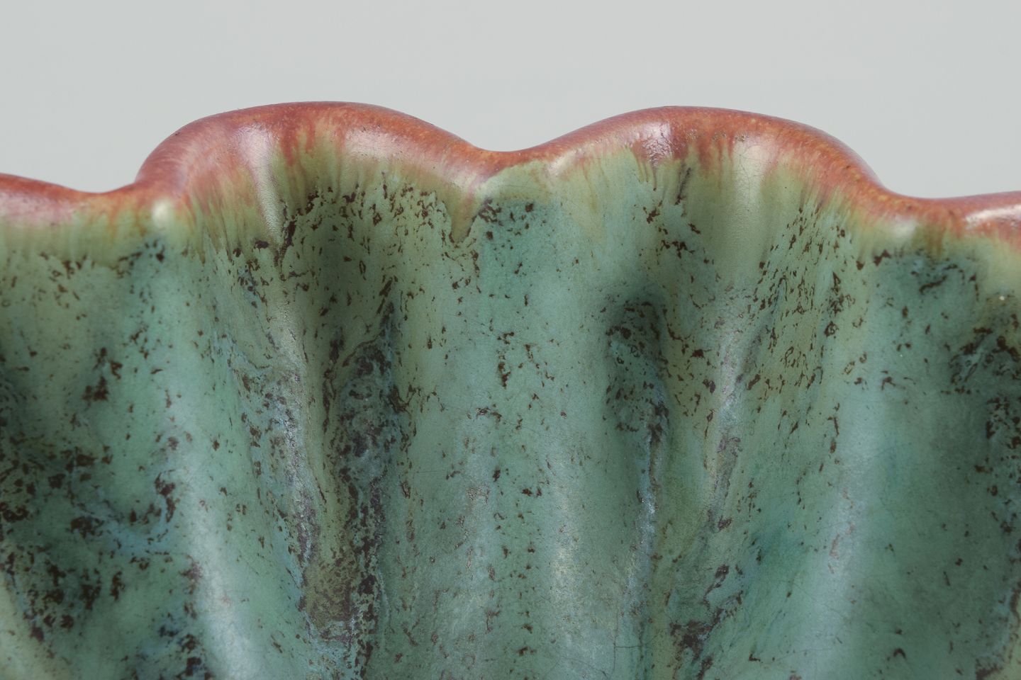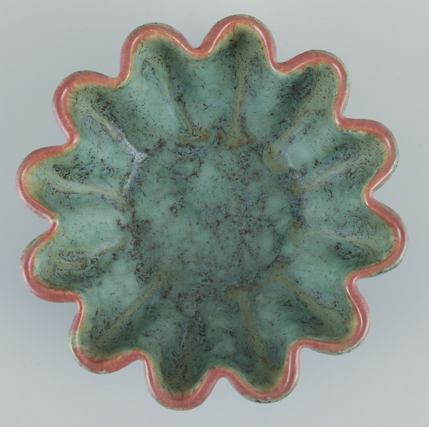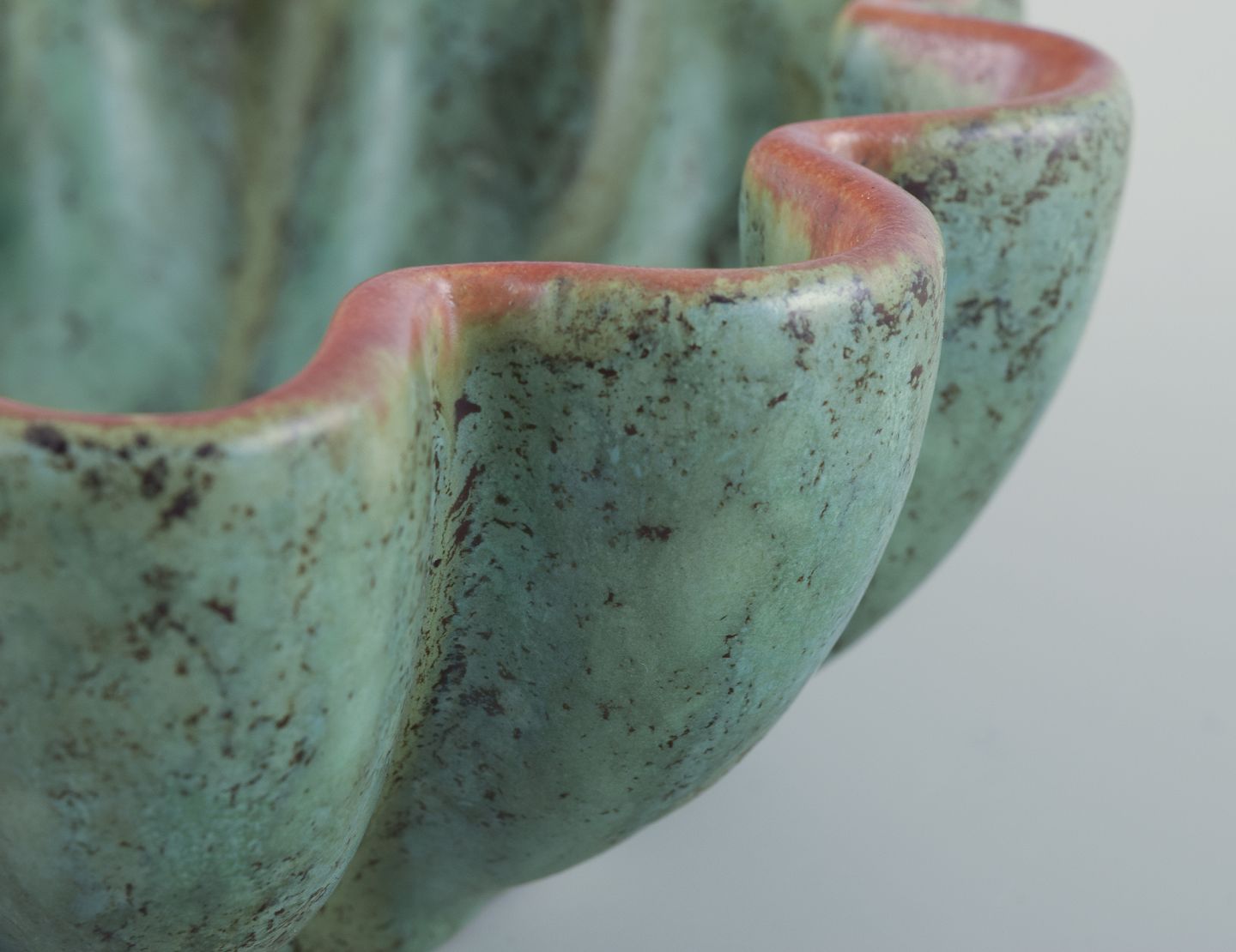 Michael Andersen, Bornholm. Keramikskål i bølget form. Glasur i grønne toner. Orange kant. Håndglaseret. Datering: Ca. 1960’erne. Stemplet. Perfekt stand. Mål: D 16,5 cm. x H 5,5 cm.