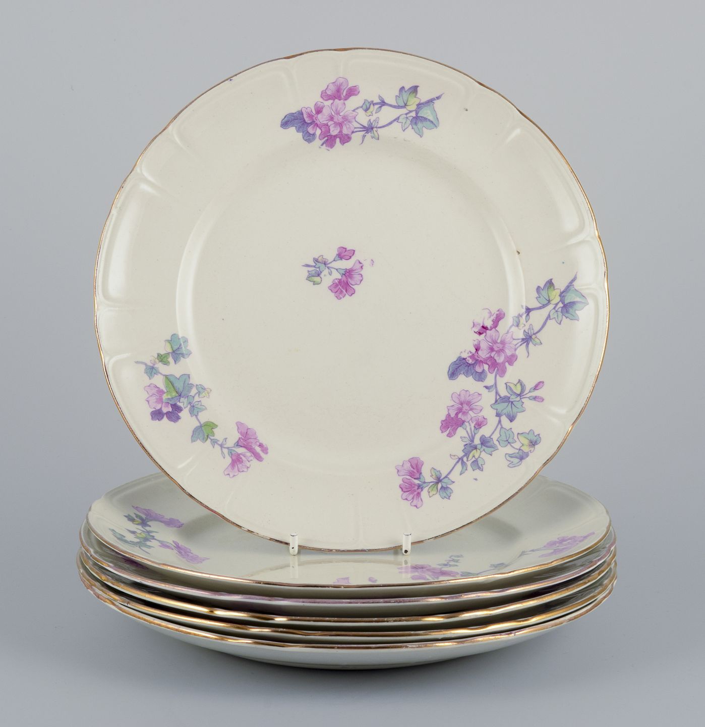 Et sæt på seks ”Geranium” middagstallerkener i fajance.