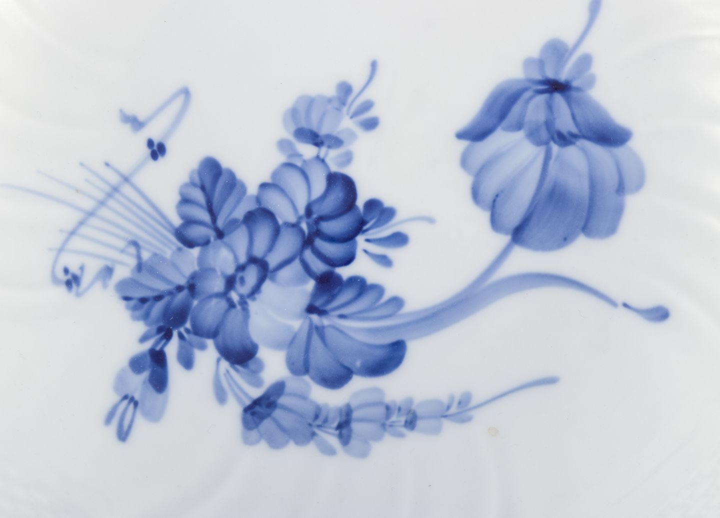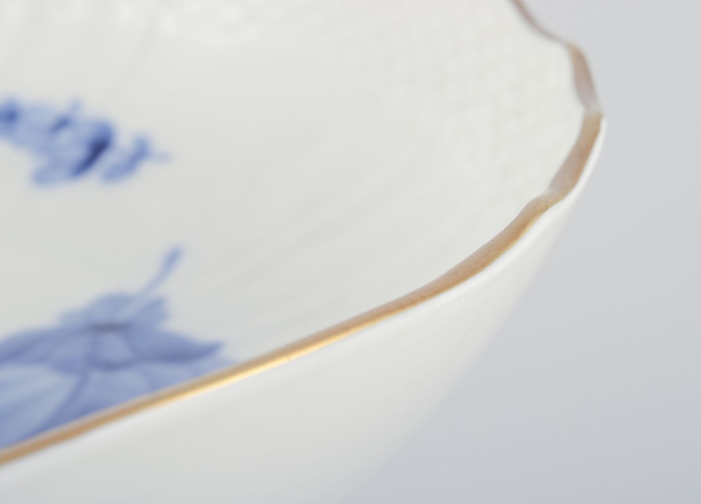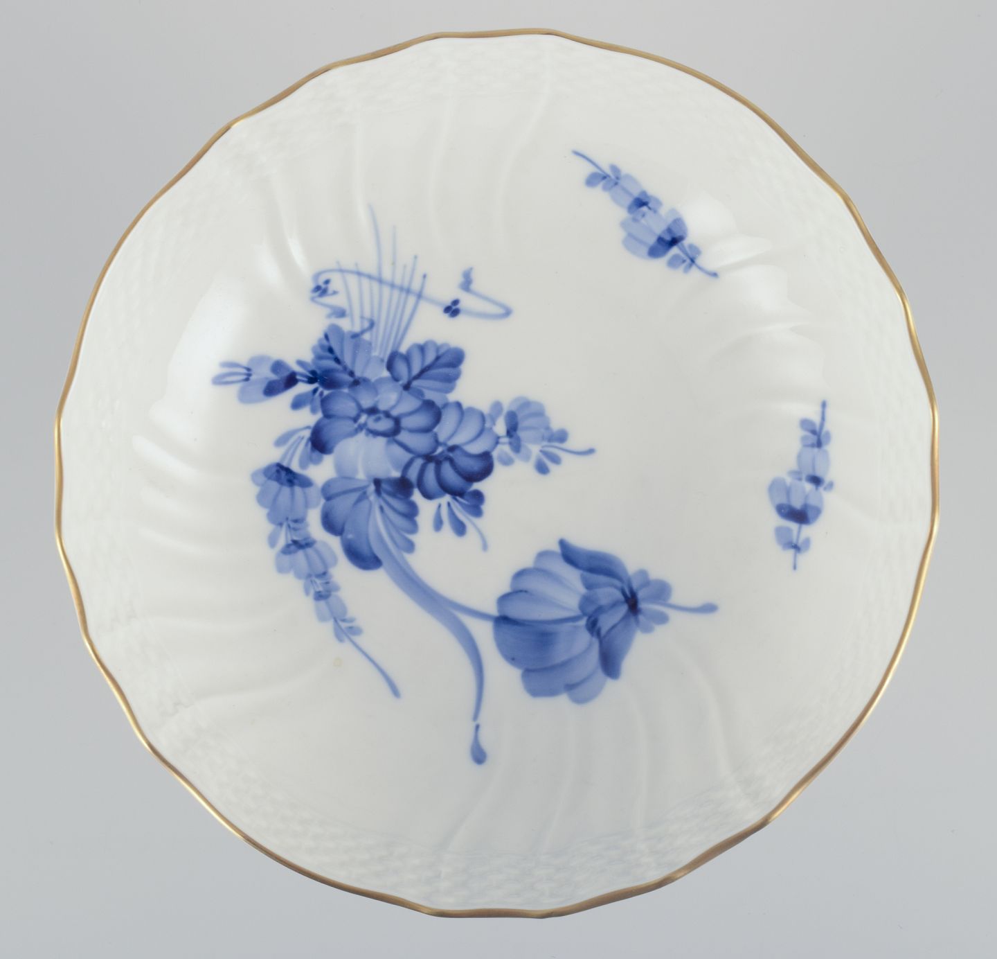 Royal Copenhagen Blue Flower Curved centrepiece with gold edge. Model number: 10/1528. Dated: 1967. In perfect condition. Marked. First factory quality. Dimensions: D 21,5 cm. x H 15.5 cm.