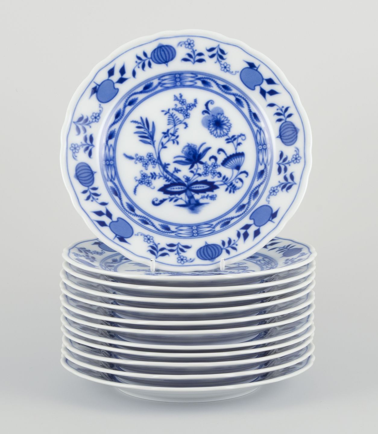 Bavaria, Tyskland. Et sæt på tolv porcelænstallerkener, løgmønster. Datering: Midt 1900-tallet. Stemplet. Perfekt stand. Fremstår ubrugte. Mål: D 20,0 cm.