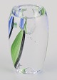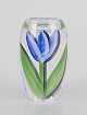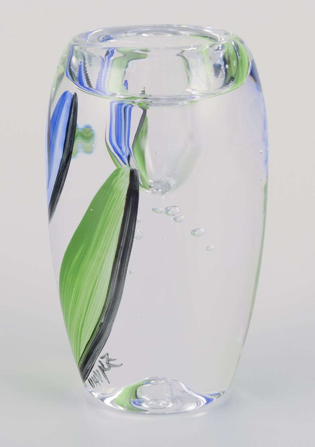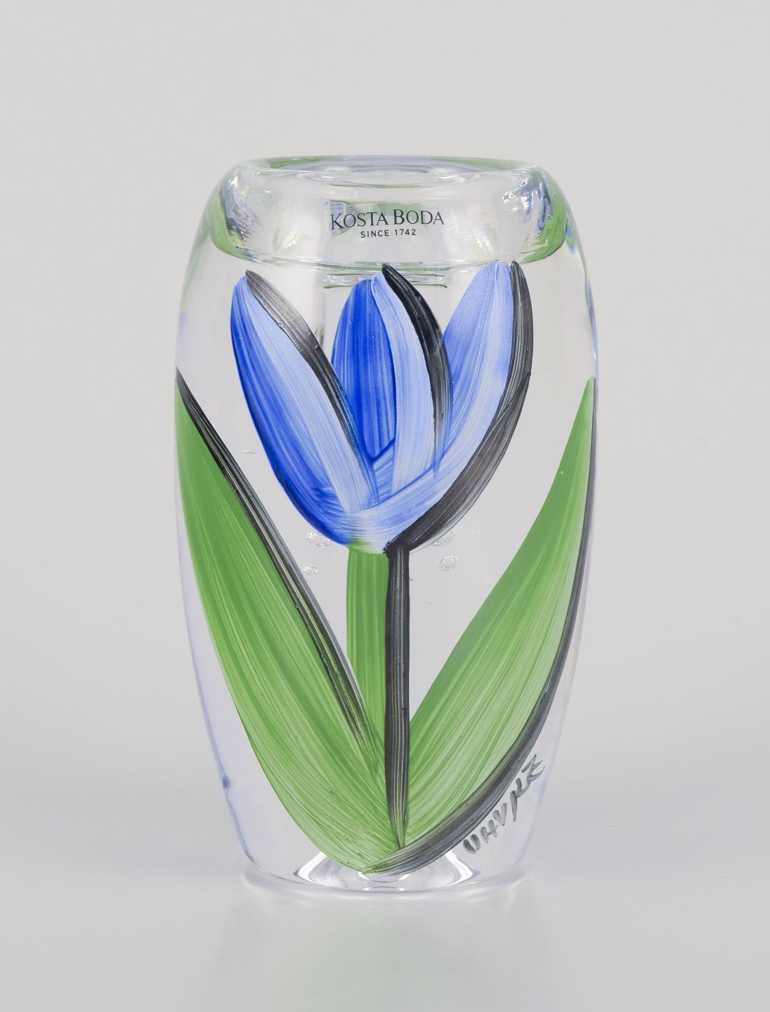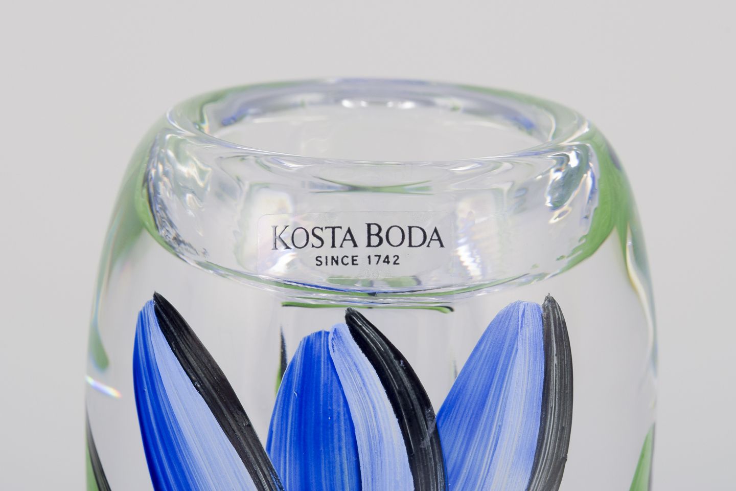 Ulrica Hydman Vallien for Kosta Boda, Sverige. Lysestage med håndmalet blomstermotiv. Sent 1900-tallet. I perfekt stand. Signeret samt mærkat. Mål: H 12,0 cm. x D 7,0 cm.