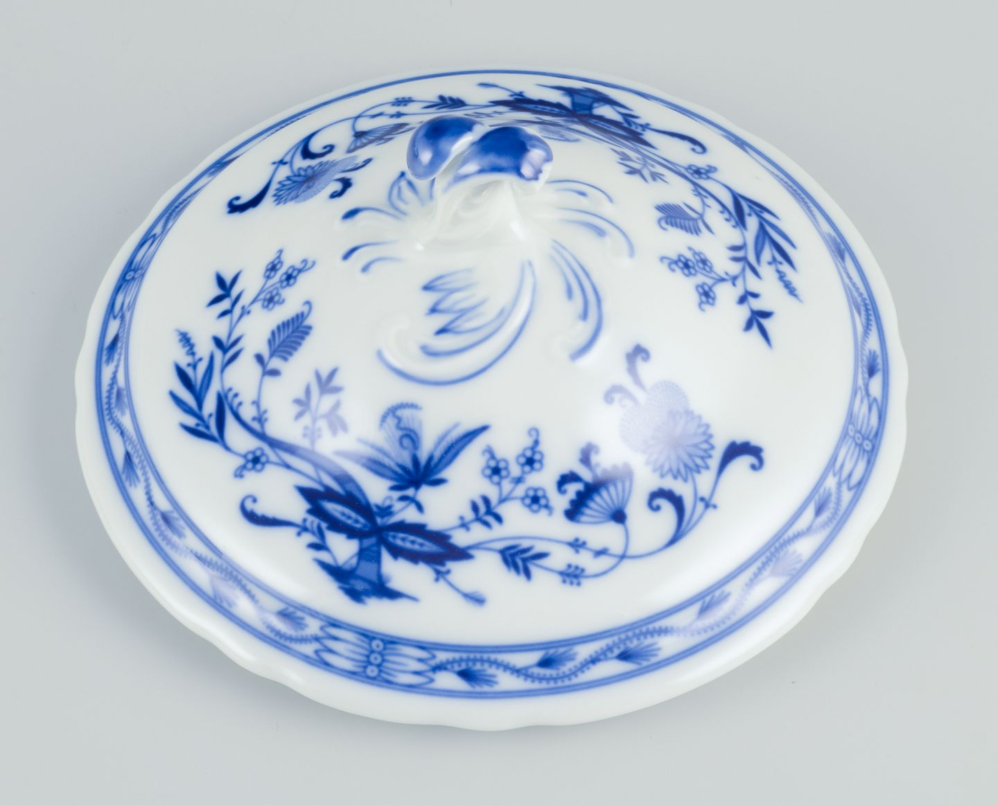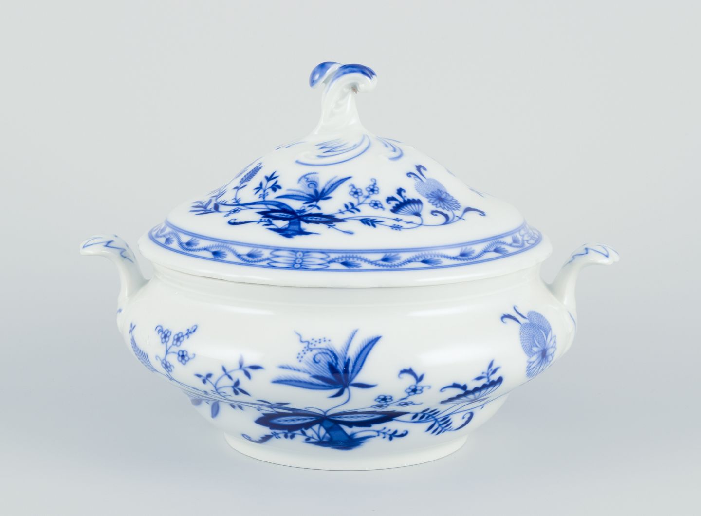 Lågterrin i porcelæn. Løgmønstret dekoration. Ca. Tyskland, 1930/40’erne. Stemplet ”Bavaria Germany” I perfekt stand. Fremstår ubrugte. Mål: D 26,0 cm. x H 19,0 cm.