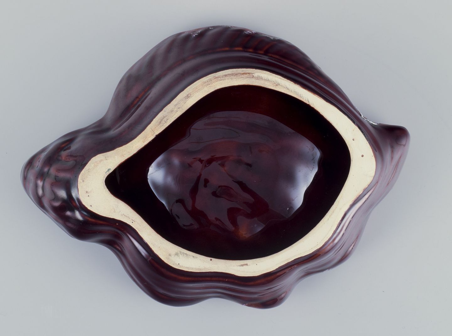 Vallauris, Frankrig, snegleformet skål af stentøj med glasur i lyserøde og brune nuancer.