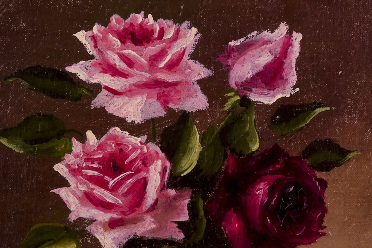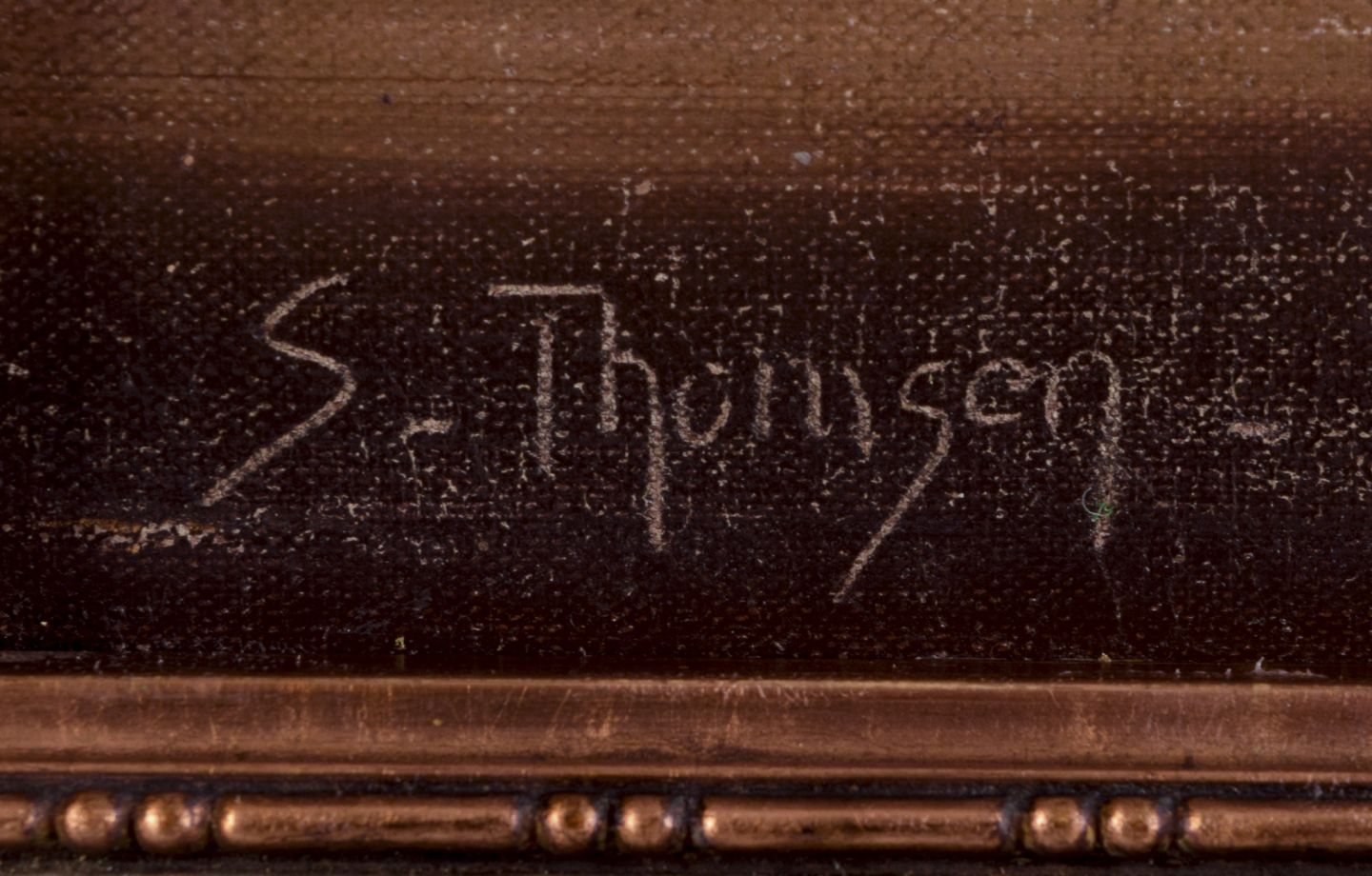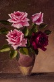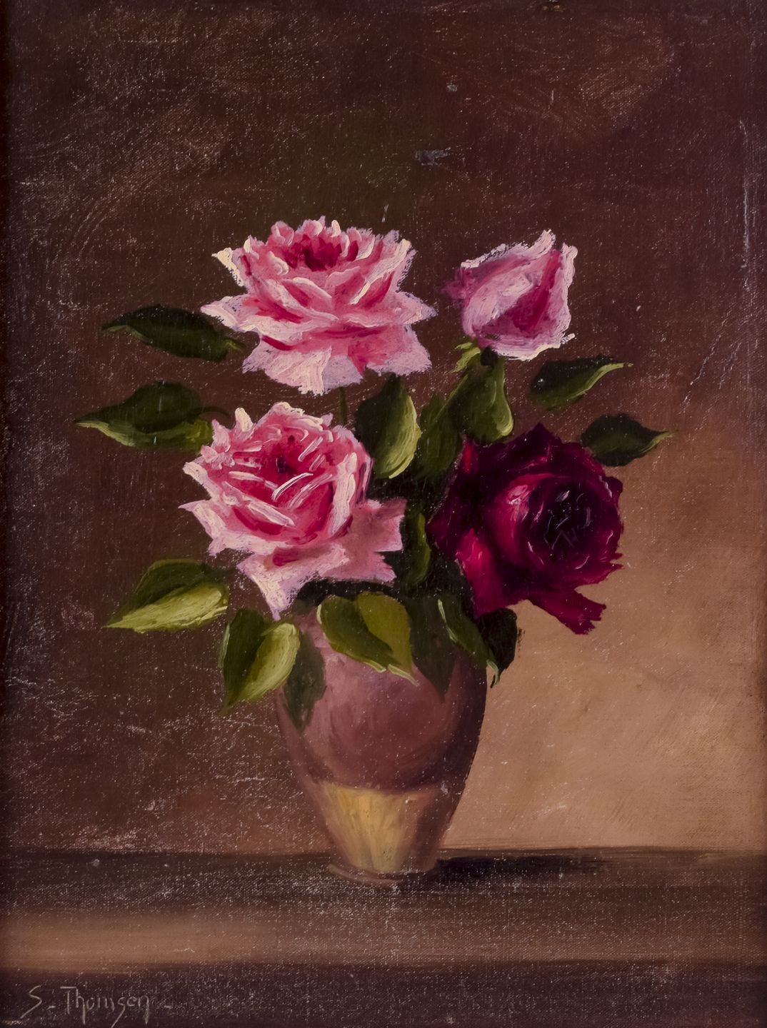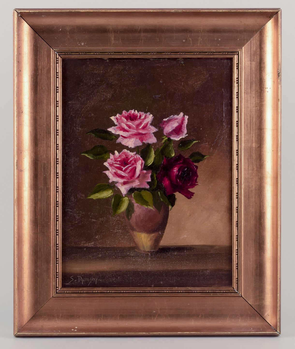 Dansk maler. Olie på træ. Roser i vase. Sent 1800-tallet. Signeret S. Thomsen. Fremstår i god stand med slid i malingen. Håndforgyldt træramme. Mål: B 24,0 cm. x H 32,5 cm. Totalmål: B 37,5 cm. x H 46,0 cm.