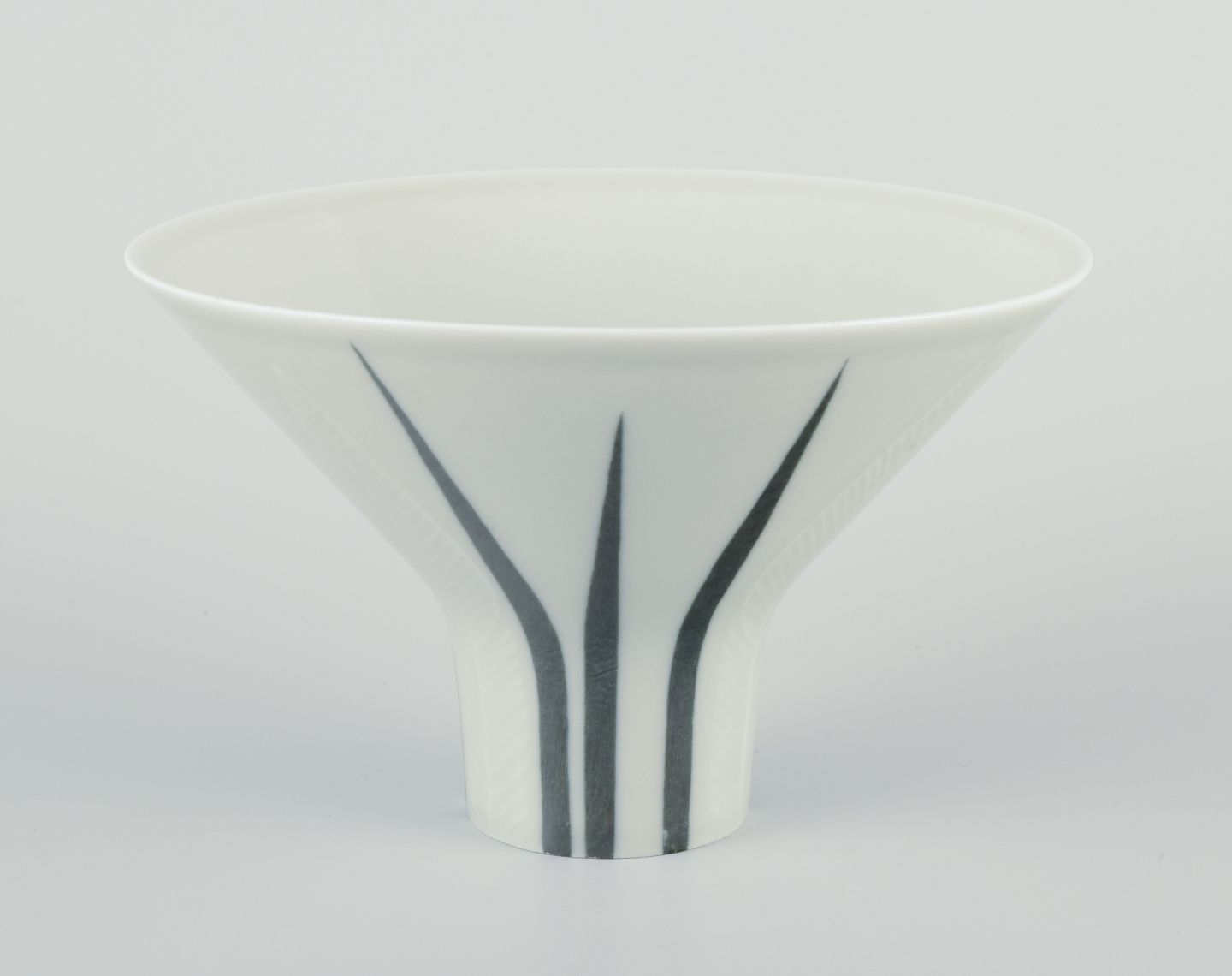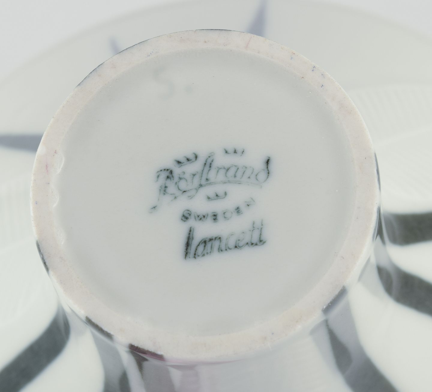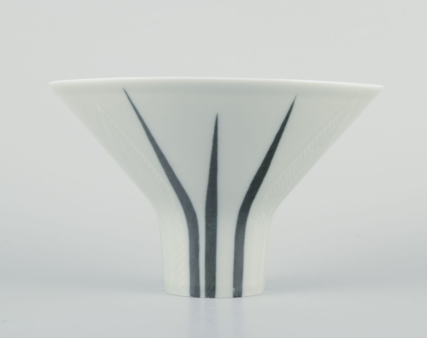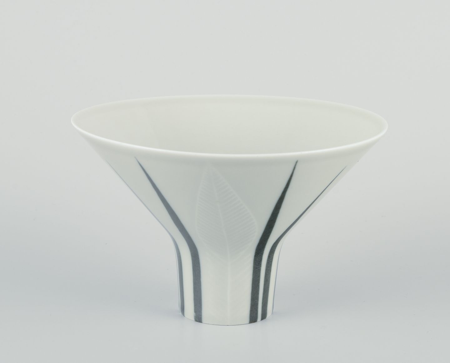 Rörstrand ”Lancett” vase af porcelæn. Underglasur. Modernistisk design. Blomstermotiv. Midt 1900-talllet. Stemplet. I flot stand. Mål: D 14,0 cm. x H 9,0 cm.