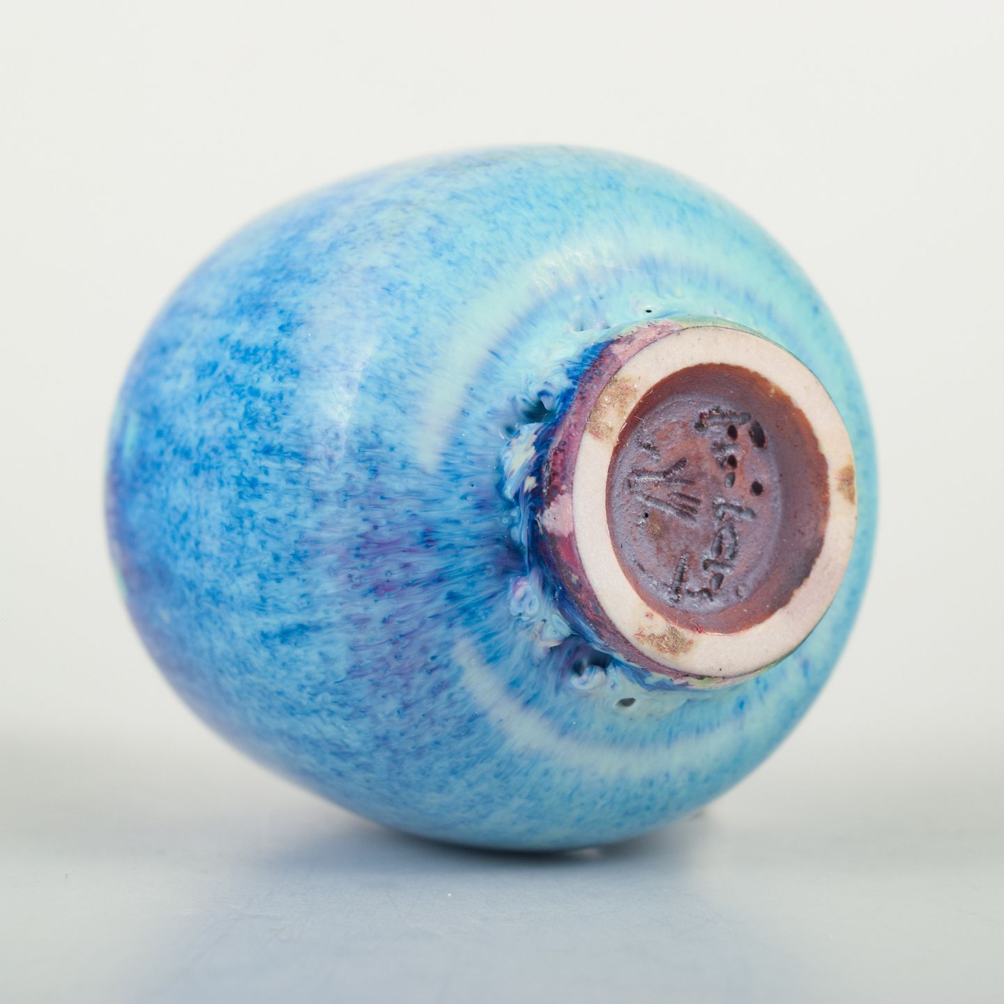 Smuk, hånddrejet miniaturevase af Berndt Friberg (1899–1981), udført for Gustavsberg, Sverige. Glasuren fremstår i den karakteristiske, fine hare’s fur-teknik med overvejende blå nuancer, tilsat lette toner af grøn og brun, som giver dybde og spil i overfladen. Elegant, klassisk form som kendetegner Fribergs unikke fornemmelse for proportioner og glasurarbejde.