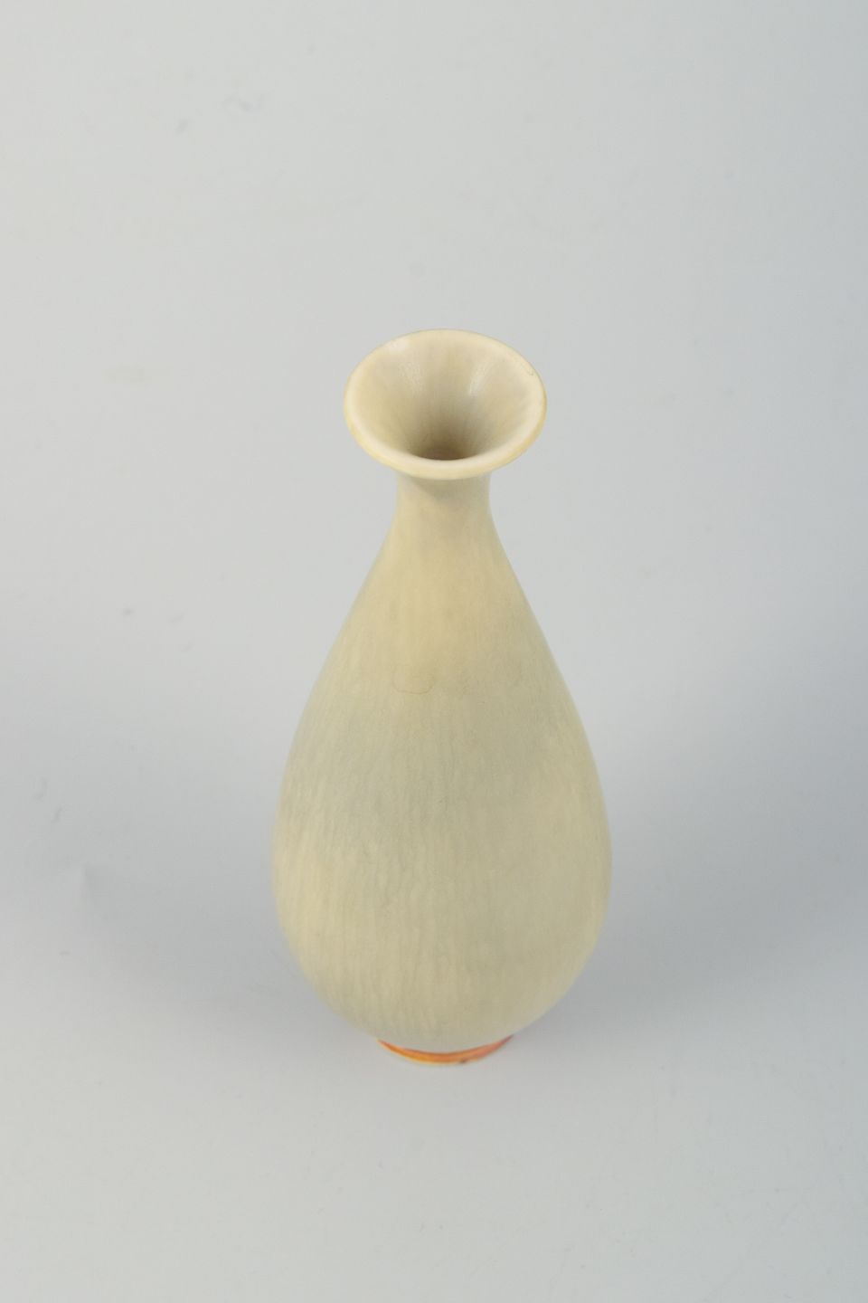 Lille, elegant vase af stentøj, udført som studio hand af Berndt Friberg i hans atelier for Gustavsberg, Sverige, midt i 1900-tallet. Smukt glaseret i lyse, afdæmpede nuancer med fint spil i overfladen. Den slanke, dråbeformede silhuet afspejler Fribergs særlige sans for proportioner og enkelhed.