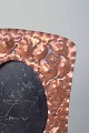 To dekorative billedrammer i præget kobber med blomstermotiver og oval åbning. Bagside med støttefod til placering på bord.