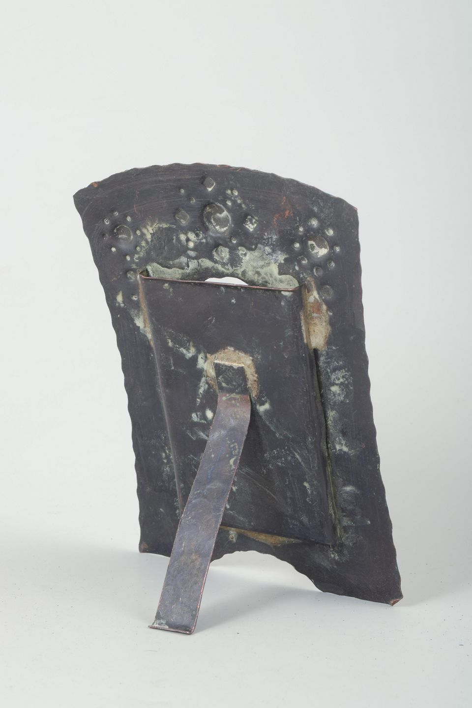 Håndhamret kobberramme med ovalt midterfelt, dekoreret med plastiske, geometriske ornamenter. Bagsiden med original støttefod. Et dekorativt og tidstypisk eksempel på jugendstilens organiske formsprog.