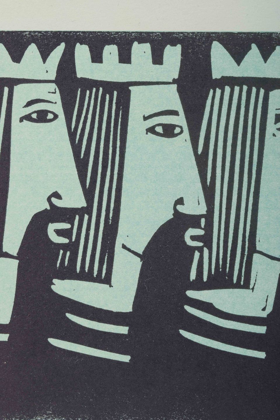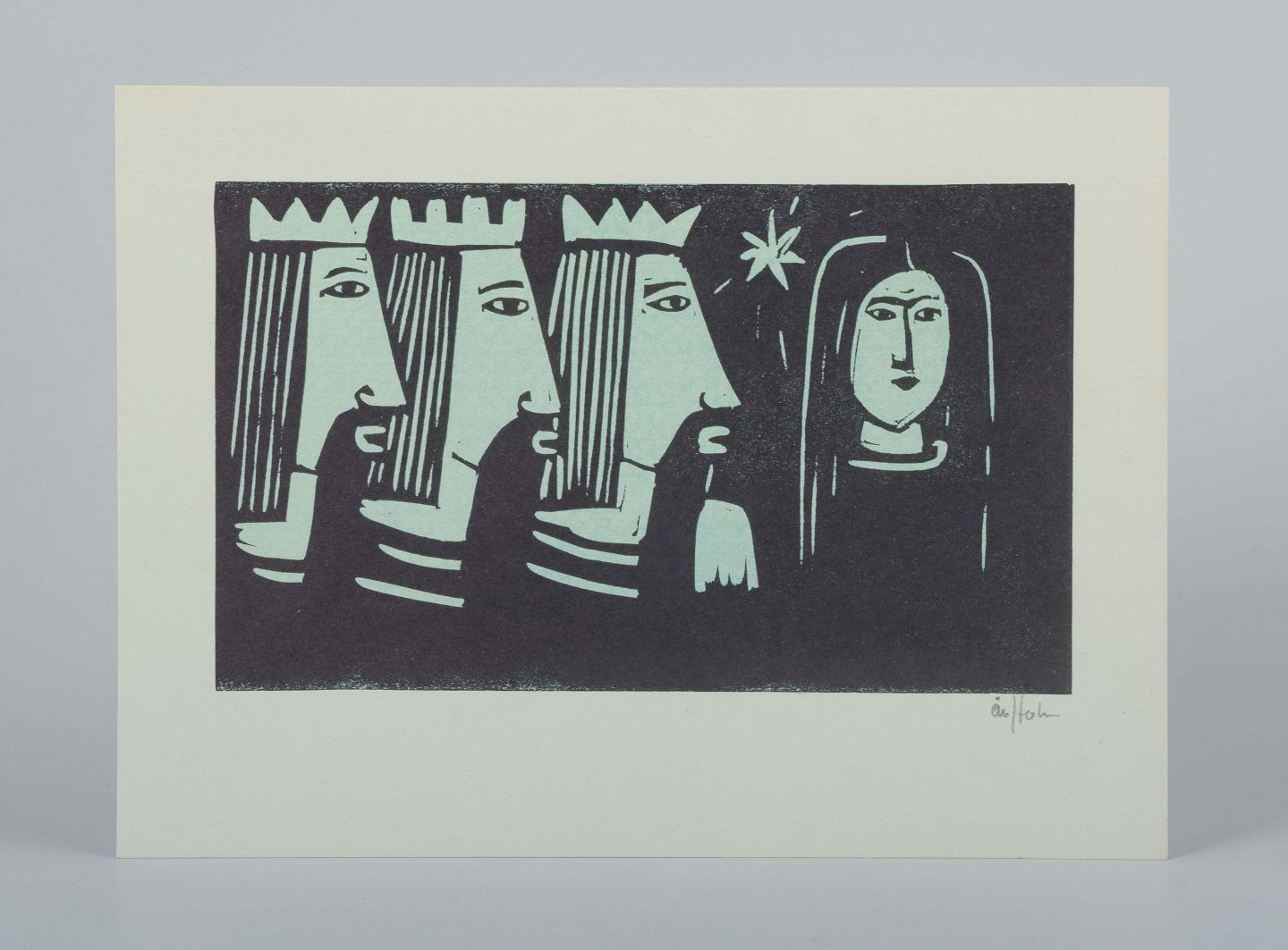 Sort-hvidt træsnit med motiv af de tre vise mænd, der står foran Jomfru Maria under stjernen. Figurerne er holdt i en stram, dekorativ form med enkle linjer og stærkt grafisk udtryk, typisk for Åke Holms religiøse billedverden.