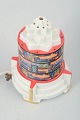 Art Deco duftlampe i porcelæn med geometrisk form. Dekoreret med farverigt, arkitektur- og landskabsinspireret mønster i stærke nuancer af orange, blå, rød og sort. Basen med hvid glasur og detaljer i forgyldning. Elektrisk fatning under bunden.