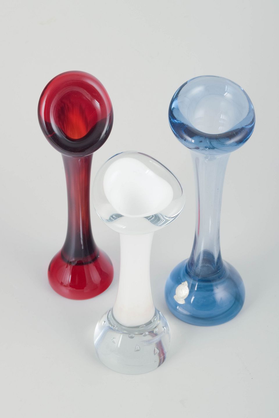 Et sæt skulpturelle glasvaser fra henholdsvis Mantorp Glasbruk og Skånska Glasbruket, Sverige, fremstillet ca. 1969. Vaserne er kendetegnet ved den tunge fod, den slanke hals og den organiske åbning i dråbeform. Klassiske eksempler på skandinavisk glaskunst fra perioden.