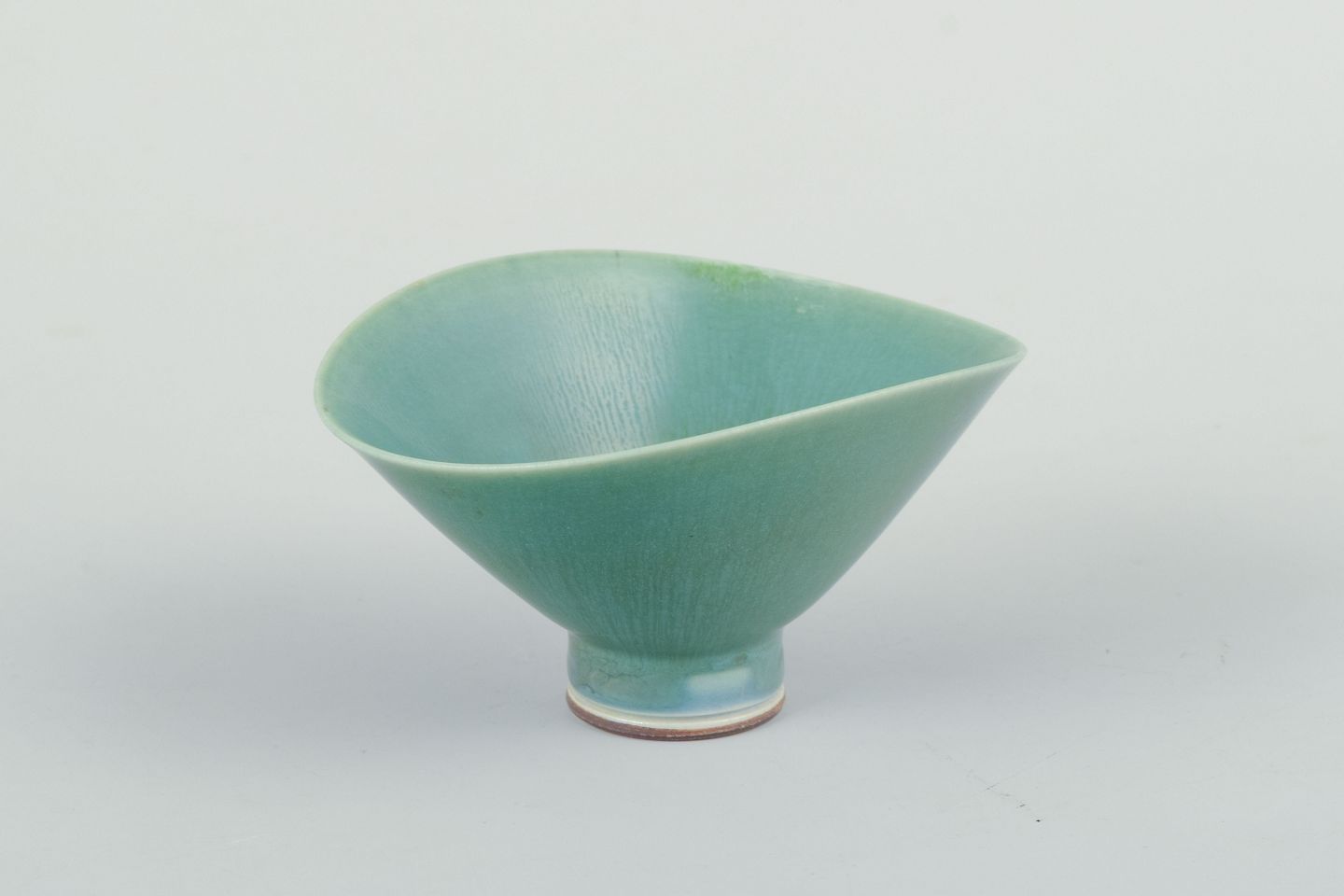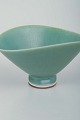Drejet skål i stentøj med asymmetrisk form og grønlig/turkis glasur med fine nuanceringer. Indridset signatur Friberg, Gustavsberg.