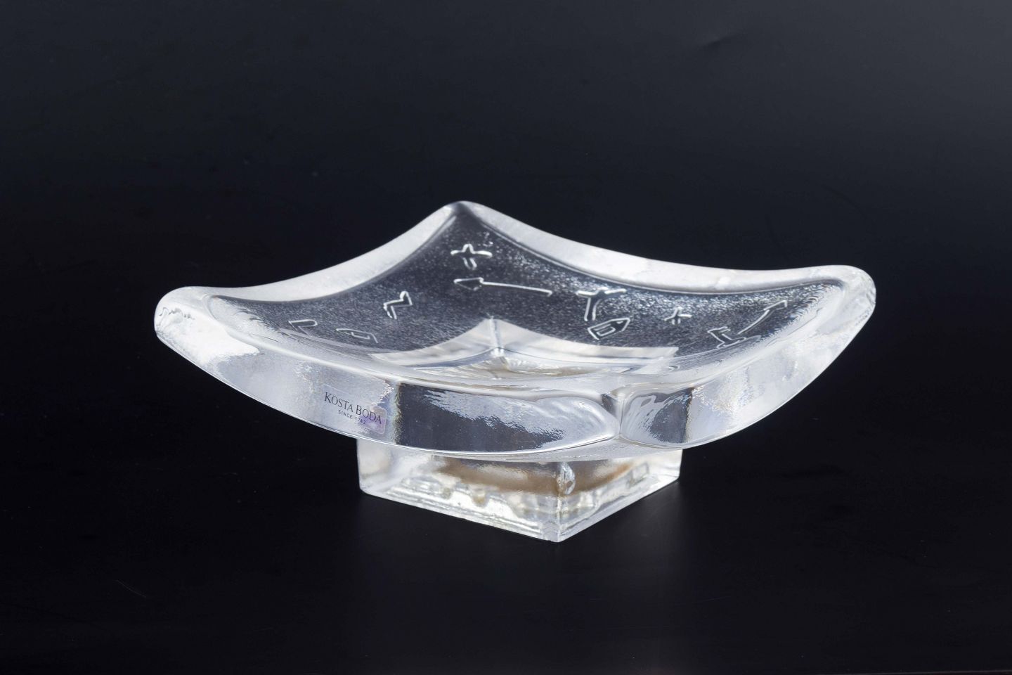 Rektangulær "Domino" glasskål med svungne hjørner, transparent glas med indgraverede symboler og figurer.