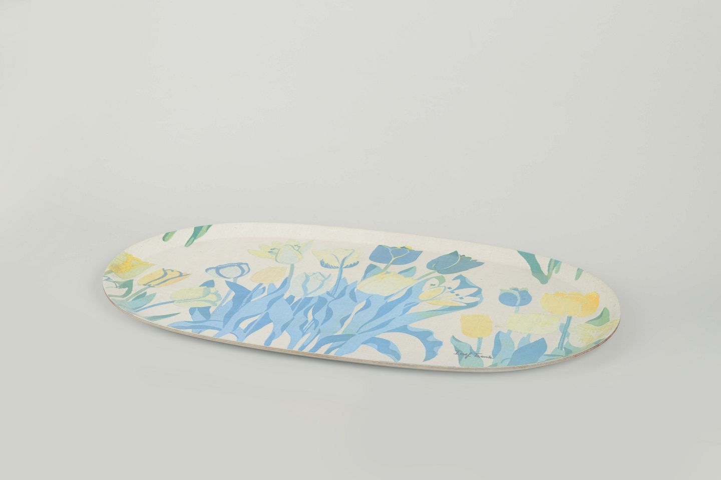 Oval serving tray in molded wood with laminated surface. Decorated with Josef Frank’s iconic floral motif in shades of blue, green, and yellow.