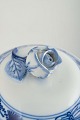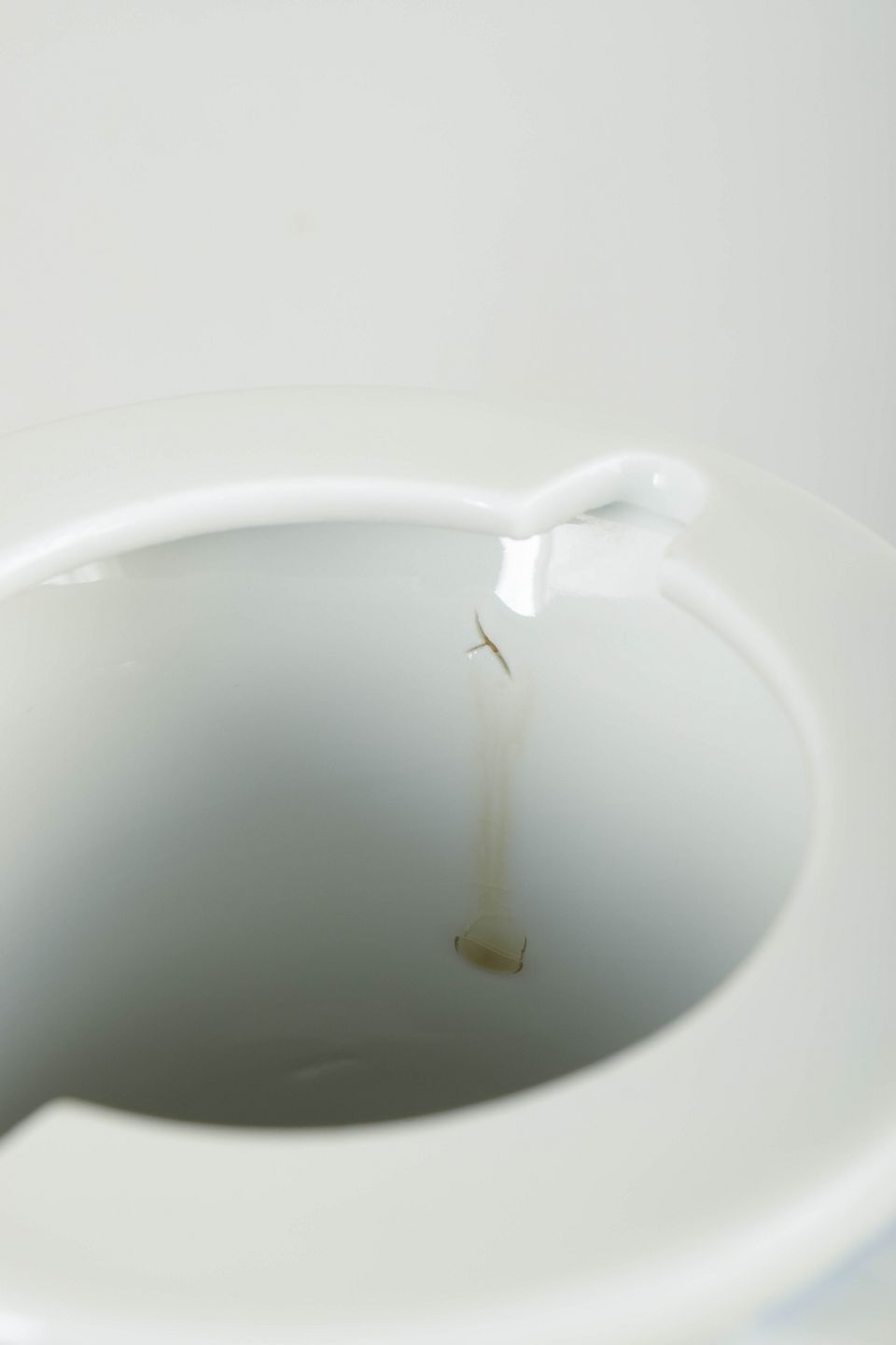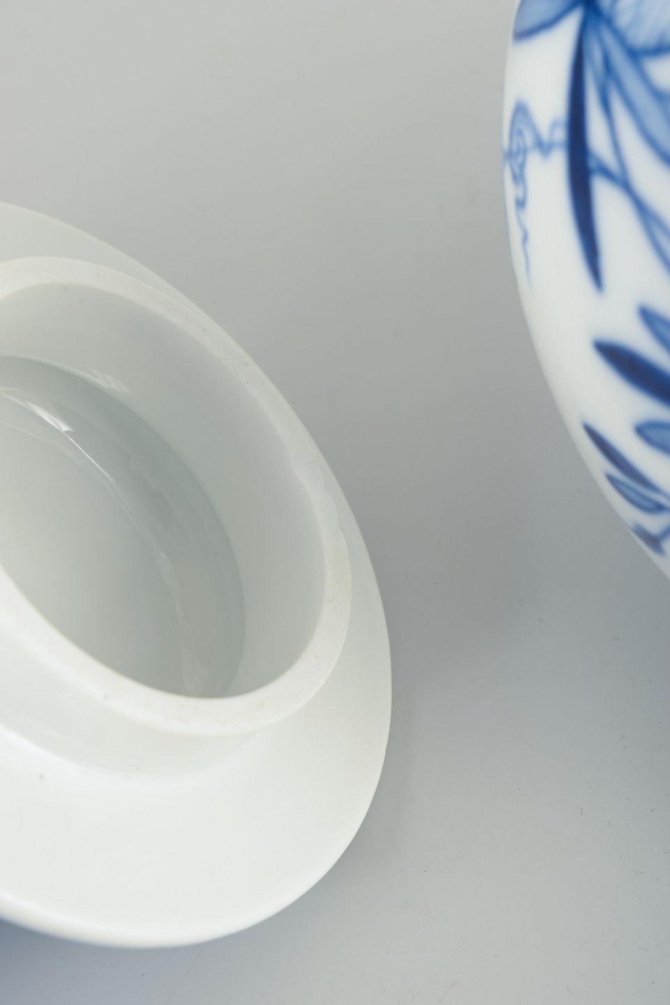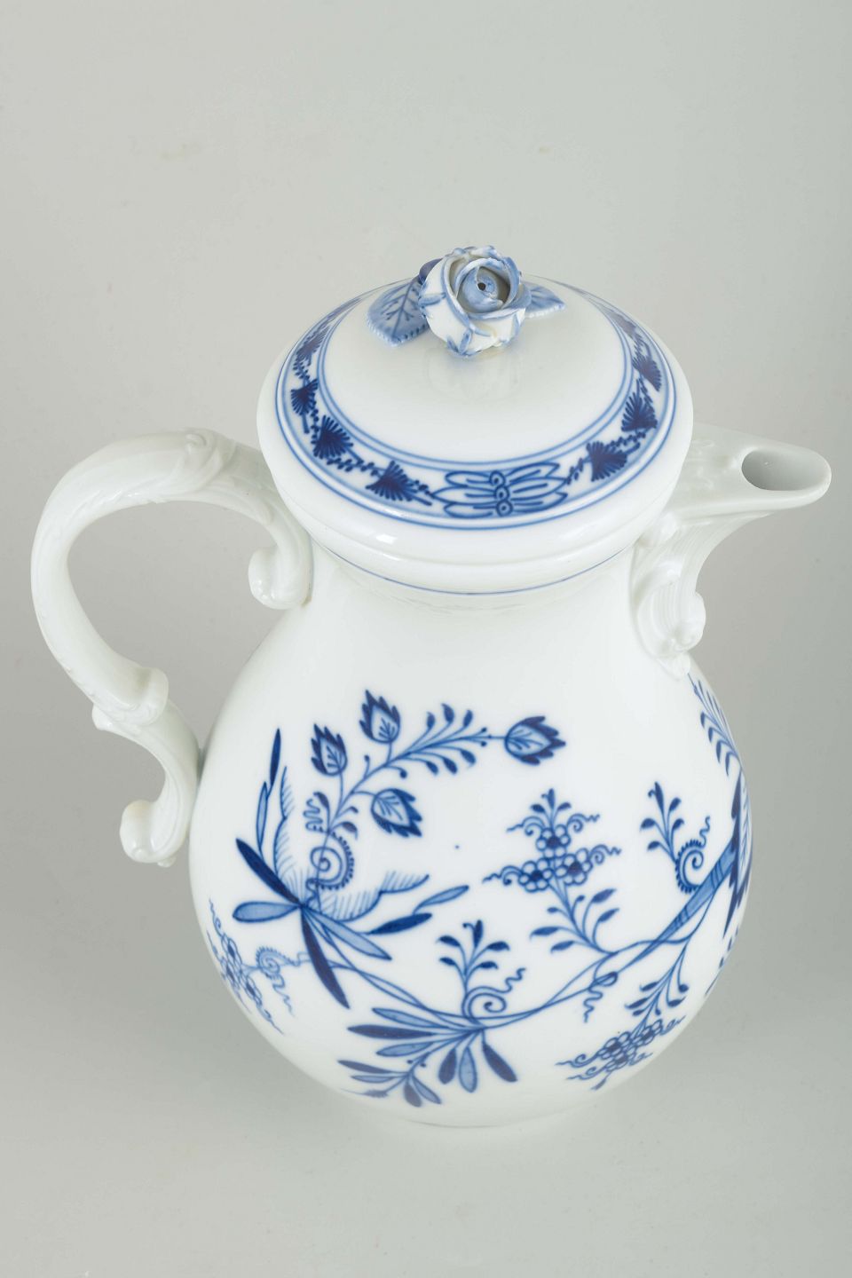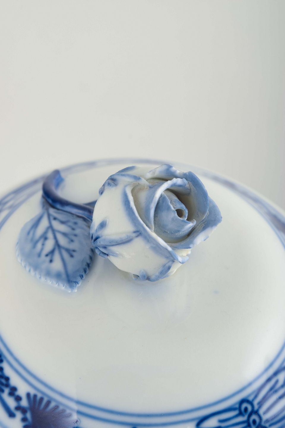 Organic-shaped lidded jug in white porcelain with underglaze blue decoration in the classic “Zwiebelmuster” (onion pattern). The lid is topped with a naturalistically modelled porcelain rose in blue and white.