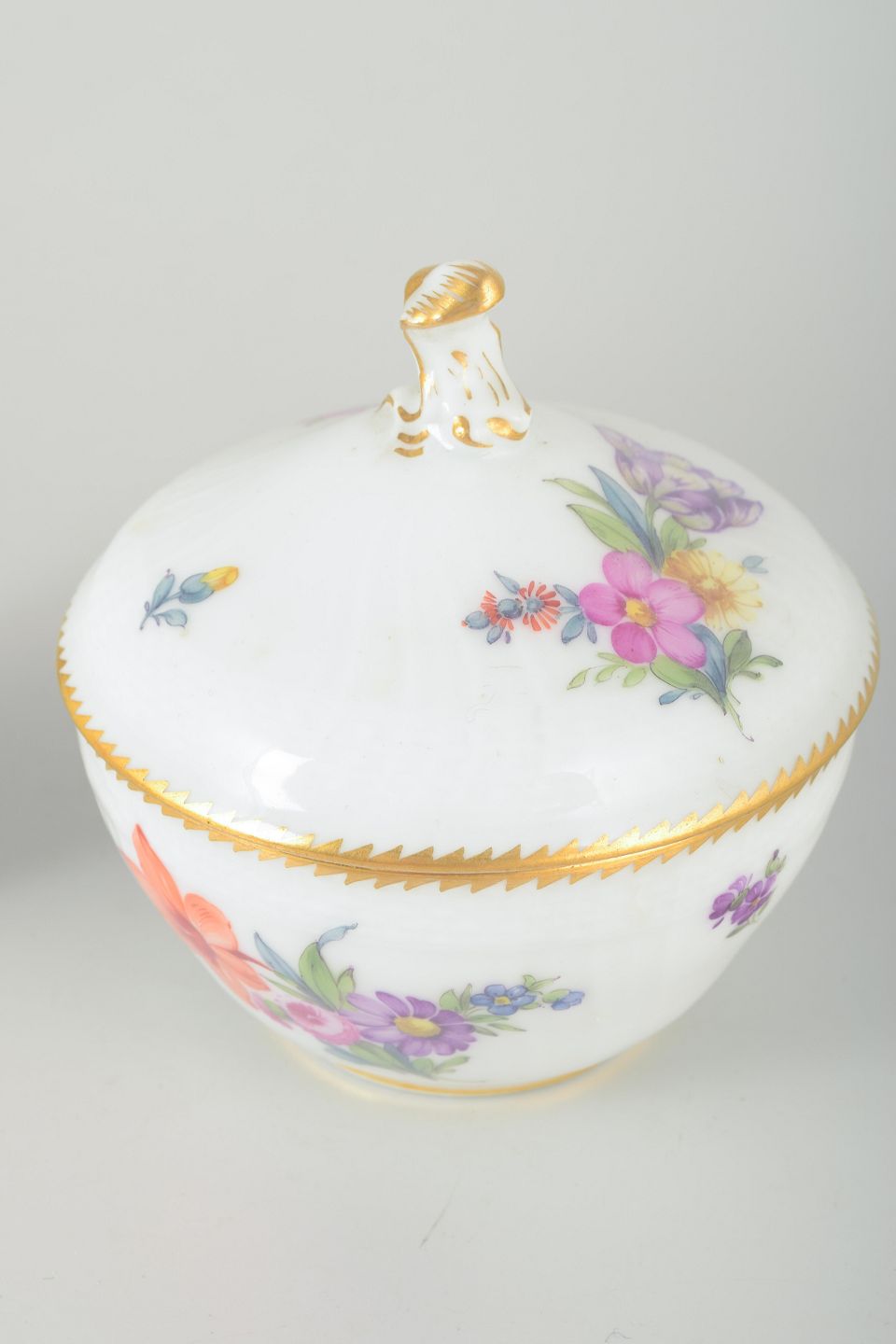 Porcelænssæt bestående af sukkerskål med låg og flødekande, begge dekoreret med håndmalede blomster i det klassiske “Sachsisk Blomst” mønster og guldkant.