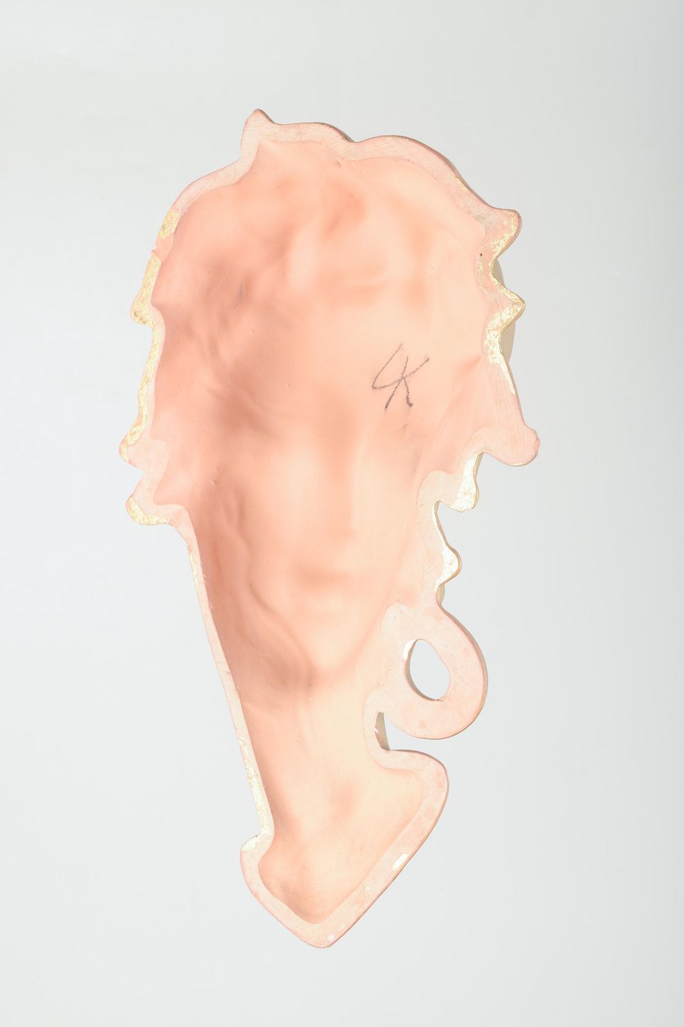 Dekorativt vægrelief i terrakotta, formet som et stiliseret kvindehoved med store øjne, bølget hår og ringformet ørering. Overfladen er bemalet med gylden dekor. Signeret.