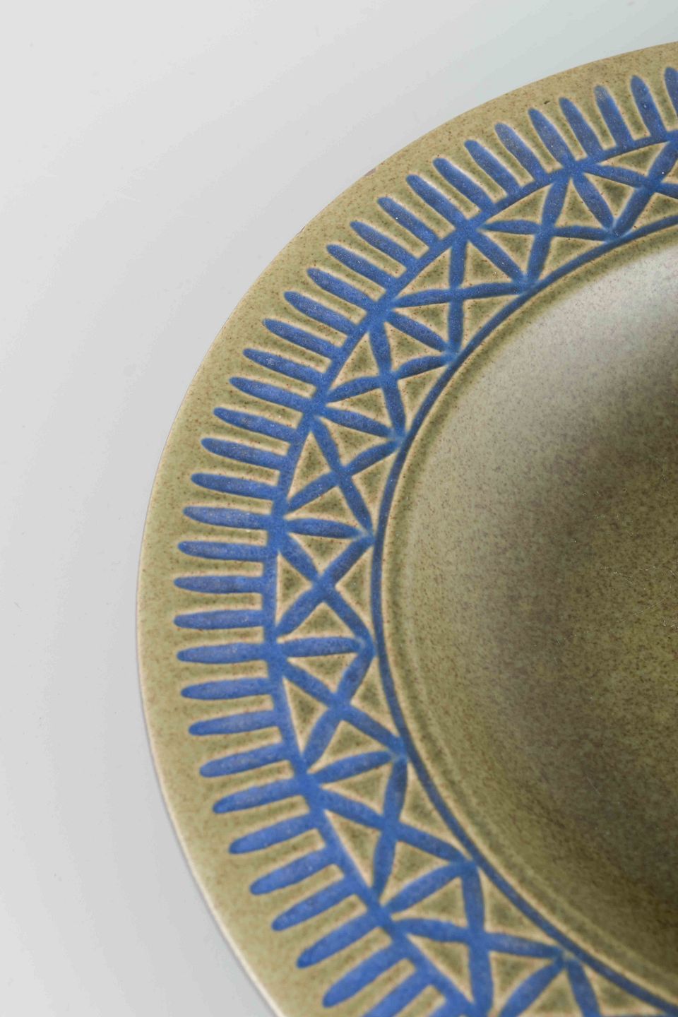 Dekorativ skål i stentøj med olivengrøn glasur og geometrisk reliefdekoration i blå og sandfarvede toner omkring randen.