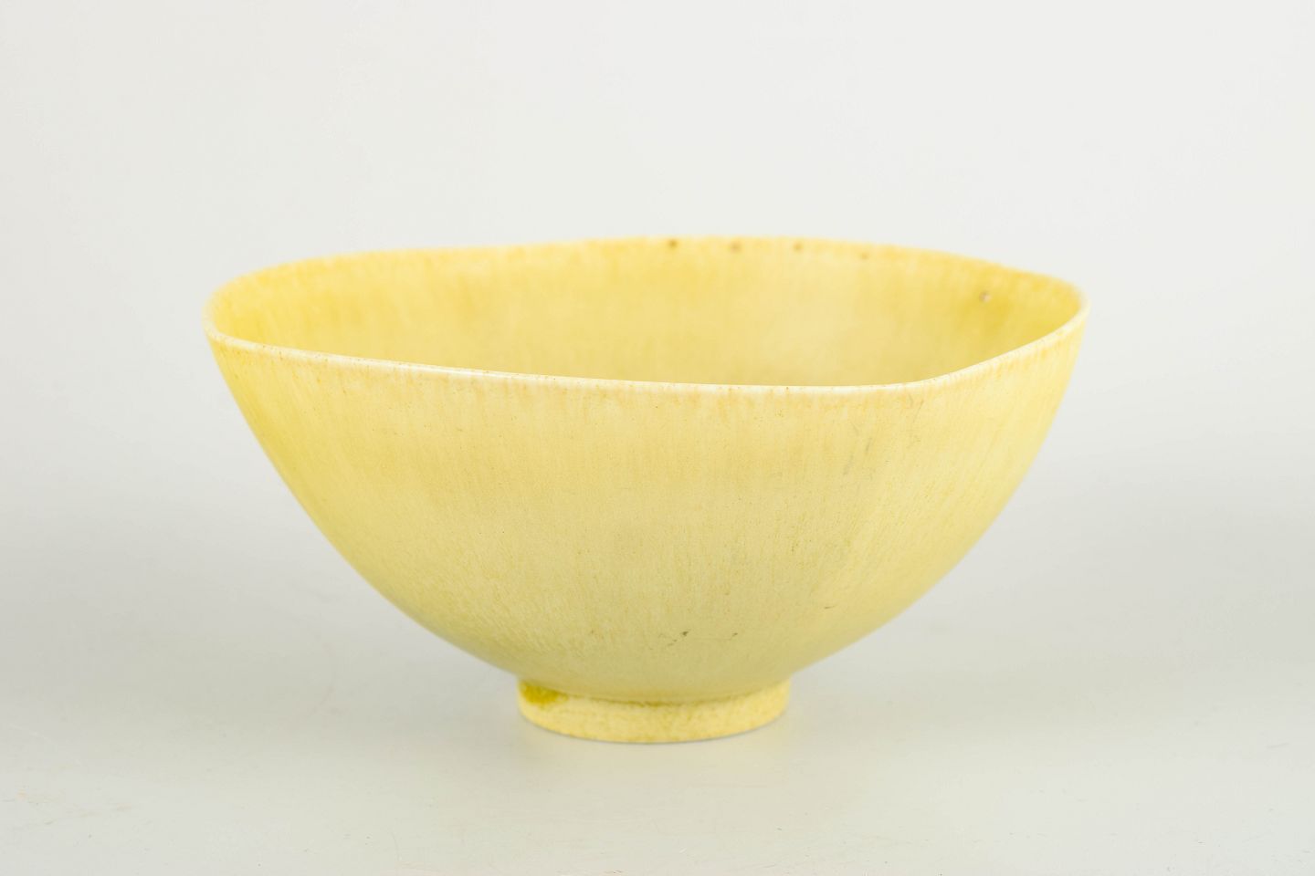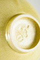 Hånddrejet lille stentøjsskål med elegant, afrundet form og karakteristisk varm gul tennglasur. Fin Friberg-typisk mikro-glasur tekstur med små glasurblærer (se foto).