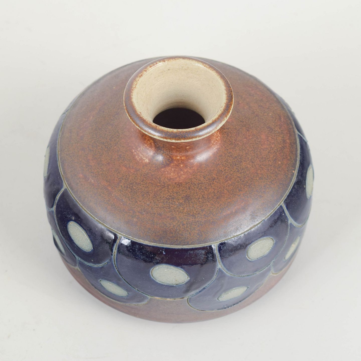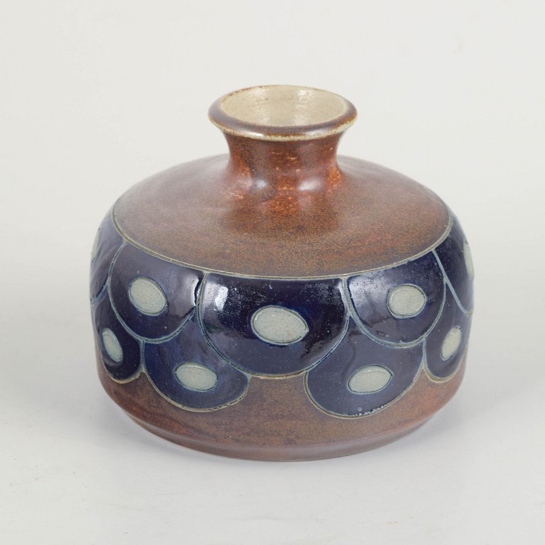 Unique handmade stoneware vase with a rounded body, short neck and a decorative band in deep blue with light oval elements.